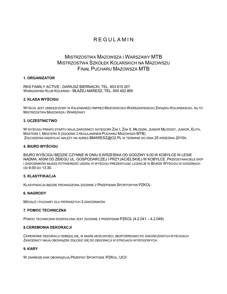 REGULAMIN MISTRZOSTWA MAZOWSZA I WARSZAWY MTB MISTRZOSTWA SZKÓŁEK KOLARSKICH NA MAZOWSZU FINAŁ PUCHARU MAZOWSZA MTB 1. ORGANIZATOR RKS FAMILY ACTIVE - DARIUSZ BIERNACKI, TEL. 603 615 207 W ARSZAWSKI KLUB KOLARSKI - BŁAŻEJ MARESZ, TEL. 600 452 865 2. KLASA WYŚCIGU W YŚCIG JEST UMIESZCZONY W KALENDARZU IMPREZ MAZOWIECKO-W ARSZAWSKIEGO ZWIĄZKU KOLARSKIEGO, SĄ TO MISTRZOSTWA MAZOWSZA I W ARSZAWY 3. UCZESTNICTWO W WYŚCIGU PRAWO STARTU MAJĄ ZAWODNICY KATEGORII ŻAK I, ŻAK II, MŁODZIK, JUNIOR MŁODSZY, JUNIOR, ELITA, MASTERS I, MASTERS II (ZGODNIE Z REGULAMINEM PUCHARU MAZOWSZA MTB) ZGŁOSZENIA NADSYŁAĆ NALEŻY NA ADRES [email protected] W TERMINIE DO DNIA 25 WRZEŚNIA 2015R. 4. BIURO WYŚCIGU BIURO WYŚCIGU BĘDZIE CZYNNE W DNIU 6 WRZEŚNIA OD GODZINY 9.00 W KOBYŁCE W LESIE NADMA, 400M OD ZBIEGU UL. GOSPODARCZEJ I PRZYJACIELSKIEJ W KOBYŁCE. PRZEDSTAWICIELE EKIP I ZAWODNIKÓW MUSZĄ POTWIERDZIĆ UDZIAŁ W WYŚCIGU PREZENTUJĄC LICENCJE W BIURZE W YŚCIGU W GODZINACH OD 9.00 DO 13.30. 5. KLASYFIKACJA KLASYFIKACJA BĘDZIE PROWADZONA ZGODNIE Z PRZEPISAMI SPORTOWYMI PZKOL: 6. NAGRODY MEDALE I PUCHARY DLA PIERWSZYCH 3 ZAWODNIKÓW 7. POMOC TECHNICZNA POMOC TECHNICZNA DOZWOLONA JEST ZGODNIE Z PRZEPISAMI PZKOL (4.2.041 – 4.2.049) 8.CEREMONIA DEKORACJI CEREMONIE DEKORACJI ODBĘDĄ SIĘ, W MIARĘ MOŻLIWOŚCI, BEZPOŚREDNIO PO ZAKOŃCZONYCH WYŚCIGACH ZAWODNICY MAJĄ OBOWIĄZEK ZGŁOSIĆ SIĘ DO DEKORACJI W STROJACH WYŚCIGOWYCH. 9. KARY W ZAKRESIE KAR OBOWIĄZUJĄ PRZEPISY SPORTOWE /PZKOL, UCI/ 10. PROGRAM MINUTOWY – 09:00 start imprezy, zgłaszanie uczestników w biurze zawodów – 10.00 start kategorii: żak I i II, żaczka I i II - 10:40 start kategorii: juniorka młodsza, młodzik, młodziczka – 11.30 start kategorii junior młodszy, masters II, kobiety elita, juniorka – 12:30 start kategorii junior, masters I – 14.00 start kategorii orlik, elita 11. ZASADY FINANSOWANIA OPŁATY STARTOWE ZGODNE Z PRZEPISAMI PZKOL 12. SKŁAD KOMISJI SĘDZIOWSKIEJ W YZNACZA MAZOWIECKO - W ARSZAWSKI ZWIĄZEK KOLARSKI 13. KONTROLA ANTYDOPINGOWA PODCZAS WYŚCIGU OBOWIĄZUJĄ PRZEPISY ANTYDOPINGOWE UCI I PZKOL. 14. WYKAZ SZPITALI NA W POBLIŻU TRASY POWIATOWY SZPITAL: WOŁOMIN UL. GDYŃSKA 1/3 15. WYNIKI ORGANIZATORZY SĄ ZOBOWIĄZANI DO NIEZWŁOCZNEGO UMIESZCZENIA ZATWIERDZONYCH PRZEZ SĘDZIÓW WYNIKÓW Z ZAWODÓW, NA STRONIE PUCHARMAZOWSZA.PL W YNIKI ZOSTANĄ RÓWNIEŻ OPUBLIKOWANE NA STRONIE MWZKOL.PL 16. POSTANOWIENIA KOŃCOWE DECYZJA CZY STOSOWANY BĘDZIE PRZEPIS 80% DLA XCO PODEJMUJE SĘDZIA GŁÓWNY PO UZGODNIENIACH Z ORGANIZATOREM KOLEJNOŚĆ USTAWIENIA ZAWODNIKÓW NA STARCIE WYZNACZY LOSOWANIE PODCZAS ODPRAWY TECHNICZNEJ. W E WSZYSTKICH SPRAWACH NIE OBJĘTYCH REGULAMINEM DECYDUJE SĘDZIA GŁÓWNY W POROZUMIENIU Z ORGANIZATOREM WYŚCIGU.