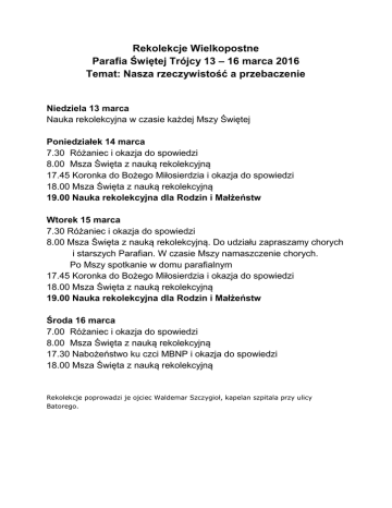 Rekolekcje Wielkopostne Parafia Świętej Trójcy 13 – 16 marca 2016 Temat: Nasza rzeczywistość a przebaczenie Niedziela 13 marca Nauka rekolekcyjna w czasie każdej Mszy Świętej Poniedziałek 14 marca 7.30 Różaniec i okazja do spowiedzi 8.00 Msza Święta z nauką rekolekcyjną 17.45 Koronka do Bożego Miłosierdzia i okazja do spowiedzi 18.00 Msza Święta z nauką rekolekcyjną 19.00 Nauka rekolekcyjna dla Rodzin i Małżeństw Wtorek 15 marca 7.30 Różaniec i okazja do spowiedzi 8.00 Msza Święta z nauką rekolekcyjną. Do udziału zapraszamy chorych i starszych Parafian. W czasie Mszy namaszczenie chorych. Po Mszy spotkanie w domu parafialnym 17.45 Koronka do Bożego Miłosierdzia i okazja do spowiedzi 18.00 Msza Święta z nauką rekolekcyjną 19.00 Nauka rekolekcyjna dla Rodzin i Małżeństw Środa 16 marca 7.00 Różaniec i okazja do spowiedzi 8.00 Msza Święta z nauką rekolekcyjną 17.30 Nabożeństwo ku czci MBNP i okazja do spowiedzi 18.00 Msza Święta z nauką rekolekcyjną Rekolekcje poprowadzi je ojciec Waldemar Szczygioł, kapelan szpitala przy ulicy Batorego.