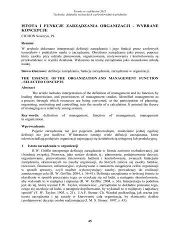 Trendy ve vzdělávání 2012 Technika, didaktika technických a přírodovědných předmětů ISTOTA I FUNKCJE ZARZĄDZANIA ORGANIZACJI - WYBRANE KONCEPCJE CICHOŃ Seweryn, PL Resumé W artykule dokonano interpretacji definicji zarządzania i jego funkcji przez czołowych teoretyków i praktyków nauki o zarządzaniu. Określono zarządzanie jako proces, poprzez który zasoby przy udziale planowania, organizowania, motywowania i kontrolowania są przekształcane w wyniki działania. Wskazano na teorię zarządzania jako stosunkowo młodą naukę. Słowa kluczowe: definicje zarządzania, funkcje zarządzania, zarządzanie w organizacji. THE ESSENCE OF THE ORGANIZATION AND MANAGEMENT FUNCTION - SELECTED CONCEPTS Abstract The article includes interpretation of the definition of management and its function by leading theoreticians and practitioners of management studies. Identified management as a process through which resources are being converted, at the participation of planning, organizing, motivating and controlling, into the results of a calculation. It pointed the theory of managing as a relatively young science. Key words: definition in organization. of management, function of management, management Wprowadzenie Pojęcie zarządzania nie jest pojęciem jednorodnym, znalezienie jednej ogólnej definicji nie jest możliwe. W literaturze istnieje wiele definicji zarządzania, które odzwierciedlają podejście organizacji zajmującej się działalnością usługową lub produkcyjną. Istota zarządzania w organizacji R.W. Griffin interpretuje definicję zarządzania w formie zarówno rozbudowanej, jak i bardziej zwięzłej. Pierwsza, jako zestaw działań, tj.: planowanie, podejmowanie decyzji, organizowanie, przewodzenie (kierowanie ludźmi) i kontrolowanie, zwanych funkcjami zarządzania, skierowanych na zasoby organizacji, do których zalicza się zasoby ludzkie, rzeczowe, finansowe, informacyjne, wykonywane z zamiarem osiągnięcia celów organizacji w sposób sprawny, czyli mądrze wykorzystujący zasoby, prowadzący do realizacji zamierzonego celu (R. W. Griffin: 2004, s. 36-41). Definicja zarządzania w krótszej formie to określenie w sposób precyzyjny tego, co oczekuje się od ludzi, a następnie skontrolowanie, aby wykonali to w najlepiej i najtaniej (R. W. Griffin: 2004, s. 36). Interpretacja ta podobna jest do tej, którą wysnuł F.W. Taylor, mianowicie: „zarządzanie to dokładne poznanie tego, czego się oczekuje od ludzi, a następnie dopilnowanie, by wykonali to w najlepszy i najtańszy sposób” (F. W. Taylor: 1903, s. 21). J.A.F. Stoner, Ch. Wankel podkreślają, jak ważna jest teoria zarządzania i jej zasady w kierowaniu całą organizacją, by skutecznie działać i podejmować decyzje osobie nadzorującej (J. M. S. Stoner: 1997, s. 45). 1 45 Trendy ve vzdělávání 2012 Technika, didaktika technických a přírodovědných předmětů Funkcje zarządzania w organizacji Funkcje zarządzania określił H. Fayol, poprzez ujęcie ich w sześć grup (H. Fayol: 1947, s. 33 - 37): - czynności techniczne: produkcja, przeróbka, - czynności handlowe: kupno, sprzedaż, wymiana, - czynności finansowe: poszukiwanie kapitałów i obroty nimi, - czynności ubezpieczeniowe: ochrona majątku, osób, - czynności związane z rachunkowością: inwentaryzacja, bilans, ustalanie cen, statystyka, - czynności administracyjne: przewidywanie, organizowanie, rozkazodawstwo, koordynacja, kontrola. 2 Ostatnią z grup funkcji zarządzania H. Fayol interpretuje jako czynności organizacyjne, gdzie: - przewidywanie, oznacza badanie przyszłości i ustalanie stosownie do niej programu działania, - organizowanie, określa powołanie do życia podwójnego organizmu przedsiębiorstwa: materialnego i społecznego, - rozkazywanie, spowodowane jest funkcjonowaniem kadry pracowniczej, - koordynowanie, łączenie jednocześnie wszystkich wysiłków, - kontrolowanie, czuwanie nad tym, aby wszystko odbywało się zgodnie z ustalonymi przepisami i rozkazami. T.J. Peters i R.H. Waterman w nieco inny sposób sformułowali osiem zasad zarządzania organizacją (T. J. Peters, R. H. Waterman: 2000, s. 23): - skłonność do działania: raczej robić coś, cokolwiek, niż poddać zagadnienie kolejnym cyklom analiz i sprawozdań komisji, - trzymanie się blisko klienta, poznanie jego preferencji i zaspokojenie ich, - autonomia i przedsiębiorczość: podział koncernu na wiele małych, filialnych przedsiębiorstw oraz zachęcanie ich do samodzielności i konkurencyjności, - wydajność dzięki ludziom: wytworzenie u wszystkich pracowników świadomości, że ich możliwie dobra praca ma zasadnicze znaczenie i że będą mieli udział w korzyściach, wynikających z sukcesu firmy, - bezpośredni kontakt, motywacja przez wartość - naleganie, by kierownicy trzymali się blisko podstawowej działalności firmy, - trzymanie się swojej specjalności: firma powinna prowadzić działalność w dziedzinie, na której zna się najlepiej, - prosta struktura, nieliczny sztab, niewiele szczebli zarządzania, niewielu ludzi na wyższych szczeblach, - jednoczesna dyscyplina i swoboda; tworzenie klimatu, w którym oddaniu podstawowym wartościom firmy towarzyszy tolerancja wobec wszystkich pracowników, którzy przyjmują te wartości za swoje. Zarządzanie jako proces S.P. Robbins i D.A. DeCenzo określają zarządzanie (S.P. Robbins, D.A. DeCenzo: 2002, s. 32) jako proces, (zob. rys. 1), w wyniku którego następuje wykonanie określonych rzeczy, sprawnie, skutecznie, wspólnie z innymi ludźmi i przez nich. Podkreśla się tu przekształcanie zasobów (osobowych, finansowych, materiałowych, technologicznych, informacyjnych) przy udziale planowania, organizowania, motywowania i kontrolowania, 3 46 Trendy ve vzdělávání 2012 Technika, didaktika technických a přírodovědných předmětů w wyniki (zamierzone i osiągnięte cele, wyroby, usługi, sprawność, skuteczność, efektywność, rozwój). W zar