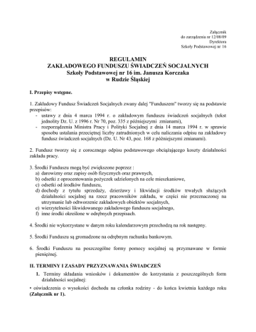 Załącznik do zarządzenia nr 12/08/09 Dyrektora Szkoły Podstawowej nr 16 REGULAMIN ZAKŁADOWEGO FUNDUSZU ŚWIADCZEŃ SOCJALNYCH Szkoły Podstawowej nr 16 im. Janusza Korczaka w Rudzie Śląskiej I. Przepisy wstępne. 1. Zakładowy Fundusz Świadczeń Socjalnych zwany dalej "Funduszem" tworzy się na podstawie przepisów: - ustawy z dnia 4 marca 1994 r. o zakładowym funduszu świadczeń socjalnych (tekst jednolity Dz. U. z 1996 r. Nr 70, poz. 335 z późniejszymi zmianami), - rozporządzenia Ministra Pracy i Polityki Socjalnej z dnia 14 marca 1994 r. w sprawie sposobu ustalania przeciętnej liczby zatrudnionych w celu naliczania odpisu na zakładowy fundusz świadczeń socjalnych (Dz. U. Nr 43, poz. 168 z późniejszymi zmianami). 2. Fundusz tworzy się z corocznego odpisu podstawowego obciążającego koszty działalności zakładu pracy. 3. Środki Funduszu mogą być zwiększone poprzez : a) darowizny oraz zapisy osób fizycznych oraz prawnych, b) odsetki z oprocentowania pożyczek udzielonych na cele mieszkaniowe, c) odsetki od środków funduszu, d) dochody z tytułu sprzedaży, dzierżawy i likwidacji środków trwałych służących działalności socjalnej na rzecz pracowników zakładu, w części nie przeznaczonej na utrzymanie lub odtworzenie zakładowych obiektów socjalnych, e) wierzytelności likwidowanego zakładowego funduszu socjalnego, f) inne środki określone w odrębnych przepisach. 4. Środki nie wykorzystane w danym roku kalendarzowym przechodzą na rok następny. 5. Środki Funduszu są gromadzone na odrębnym rachunku bankowym. 6. Środki Funduszu na poszczególne formy pomocy socjalnej są przyznawane w formie pieniężnej. II. TERMINY I ZASADY PRZYZNAWANIA ŚWIADCZEŃ 1. Terminy składania wniosków i dokumentów do korzystania z poszczególnych form działalności socjalnej: • oświadczenia o wysokości dochodu na członka rodziny - do końca kwietnia każdego roku (Załącznik nr 1). 2 • wnioski o dofinansowanie do wypoczynku - do końca maja każdego roku (Załącznik nr 2). • wnioski o pożyczki na cele mieszkaniowe w ciągu całego roku (Załącznik nr 3). • wnioski o dofinansowanie do zakupów „szkolnych" dla dzieci uczących się - do 5 czerwca (Załącznik nr 4). • przypadki losowe rozpatrywane w każdym czasie (w zależności od sytuacji życiowej, rodzinnej i materialnej wnioskodawcy), • inne wnioski po ogłoszeniu o możliwości korzystania z dodatkowych form pomocy. 2. Świadczenie urlopowe dla nauczycieli wypłacane jest do końca sierpnia każdego roku. 3. Członkowie rodziny mają prawo korzystania z dofinansowania do różnych form wypoczynku raz w roku. 4. Dofinansowanie do wypoczynku, zakupów szkolnych i innych ustala się: • na podstawie sytuacji życiowej, rodzinnej i materialnej osoby uprawnionej, • stosownie do wysokości dochodu na osobę w rodzinie, wskazanego w pisemnym oświadczeniu pracownika, 5. Dochód członka rodziny to średnia miesięczna kwota wszelkich dochodów osób wspólnie zamieszkałych i gospodarujących, podlegająca opodatkowaniu podatkiem dochodowym od osób fizycznych, z uwzględnieniem alimentów ustalonych wyrokiem lub ugodą sądową, podzielona przez członków rodziny (brutto bez kwot składek na obowiązkowe ubezpieczenie ZUS). III. Przeznaczenie Zakładowego Funduszu Świadczeń Socjalnych. 1. Środki Funduszu przeznacza się na finansowanie działalności socjalnej organizowanej na rzecz osób uprawnionych do korzystania z Funduszu . Działalność socjalna obejmuje: a) pomoc rzeczową przyznawaną osobom znajdującym się w szczególnie trudnej sytuacji życiowej, b) zapomogi pieniężne bezzwrotne, c) dofinansowanie wczasów pracowniczych, leczniczych, profilaktyczno-leczniczych zakupionych przez osoby uprawnione, d) dofinansowanie zorganizowanego wypoczynku dzieci i młodzieży w formie wczasów, kolonii, zimowisk, obozów, kolonii zdrowotnych, e) dofinansowanie wypoczynku urlopowego organizowanego we własnym zakresie, tzw. „wczasy pod gruszą”, f) dofinansowanie wypoczynku sobotnio-niedzielnego, g) finansowanie działalności kulturalno-oświatowej i sportowo - rekreacyjnej w postaci zakupu biletów na imprezy artystyczne, kulturalne, rozrywkowe i sportowe oraz sprzętu sportowego do wspólnego użytku, organizacji wycieczek turystyczno – krajoznawczych, h) pożyczki zwrotne na cele mieszkaniowe, i) świadczenie urlopowe dla pracowników pedagogicznych zgodnie z ustawą. 2. Warunki przyznania świadczenia urlopowego dla nauczycieli: a) każdemu nauczycielowi korzystającemu w danym roku kalendarzowym z urlopu 3 wypoczynkowego w wymiarze co najmniej 14 kolejnych dni kalendarzowych, wypłacane jest świadczenie urlopowe w wysokości nie przekraczającej odpisu podstawowego - tj. 37,5 % przeciętnego wynagrodzenia miesięcznego w gospodarce narodowej w roku poprzednim lub w II półroczu roku poprzedniego, jeżeli przeciętne wynagrodzenie tego okresu stanowiło kwotę wyższą. b) świadczenie urlopowe wypłacane jest do końca sierpnia każdego roku, c) świadczenie urlopowe ustalane jest proporcjonalnie do wymiaru czasu pracy i okresu zatrudnienia nauczyciela w danym roku szkolnym, d) nauczyciele zatrudnieni w zwiększonym wymiarze godzin traktowani są przy określeniu wysokości świadczenia urlopowego jako zatrudnieni w wymiarze podstawowym, e) nauczyciele zatrudnieni na okres krótszy niż rok szkolny świadczenia urlopowe otrzymają w dniu rozwiązania umowy o pracę. f) świadczenie urlopowe przysługuje nauczycielom przebywającym w trakcie roku szkolnego na urlopie dla poratowania zdrowia, urlopie macierzyńskim i urlopie wychowawczym, g) świadczenie urlopowe nie przysługuje nauczycielowi przebywającemu na urlopie bezpłatnym. IV. Osoby uprawnione do korzystania z Zakładowego Funduszu Świadczeń Socjalnych. 1. Ze świadczeń Funduszu mają prawo korzystać : a) pracownicy zatrudnieni na podstawie umowy o pracę w Szkole Podstawowej nr 16 niezależnie od rodzaju 