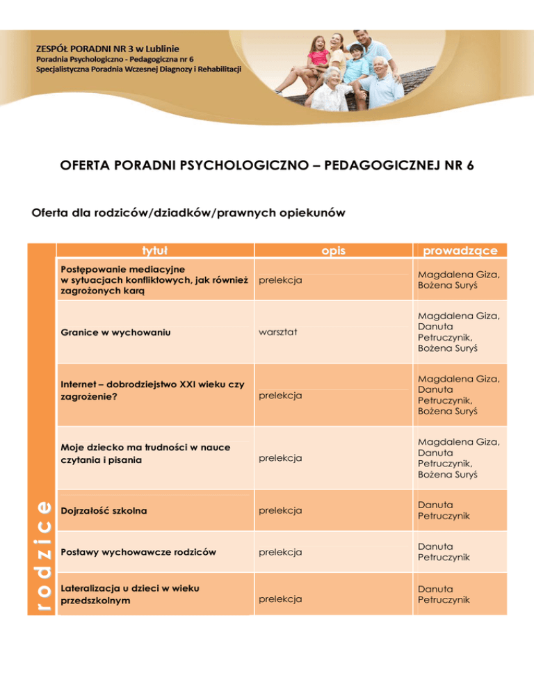 OFERTA PORADNI PSYCHOLOGICZNO – PEDAGOGICZNEJ NR 6 Oferta dla rodziców/dziadków/prawnych opiekunów tytuł Postępowanie mediacyjne w sytuacjach konfliktowych, jak również zagrożonych karą prowadzące prelekcja Magdalena Giza, Bożena Suryś warsztat Magdalena Giza, Danuta Petruczynik, Bożena Suryś prelekcja Magdalena Giza, Danuta Petruczynik, Bożena Suryś Moje dziecko ma trudności w nauce czytania i pisania prelekcja Magdalena Giza, Danuta Petruczynik, Bożena Suryś Dojrzałość szkolna prelekcja Danuta Petruczynik Postawy wychowawcze rodziców prelekcja Danuta Petruczynik Lateralizacja u dzieci w wieku przedszkolnym prelekcja Granice w wychowaniu Internet – dobrodziejstwo XXI wieku czy zagrożenie? rodzice opis Danuta Petruczynik Uczeń leworęczny warsztat dla nauczycieli i rodziców uczniów klas 0 – I w zakresie pracy z dzieckiem leworęcznym Stanisława Krasowska Dysleksja i co dalej? Ogólne i specyficzne trudności dzieci i młodzieży w nauce szkolnej prelekcja Stanisława Krasowska Rekomendacje psychologicznopedagogiczne, a praca z uczniem w domu prelekcja nt. zaleceń zawartych w opiniach psychologicznopedagogicznych Stanisława Krasowska Niewielkie dzieci – wielka rzecz Moje dziecko idzie do przedszkola Moje dziecko idzie do szkoły Czym skorupka za młodu nasiąknie… Z wizytą u Hefajstosa, czyli jak rozumieć trudne zachowania u dzieci i jak pomóc dziecku radzić sobie z nimi Oswajanie smoczej pary Kiedy w szafie siedzi duch Dziecko w sieci Język i komunikacja program profilaktycznointerwencyjny adresowany do rodziców i nauczycieli dzieci przedszkolnych i szkolnych z klas I – III Maria Rożnowska (urlop zdrowotny), Anna Wysokińska – Tarka Szkoła dla Rodziców i Wychowawców Poznanie się, kontrakt, integracja Granice w wychowaniu Uczucia – nazywanie, wyrażanie, rozumienie Zachęcanie dziecka do współpracy Kary i konsekwencje w wychowaniu Rozwiązywanie problemów i konfliktów Zachęcanie do samodzielności Wpisywanie dziecka w role i uwalnianie od grania ról Pomocna pochwała i zachęta cykl warsztatów umiejętności wychowawczych dla rodziców i nauczycieli, których celem jest wspieranie ich w radzeniu sobie w codziennych kontaktach z dziećmi Dorota Sikora Grupa wsparcia dla rodziców – absolwentów Szkoły dla Rodziców i Wychowawców spotkania dla absolwentów Szkoły dla Rodziców i Wychowawców Dorota Sikora Akademia Rodzica Szczęśliwy rodzic – szczęśliwe program profilaktycznoedukacyjny z zakresu wychowania w rodzinie; mini Dorota Sikora dziecko Postawy rodzicielskie i ich związek z funkcjonowaniem dziecka Kiedy pozwolić, kiedy zabronić? Wyznaczanie granic w wychowaniu Kary czy konsekwencje w wychowaniu? Budowanie poczucia własnej wartości u dziecka Moje relacje z dzieckiem wykłady i warsztaty dla rodziców dzieci przedszkolnych i szkolnych indywidualne konsultacje dla rodziców, którzy chcą lepiej rozumieć swoje dziecko, jego emocje, potrzeby i trudności; rozpoznać i wzmacniać zasoby dziecka; poszukać rozwiązań dla trudnych sytuacji w relacjach z dzieckiem; wzmocnić w sobie poczucie bycia dobrym rodzicem Dorota Sikora Mowa bez wady prelekcja dla nauczycieli i rodziców dzieci 4-letnich z zakresu profilaktyki logopedycznej Anna Wysokińska - Tarka Pomóż dziecku zacząć mówić prelekcja dla nauczycieli i rodziców dzieci 3-letnich z zakresu profilaktyki logopedycznej Anna Wysokińska - Tarka Język i komunikacja: wyrazić siebie, zrozumieć otoczenie prelekcja dla rodziców i nauczycieli nt. mowy jako czynnika determinującego sukcesy edukacyjne i więzi społeczne Anna Wysokińska - Tarka Krótkie rozważania na temat czytania spotkanie z rodzicami i nauczycielami na temat upowszechniania czytelnictwa wśród dzieci Anna Wysokińska – Tarka Ja i moje dziecko spotkanie z rodzicami i nauczycielami na temat postaw rodzicielskich i ich wpływu na wychowanie Dojrzałość szkolna a mowa i język prelekcja dla rodziców i nauczycieli nt. gotowości szkolnej w aspekcie językowym Anna Wysokińska – Tarka Anna Wysokińska – Tarka TV kontra rodzice – o wpływie więzi emocjonalnej rodziców na rozwój mowy wykład dla rodziców dziecka Anna Cygan Kiedy do logopedy? wykład dla rodziców Anna Cygan Gry i zabawy językowe w tzw. międzyczasie- propozycja zabaw językowych wykład dla rodziców Anna Cygan Jak rozwijać mowę dziecka? wykład dla rodziców Anna Cygan Rymowanki są dobre na wszystko, rymowanki rozbawią, pocieszą, ukołyszą - o znaczeniu rymowanek w rozwoju mowy dziecka wykład dla rodziców Anna Cygan Wpływ TV na rozwój mowy dziecka wykład dla rodziców Anna Cygan Logopedia w sieci – logopedyczne strony internetowe wykład dla rodziców Anna Cygan Zabawa w czytanie propozycja nauki czytania metoda sylabową połączona z ćwiczeniami stymulującymi lewą półkulę mózgu Anna Cygan Nie jesteś sama wsparcie dla matek, które czują się samotne w wychowywaniu dzieci – spotkania indywidualne Stanisława Krasowska indywidualne spotkania dla rodziców, którzy chcieliby lepiej rozumieć swoje dziecko lub też czują się zaniepokojeni z powodu jego problemów rozwojowych, emocjonalnych, czy też doświadczają trudności w jego wychowywaniu Maria Rożnowska (urlop zdrowotny) Każdy może być Dobrym Rodzicem! spotkania dla rodziców małych dzieci w ramach kampanii „Dobry Rodzic-Dobry Start” Maria Rożnowska (urlop zdrowotny) Moje dziecko wybiera zawód wykład dla rodziców uczniów ostatnich klas szkoły podstawowej oraz gimnazjum nt. znaczenia właściwego wyboru przez dziecko szkoły i kierunku kształcenia dla powodzenia zawodowego w życiu dorosłym oraz roli rodziców w powyższym procesie Maria Rożnowska (urlop zdrowotny) Moje dziecko dorasta wykład z prezentacją multimedialną dla rodziców uczniów ostatnich klas szkoły podstawowej oraz gimnazjum dotyczący problemów okresu adolescencji, z którymi mierzy się zarówno nastolatek, jak i jego rodzice Maria Rożno