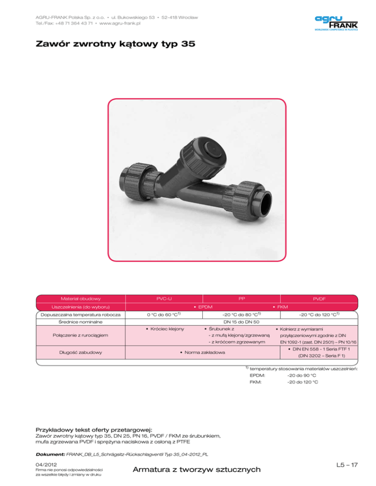 AGRU-FRANK Polska Sp. z o.o. * ul. Bukowskiego 53 * 52-418 Wrocław Tel./Fax: +48 71 364 43 71 * www.agru-frank.pl WORLDWIDE COMPETENCE IN PLASTICS Zawór zwrotny kątowy typ 35 Materiał obudowy PVC-U PP • EPDM Uszczelnienia (do wyboru) Dopuszczalna temperatura robocza 0 °C do 60 °C1) -20 °C do 80 °C1) Średnice nominalne -20 °C do 120 °C1) DN 15 do DN 50 • Króciec klejony PVDF • FKM Połączenie z rurociągiem Długość zabudowy • Śrubunek z • Kołnierz z wymiarami - z mufą klejoną/zgrzewaną przyłączeniowymi zgodnie z DIN - z króćcem zgrzewanym EN 1092-1 (zast. DIN 2501) – PN 10/16 • DIN EN 558 - 1 Seria FTF 1 • Norma zakładowa (DIN 3202 – Seria F 1) 1)temperatury stosowania materiałów uszczelnień: EPDM: -20 do 90 °C FKM: -20 do 120 °C Przykładowy tekst oferty przetargowej: Zawór zwrotny kątowy typ 35, DN 25, PN 16, PVDF / FKM ze śrubunkiem, mufa zgrzewana PVDF i sprężyna naciskowa z osłoną z PTFE Dokument: FRANK_DB_L5_Schrägsitz-Rückschlagventil Typ 35_04-2012_PL 04/2012 Firma nie ponosi odpowiedzialności za wszelkie błędy i zmiany w druku Armatura z tworzyw sztucznych L5 – 17 WORLDWIDE COMPETENCE IN PLASTICS Zawór zwrotny kątowy typ 35, PVC-U Zawór podstawowy 6 4 9 H 5 Ød 2 1 3 le L Kołnierz Śrubunek z króćcem 6 6 8 8 ØD LKR Ø K 7 Śrubunek z mufą lS n x Ø d2 LS LFl Nr. Nazwa Materiał Nr. Nazwa 1 Obudowa 1 PVC-U 6 Nakrętka złączna 7 Tuleja z wieńcem Ilość le z Ilość Materiał 1 PVC-U 2 Tłok*) 1 PVC-U 3 Uszczelka tłoka*) 1 EPDM, FKM3) i luźny kołnierz1) 1PVC-U 4 Prowadnica tłoka 1 PVC-U 8 Śrubunek z wkładką2) 2 PVC-U, PE/EPDM, FKM3) 5 Pierścień O-Ring*) 9 Sprężyna naciskowa4) 1 Stal sprężynowa 1 EPDM, FKM *) części zużywalne 1)dla wersji z kołnierzem 2)dla wersji ze śrubunkiem i mufą / króćcem 3)specjalne wykonanie: CSM, NBR, FEP / Parofluor na zapytanie 4)w standardzie bez sprężyny Wymiary i masy Masa w kg / szt. Wymiary w mm Króciec DN d H L Śrubunek z mufą / króćcem Kołnierz le D LFl n x d2 K z le LS lS Zawór podstawowy Kołnierz Śrubunek z mufą/ króćcem 1520 75 12417130954 x 14651501625238 0,18 0,36 0,26 20 25 80 144 18 150 105 4 x 14 75 170 18 278 39 0,20 0,46 0,33 25 32 90 154 20 160 115 4 x 14 85 180 20 294 39 0,30 0,67 0,50 32 40 110 174 23 180 140 4 x 18 100 204 22 320 42 0,48 1,03 0,84 40 50 128 194 26 200 150 4 x 18 110 228 24,5 342 44 0,79 1,42 1,21 50 63 150 224 30 230 165 4 x 18 125 266 29 384 44 1,32 2,30 2,04 Minimalne ciśnienia zamykania i otwierania w mbar DN 15 20 25 32 40 50 zamykanie 182335454545 otwieranie 101010101010 L5 – 18 Armatura z tworzyw sztucznych 04/2012 Firma nie ponosi odpowiedzialności za wszelkie błędy i zmiany w druku WORLDWIDE COMPETENCE IN PLASTICS Zawór zwrotny kątowy typ 35, PP i PVDF Zawór podstawowy 6 4 9 H 5 1 R Ød Pierścień O-Ring 2 3 L Kołnierz Śrubunek z króćcem 6 6 8 8 ØD LKR Ø K 7 Śrubunek z mufą n x Ø d2 lS z LS L le Nr. Nazwa Ilość Materiał Nr. Nazwa 1 Obudowa 1 PP, PVDF 6 Nakrętka złączna 2 Tłok*) 1 PP, PVDF 7 Kołnierz gwintowany1) 1 PP, PP-GFK 3 Uszczelka tłoka*) 1 EPDM, FKM3) 8 Śrubunek z wkładką2) 2 PP, PVDF/EPDM, FKM3) 4 Prowadnica tłoka 1 PP, PVDF 9 Sprężyna naciskowa 1 Stal sprężynowa 5 Pierścień O-Ring*) 1 EPDM, FKM *) części zużywalne 1)dla wersji z kołnierzem 2)dla wersji ze śrubunkiem i mufą/króćcem Ilość Materiał 1 PP, PVDF 3)specjalne wykonanie: CSM, NBR, FEP / Parofluor na zapytanie Wymiary i masy Masa w kg / szt. Wymiary w mm Śrubunek z mufą / króćcem Kołnierz Zawór podstawowy Zawór podstawowy Kołnierz d dPierścień O-Ring H L D n x d2 K z le LS lS PP PVDF PP PVDF 15 20 20,22 x 3,53 75 130 36 x 1/8“ 95 4 x 14 65 136 16 238 38 0,14 0,27 0,16 0,45 20 25 29,75 x 3,53 80 150 48 x 1,6“ 105 4 x 14 75 156 18 264 39 0,16 0,31 0,18 0,57 25 32 36,09 x 3,53 90 160 52 x 1,6“ 115 4 x 14 85 166 20 280 39 0,24 0,47 0,27 0,81 32 40 40,64 x 5,33 110 180 65 x 1,6“ 140 4 x 18 100 186 22 306 42 0,39 0,77 0,43 1,35 40 50 46,99 x 5,33 128 200 72 x 1,6“ 150 4 x 18 110 206 24,5 334 44 0,60 1,15 0,67 1,81 50 63 59,69 x 5,33 150 230 85 x 1,6“ 165 4 x 18 125 230 29 368 44 1,02 1,65 1,08 2,43 DN R Minimalne ciśnienia zamykania 15 20 25 32 40 50 DN Minimalne ciśnienia otwierania 15 20 25 32 40 50 DN iśnienie zamykania C bez sprężyny0,180,230,200,300,300,20 iśnienie otwierania C bez sprężyny0,010,010,010,010,010,01 [bar] ze sprężyną 0,010,010,010,010,010,01 [bar] ze sprężyną 0,200,300,200,300,400,20 04/2012 Firma nie ponosi odpowiedzialności za wszelkie błędy i zmiany w druku Armatura z tworzyw sztucznych L5 – 19 WORLDWIDE COMPETENCE IN PLASTICS Zawór zwrotny kątowy typ 35 Wykres strat ciśnienia 104 DN 50, kVS = 1130 l/min DN 40, kVS = 730 l/min 103 Wielkość przepływu [l/min] DN 32, kVS = 4800 l/min DN 25, kVS = 325 l/min DN 20, kVS = 180 l/min DN 15, kVS = 95 l/min 100 10 1 10-3 10-2 1 0,1 Strata ciśnienia [bar] Wskazówki eksploatacyjne Dopuszczalne ciśnienia robocze1) pB w bar Materiał obudowy TB w °C PVC-U PP PVDF 0 do 20 40 60 -20 do 30 60 80 -20 do 20 80 120 pB [bar] 10 6 1 10 4,2 1,5 16 10 4 1)definicja p. Rozdział T2 / Informacje techniczne Konserwacja Zależnie od danych warunków stosowania należy przeprowadzać regularnie w odpowiednich odstępach czasu konserwację / czyszczenie. Demontaż armatury Uwaga: Nie wolno nigdy demontować armatury w instalacji pod ciśnieniem roboczym. Wskazówka: Nakrętki złączne 6 należy poluzować lub dociągnąć ręcznie lub za pomocą odpowiedniego pasa montażowego. Unikać stosowania siły. Odkręcić nakrętki złączne 6 otworu konserwacyjnego i wyjąć ostrożnie z obudowy 1 prowadnicę tłoka 4. Wyjąć tłok 2 z prowadnicy tłoka 4 i ostrożnie odłączyć uszczelkę tłoka 3 od tłoka za pomocą odpowiedniego narzędzia Pierścień O-Ring wyjąć z rowka korpusu wsporczego sita. L5 – 20 Uwaga: W celu ochrony pierścieni O-Ring przed uszkodzeniem podczas montażu, należy stosować