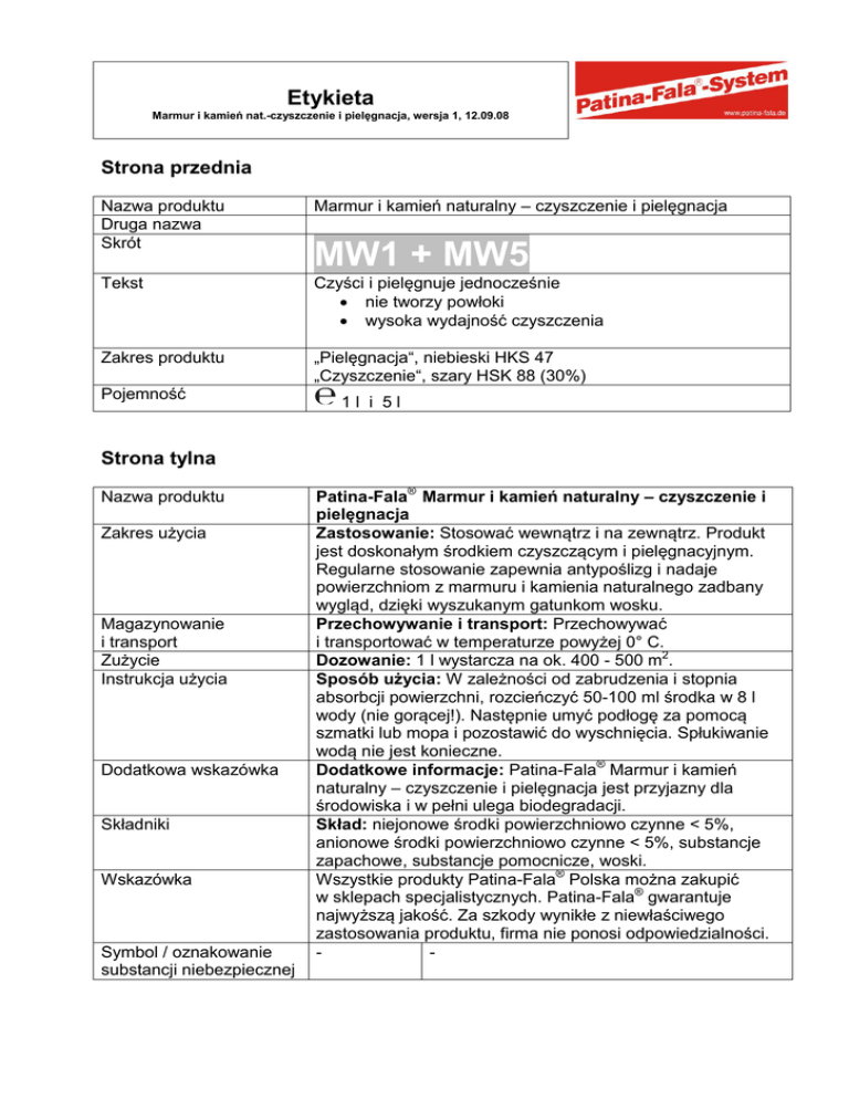 Etykieta Marmur i kamień nat.-czyszczenie i pielęgnacja, wersja 1, 12.09.08 Strona przednia Nazwa produktu Druga nazwa Skrót Marmur i kamień naturalny – czyszczenie i pielęgnacja Tekst Czyści i pielęgnuje jednocześnie nie tworzy powłoki wysoka wydajność czyszczenia Zakres produktu „Pielęgnacja“, niebieski HKS 47 „Czyszczenie“, szary HSK 88 (30%) Pojemność MW1 + MW5 1l i 5l Strona tylna Nazwa produktu Zakres użycia Magazynowanie i transport Zużycie Instrukcja użycia Dodatkowa wskazówka Składniki Wskazówka Symbol / oznakowanie substancji niebezpiecznej Patina-Fala® Marmur i kamień naturalny – czyszczenie i pielęgnacja Zastosowanie: Stosować wewnątrz i na zewnątrz. Produkt jest doskonałym środkiem czyszczącym i pielęgnacyjnym. Regularne stosowanie zapewnia antypoślizg i nadaje powierzchniom z marmuru i kamienia naturalnego zadbany wygląd, dzięki wyszukanym gatunkom wosku. Przechowywanie i transport: Przechowywać i transportować w temperaturze powyżej 0° C. Dozowanie: 1 l wystarcza na ok. 400 - 500 m2. Sposób użycia: W zależności od zabrudzenia i stopnia absorbcji powierzchni, rozcieńczyć 50-100 ml środka w 8 l wody (nie gorącej!). Następnie umyć podłogę za pomocą szmatki lub mopa i pozostawić do wyschnięcia. Spłukiwanie wodą nie jest konieczne. Dodatkowe informacje: Patina-Fala® Marmur i kamień naturalny – czyszczenie i pielęgnacja jest przyjazny dla środowiska i w pełni ulega biodegradacji. Skład: niejonowe środki powierzchniowo czynne < 5%, anionowe środki powierzchniowo czynne < 5%, substancje zapachowe, substancje pomocnicze, woski. Wszystkie produkty Patina-Fala® Polska można zakupić w sklepach specjalistycznych. Patina-Fala® gwarantuje najwyższą jakość. Za szkody wynikłe z niewłaściwego zastosowania produktu, firma nie ponosi odpowiedzialności. - Etykieta Marmur i kamień nat.-czyszczenie i pielęgnacja, wersja 1, 12.09.08 Adres Numer art. Numer UN Kod EAN “Zielony punkt” Producent: Patina Fala® Beizmittel GmbH, Niemcy Dystrybutor: IFC wyłączny partner Patina-Fala i Fala w Polsce ul. Armii Krajowej 6/3 50-541 Wrocław tel: + 48 71 758 44 62 e-mail: [email protected] www.patinafala.pl Nr art. 3601 (1l) Nr art. 3605 (5l) 4002849000773 4002849001084 JA Freigabe erteilt durch: Datum: