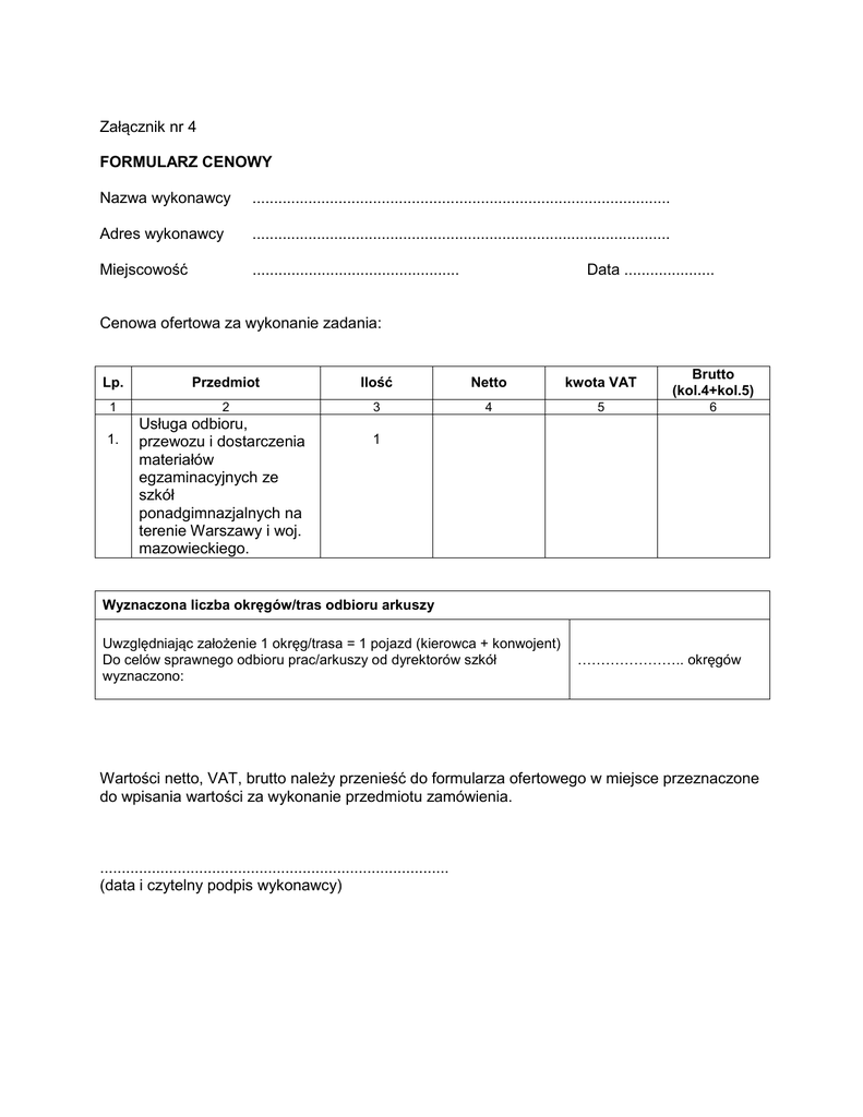 Załącznik nr 4 FORMULARZ CENOWY Nazwa wykonawcy ................................................................................................. Adres wykonawcy ................................................................................................. Miejscowość ................................................ Data ..................... Cenowa ofertowa za wykonanie zadania: Lp. Przedmiot Ilość Netto kwota VAT Brutto (kol.4+kol.5) 1 2 3 4 5 6 1. Usługa odbioru, przewozu i dostarczenia materiałów egzaminacyjnych ze szkół ponadgimnazjalnych na terenie Warszawy i woj. mazowieckiego. 1 Wyznaczona liczba okręgów/tras odbioru arkuszy Uwzględniając założenie 1 okręg/trasa = 1 pojazd (kierowca + konwojent) Do celów sprawnego odbioru prac/arkuszy od dyrektorów szkół wyznaczono: ………………….. okręgów Wartości netto, VAT, brutto należy przenieść do formularza ofertowego w miejsce przeznaczone do wpisania wartości za wykonanie przedmiotu zamówienia. ................................................................................. (data i czytelny podpis wykonawcy)