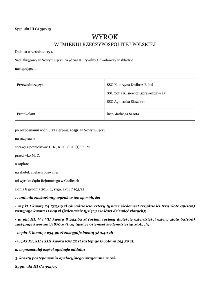 Sygn. akt III Ca 392/15 WYROK W IMIENIU RZECZYPOSPOLITEJ POLSKIEJ Dnia 10 września 2015 r. Sąd Okręgowy w Nowym Sączu, Wydział III Cywilny Odwoławczy w składzie następującym: Przewodniczący: SSO Katarzyna Kwilosz-Babiś SSO Zofia Klisiewicz (sprawozdawca) SSO Agnieszka Skrzekut Protokolant: insp. Jadwiga Sarota po rozpoznaniu w dniu 27 sierpnia 2015r. w Nowym Sączu na rozprawie sprawy z powództwa: L. K., R. K., S. K. (1) i K. M. przeciwko M. C. o zapłatę na skutek apelacji pozwanej od wyroku Sądu Rejonowego w Gorlicach z dnia 8 grudnia 2014 r., sygn. akt I C 193/12 1. zmienia zaskarżony wyrok w ten sposób, że: - w pkt I kwotę 24 733,89 zł (dwadzieścia cztery tysiące siedemset trzydzieści trzy złote 89/100) zastępuje kwotą 11 609 zł (jedenaście tysięcy sześćset dziewięć złotych); - w pkt III, V i VII kwoty 8 244,62 zł (osiem tysięcy dwieście czterdzieści cztery złote 62/100) zastępuje kwotami 3 870 zł (trzy tysiące osiemset siedemdziesiąt złotych); - w pkt X kwotę 1 234,90 zł zastępuje kwotą 580,40 zł; - w pkt XI, XII i XIII kwoty 678,75 zł zastępuje kwotami 193,50 zł; 2. w pozostałej części apelację oddala; 3. koszty postępowania apelacyjnego wzajemnie znosi. Sygn. akt III Ca 392/15 UZASADNIENIE Wyrokiem z dnia 8.12.2014r. Sąd Rejonowy w Gorlicach w sprawie z powództwa L. K., R. K., S. K. (1)i K. M.przeciwko M. C.o zachowek, zasądził od pozwanej na rzecz powoda L. K.kwotę 24 733,89 zł wraz z ustawowymi odsetkami od dnia 18.06.2012r. do dnia zapłaty (pkt I), oddalił jego powództwo w pozostałym zakresie (pkt II), zasądził od pozwanej na rzecz powoda R. K.kwotę 8 244,62 zł wraz z ustawowymi odsetkami od dnia 30.10.2012r. do dnia zapłaty (pkt III) i oddalił jego powództwo w pozostałym zakresie (pkt IV), zasądził od pozwanej na rzecz powoda S. K. (1)kwotę 8 244,62 zł wraz z ustawowymi odsetkami od dnia 30.10.2012r. do dnia zapłaty (pkt V) i oddalił jego powództwo w pozostałym zakresie (pkt VI), zasądził od pozwanej na rzecz powódki K. M.kwotę 8 244,62 zł wraz z ustawowymi odsetkami od dnia 30.10.2012r. do dnia zapłaty (pkt VII), oddalił jej powództwo w pozostałym zakresie (pkt VIII), wyrokowi w punkcie I, III, V i VII nadał rygor natychmiastowej wykonalności do kwoty 3 100 zł (pkt IX), zasadził od pozwanej na rzecz powoda L. K.kwotę 1 234,90 zł tytułem częściowego zwrotu kosztów postępowania (pkt X), zasadził od pozwanej na rzecz powoda R. K.kwotę 678,75 zł tytułem częściowego zwrotu kosztów postępowania (pkt XI), zasadził od pozwanej na rzecz powoda S. K. (1)kwotę 678,75 zł tytułem częściowego zwrotu kosztów postępowania (pkt XII), zasądził od pozwanej na rzecz powódki K. M.kwotę 678,75 zł tytułem częściowego zwrotu kosztów postępowania (pkt XIII), zasądził od powodów na rzecz pozwanej solidarnie kwotę 1 800 zł tytułem częściowego zwrotu kosztów zastępstwa procesowego (pkt XIV) i nakazał wypłacić z reszty zaliczki uiszczonej przez powoda L. K.pod poz. (...) w kwocie 180,30 zł oraz ściągnąć od powodów R. K., S. K. (1), K. M.na rzecz Skarbu Państwa – Kasa Sądu Rejonowego w Gorlicach solidarnie kwotę 338,25 zł tytułem brakującej zaliczki na opinię biegłego R. B., która w kwocie 518,55 zł została wypłacona tymczasowo ze środków Skarbu Państwa – Kasa Sądu Rejonowego w Gorlicach (pkt XV). Powyższe rozstrzygnięcie zapadło w oparciu o ustalenia faktyczne Sądu Rejonowego, z których w szczególności wynika, że powód L. K.i pozwana M. C.są rodzeństwem. Ich matką była spadkodawczyni S. K. (2), która zmarła 31.05.2011r. Poza w/w do kręgu spadkobierców ustawowych po S. K. (2) należały: córka zmarłej, a siostra w/w stron Z. M.oraz zstępni po ich bracie Z. K.zmarłym 10.07.1995r , tj. powodowie K. M., S. K. (1)i R. K.. Spadkodawczyni pozostawiła ważny testament notarialny z dnia 18.11.2010r., w którym do całości spadku powołała pozwaną. Nadto ustalił Sąd, że w skład majątku spadkowego po S. K. (2) wchodziły : - udział wynoszący 1/2 w prawie własności nieruchomości stanowiącej dz. ewid. nr (...) o pow. 800 m2 położoną w R., zabudowaną budynkiem piętrowym jednorodzinnym, który to udział spadkodawczyni nabyła w drodze umowy sprzedaży z dnia 8.07.1999r., - udział wynoszący 1/4 w prawie własności w/w nieruchomości, udział wynoszący 1/2 w prawie własności samochodu osobowego marki T. (...)i środki pieniężne w kwocie 34 151,07 zł zgromadzone na rachunku oszczędnościowym w Banku(...) w B.nabyte przez spadkodawczynię w drodze spadkobrania po swym synu A. K. (1)zmarłym dnia 24.09.2010r., na podstawie postanowienia Sądu Rejonowego w Gorlicach z dnia 28.04.2011r., W dniu 12.12.2013r. w sprawie I Ns 116/13 tamt. Sądu strony niniejszego postępowania oraz Z. M.zawarły ugodę, na mocy której dokonując działu spadku po A. K. (1)i S. K. (2)oraz znosząc powstałą pomiędzy nimi współwłasność ustaliły, iż nieruchomość położona w R.stanowiąca działkę nr (...)oraz samochód osobowy marki T. (...)zostaną przyznane na wyłączną własność pozwanej za stosownymi spłatami na rzecz pozostałych stron, obliczonymi według wielkości ich udziałów, nabytych w drodze spadkobrania po A. K. (1)i S. K. (2). Wartość w/w nieruchomości w niniejszym postępowaniu została oszacowana na kwotę 292 591 zł, zaś wartość samochodu na kwotę 12 440 zł. Dnia 17.07.2014r. pozwana sprzedała nieruchomość położoną w R. za kwotę 210 000 zł., informując o tym powodów i w dniach 23.07.2014r. oraz 25.07.2014r. dokonała na ich rzecz stosownych spłat, zgodnie z treścią ugody zawartej w sprawie I Ns 116/13, co wpłynęło na zmianę wysokości dotychczas żądanych przez nich kwot tytułem zachowku. Finalnie powodowie K. M., R. K. i S. K. (1) wnieśli o zasądzenie na rzecz każdego z nich kwot po 10 692 zł tytułem zachowku, zaś powód L. K. na rozprawie w dniu 1.12.2014r. osta