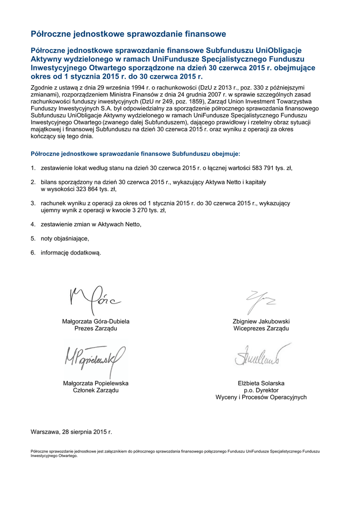 Półroczne jednostkowe sprawozdanie finansowe Półroczne jednostkowe sprawozdanie finansowe Subfunduszu UniObligacje Aktywny wydzielonego w ramach UniFundusze Specjalistycznego Funduszu Inwestycyjnego Otwartego sporządzone na dzień 30 czerwca 2015 r. obejmujące okres od 1 stycznia 2015 r. do 30 czerwca 2015 r. Zgodnie z ustawą z dnia 29 września 1994 r. o rachunkowości (DzU z 2013 r., poz. 330 z późniejszymi zmianami), rozporządzeniem Ministra Finansów z dnia 24 grudnia 2007 r. w sprawie szczególnych zasad rachunkowości funduszy inwestycyjnych (DzU nr 249, poz. 1859), Zarząd Union Investment Towarzystwa Funduszy Inwestycyjnych S.A. był odpowiedzialny za sporządzenie półrocznego sprawozdania finansowego Subfunduszu UniObligacje Aktywny wydzielonego w ramach UniFundusze Specjalistycznego Funduszu Inwestycyjnego Otwartego (zwanego dalej Subfunduszem), dającego prawidłowy i rzetelny obraz sytuacji majątkowej i finansowej Subfunduszu na dzień 30 czerwca 2015 r. oraz wyniku z operacji za okres kończący się tego dnia. Półroczne jednostkowe sprawozdanie finansowe Subfunduszu obejmuje: 1. zestawienie lokat według stanu na dzień 30 czerwca 2015 r. o łącznej wartości 583 791 tys. zł, 2. bilans sporządzony na dzień 30 czerwca 2015 r., wykazujący Aktywa Netto i kapitały w wysokości 323 864 tys. zł, 3. rachunek wyniku z operacji za okres od 1 stycznia 2015 r. do 30 czerwca 2015 r., wykazujący ujemny wynik z operacji w kwocie 3 270 tys. zł, 4. zestawienie zmian w Aktywach Netto, 5. noty objaśniające, 6. informację dodatkową. Małgorzata Góra-Dubiela Prezes Zarządu Zbigniew Jakubowski Wiceprezes Zarządu Małgorzata Popielewska Członek Zarządu Elżbieta Solarska p.o. Dyrektor Wyceny i Procesów Operacyjnych Warszawa, 28 sierpnia 2015 r. Półroczne sprawozdanie jednostkowe jest załącznikiem do półrocznego sprawozdania finansowego połączonego Funduszu UniFundusze Specjalistycznego Funduszu Inwestycyjnego Otwartego. subfundusz UniObligacje Aktywny w UniFundusze Specjalistyczny Fundusz Inwestycyjny Otwarty Tabela główna 31.12.2014 30.06.2015 Składniki lokat Wartość według ceny nabycia (w tys. zł) Wartość według wyceny na dzień bilansowy (w tys. zł) Procentowy udział w aktywach ogółem (w %) Wartość według ceny nabycia (w tys. zł) Wartość według wyceny na dzień bilansowy (w tys. zł) Procentowy udział w aktywach ogółem (w %) Akcje Warranty subskrypcyjne Nie dotyczy Prawa do akcji Nie dotyczy Prawa poboru Kwity depozytowe Listy zastawne Dłużne papiery wartościowe Instrumenty pochodne* 20076 20208 3,15 549148 563394 87,88 672712 698321 98,68 0 189 0,03 0 196 0,03 Udziały w spółkach z ograniczoną odpowiedzialnością Jednostki uczestnictwa Certyfikaty inwestycyjne Tytuły uczestnictwa emitowane przez instytucje wspólnego inwestowania mające siedzibę za granicą Wierzytelności Nie dotyczy Weksle Nie dotyczy Depozyty Waluty Nieruchomości Statki morskie Inne Razem 569224 583791 91,06 * Ujemna wartość instrumentów pochodnych na dzień 30.06.2015 r. w wysokości 4263 tys. zł i 3438 tys. zł na dzień 31.12.2014 r. została zaprezentowana w zobowiązaniach Subfunduszu. 672712 698517 98,71 subfundusz UniObligacje Aktywny w UniFundusze Specjalistyczny Fundusz Inwestycyjny Otwarty Tabela uzupełniająca Listy zastawne Rodzaj rynku Nazwa rynku Emitent Kraj siedziby emitenta Termin wykupu Warunki oprocentowania Rodzaj listu Podstawa emisji Hipoteczny Ustawa o bankach hipotecznych i listach zastawnych i Ustawa o obligacjach Wartość nominalna (w tys. zł) Liczba Wartość według ceny nabycia (w tys. zł) Wartość według wyceny na dzień bilansowy (w tys. zł) Procentowy udział w aktywach ogółem (w %) Nienotowane na rynku aktywnym O terminie wykupu poniżej 1 roku MBANK Bank Hipoteczny SA ISIN: PLRHNHP00185 Nienotowane na rynku aktywnym Nie dotyczy MBANK Bank Hipoteczny SA Polska 2015-09-28 Zmienne 3,02% 1000 20000 20076 20208 3,15 Razem nienotowane na rynku aktywnym 20000 20076 20208 3,15 Razem listy zastawne 20000 20076 20208 3,15 subfundusz UniObligacje Aktywny w UniFundusze Specjalistyczny Fundusz Inwestycyjny Otwarty Tabela uzupełniająca Dłużne papiery wartościowe Rodzaj rynku Nazwa rynku Emitent Kraj siedziby emitenta Termin wykupu Warunki oprocentowania Wartość nominalna (w tys. zł) Liczba Wartość według ceny nabycia (w tys. zł) Wartość według wyceny na dzień bilansowy (w tys. zł) Procentowy udział w aktywach ogółem (w %) Notowane na rynku aktywnym O terminie wykupu do 1 roku Obligacje Turcja ISIN: TRT150715T17 Aktywny rynek – rynek regulowany Istambul Stock Exchange Skarb Państwa Turcja 2015-07-15 Zerokuponowe 140 15000 1983 2091 0,33 O terminie wykupu powyżej 1 roku Obligacje Chorwacja ISIN: XS0997000251 Inny aktywny rynek Bloomberg Generic Skarb Państwa Chorwacja 2024-01-26 Stałe 6% 3765 2500 7815 10181 1,59 Chorwacja ISIN: XS1028953989 Inny aktywny rynek Bloomberg Generic Skarb Państwa Chorwacja 2022-05-30 Stałe 3,88% 4194 2000 8282 8427 1,32 DS0725 ISIN: PL0000108197 * Aktywny rynek – rynek regulowany BondSpot Poland Skarb Państwa Polska 2025-07-25 Stałe 3,25% 1000 71000 71702 72412 11,30 International Personal Finance PLC ISIN: XS1054714248 Inny aktywny rynek Bloomberg Generic International Personal Finance PLC Wielka Brytania 2021-04-07 Stałe 5,75% 4194 6000 24999 25735 4,01 MOL Group Finance AB ISIN: XS0834435702 Inny aktywny rynek Bloomberg Generic MOL Group Finance AB Luksemburg 2019-09-26 Stałe 6,25% 3765 1050 3345 4387 0,68 PKO Finance AB ISIN: XS0783934085 Inny aktywny rynek Bloomberg Generic PKO Finance AB Szwecja 2022-09-26 Stałe 4,63% 3765 2500 7979 9903 1,54 Play Finance 2 ISIN: XS0982710153 Inny aktywny rynek Bloomberg Generic Play Finance 2 Luksemburg 2019-02-01 Stałe 5,25% 4194 300 1260 1325 0,21 PS0420 ISIN: PL0000108510 Aktywny rynek – rynek regulowany BondSpot Poland Skarb Państwa Polska 2020-04-25 Stałe 1,50% 1000 54990 52437 51966 8,11 PS0719 ISIN: P