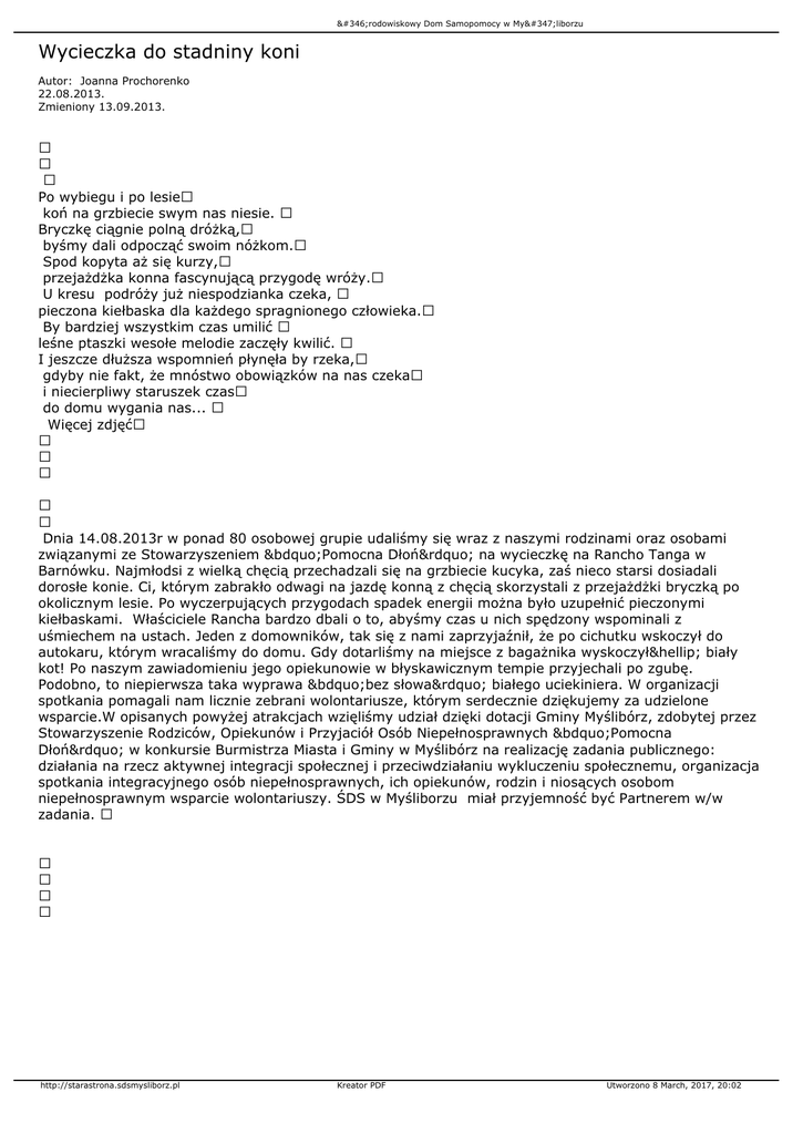 Środowiskowy Dom Samopomocy w Myśliborzu Wycieczka do stadniny koni Autor: Joanna Prochorenko 22.08.2013. Zmieniony 13.09.2013. Po wybiegu i po lesie koń na grzbiecie swym nas niesie. Bryczkę ciągnie polną dróżką, byśmy dali odpocząć swoim nóżkom. Spod kopyta aż się kurzy, przejażdżka konna fascynującą przygodę wróży. U kresu podróży już niespodzianka czeka, pieczona kiełbaska dla każdego spragnionego człowieka. By bardziej wszystkim czas umilić leśne ptaszki wesołe melodie zaczęły kwilić. I jeszcze dłuższa wspomnień płynęła by rzeka, gdyby nie fakt, że mnóstwo obowiązków na nas czeka i niecierpliwy staruszek czas do domu wygania nas... Więcej zdjęć Dnia 14.08.2013r w ponad 80 osobowej grupie udaliśmy się wraz z naszymi rodzinami oraz osobami związanymi ze Stowarzyszeniem „Pomocna Dłoń” na wycieczkę na Rancho Tanga w Barnówku. Najmłodsi z wielką chęcią przechadzali się na grzbiecie kucyka, zaś nieco starsi dosiadali dorosłe konie. Ci, którym zabrakło odwagi na jazdę konną z chęcią skorzystali z przejażdżki bryczką po okolicznym lesie. Po wyczerpujących przygodach spadek energii można było uzupełnić pieczonymi kiełbaskami. Właściciele Rancha bardzo dbali o to, abyśmy czas u nich spędzony wspominali z uśmiechem na ustach. Jeden z domowników, tak się z nami zaprzyjaźnił, że po cichutku wskoczył do autokaru, którym wracaliśmy do domu. Gdy dotarliśmy na miejsce z bagażnika wyskoczył… biały kot! Po naszym zawiadomieniu jego opiekunowie w błyskawicznym tempie przyjechali po zgubę. Podobno, to niepierwsza taka wyprawa „bez słowa” białego uciekiniera. W organizacji spotkania pomagali nam licznie zebrani wolontariusze, którym serdecznie dziękujemy za udzielone wsparcie.W opisanych powyżej atrakcjach wzięliśmy udział dzięki dotacji Gminy Myślibórz, zdobytej przez Stowarzyszenie Rodziców, Opiekunów i Przyjaciół Osób Niepełnosprawnych „Pomocna Dłoń” w konkursie Burmistrza Miasta i Gminy w Myślibórz na realizację zadania publicznego: działania na rzecz aktywnej integracji społecznej i przeciwdziałaniu wykluczeniu społecznemu, organizacja spotkania integracyjnego osób niepełnosprawnych, ich opiekunów, rodzin i niosących osobom niepełnosprawnym wsparcie wolontariuszy. ŚDS w Myśliborzu miał przyjemność być Partnerem w/w zadania. http://starastrona.sdsmysliborz.pl Kreator PDF Utworzono 8 March, 2017, 20:02