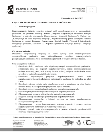 Załącznik nr 1 do SIWZ Część I. SZCZEGÓŁOWY OPIS PRZEDMIOTU ZAMÓWIENIA 1. Informacje ogólne Przeprowadzenie badania „Analiza sytuacji osób niepełnosprawnych w województwie podlaskim” na potrzeby realizacji zadania „Wsparcie Regionalnych Ośrodków Polityki Społecznej w zakresie utworzenia Obserwatorium Integracji Społecznej”, Projekt pn. „Koordynacja na rzecz aktywnej integracji”, współfinansowany przez Europejski Fundusz Społeczny w ramach Programu Operacyjnego Kapitał Ludzki, Priorytet I Zatrudnienie i integracja społeczna, Działanie 1.2 Wsparcie systemowe instytucji pomocy i integracji społecznej. Cel główny badania: Dokonanie kompleksowej diagnozy na temat sytuacji osób niepełnoprawnych w województwie podlaskim oraz zidentyfikowanie zasobów instytucjonalnych podejmujących działania na rzecz osób niepełnosprawnych w województwie podlaskim. Cele szczegółowe badania: 1) Określenie skali i struktury osób niepełnosprawnych w województwie podlaskim, z podziałem min. na: stopnień niepełnosprawności, rodzaj niepełnosprawności (rodzaje schorzeń), płeć, wiek (osoby dorosłe, dzieci), miejsce zamieszkania, statut zawodowy, wykształcenie, źródło utrzymania. 2) Określenie najczęstszych przyczyn niepełnosprawności wśród osób niepełnosprawnych zamieszkujących województwo podlaskie (z podziałem na płeć i wiek). 3) Określenie miejsca pobytu osób niepełnosprawnych z podziałem na wiek (osoby dorosłe, dzieci) m.in.: opieka instytucjonalna, opieka rodzinna. 4) Określenie przyczyn marginalizacji społecznej osób niepełnosprawnych. 5) Opisanie sytuacji materialnej i zdrowotnej osób niepełnosprawnych. 6) Zdiagnozowanie poziomu edukacji wśród osób niepełnosprawnych. 7) Diagnoza sytuacji kulturowej i sportowej osób niepełnosprawnych. 8) Zdiagnozowanie problemów, z którymi borykają się osoby niepełnosprawne w województwie podlaskim. 9) Zdiagnozowanie i ocena funkcjonowania systemu wsparcia i pomocy osobom niepełnosprawnym na terenie województwa podlaskiego. 10) Diagnoza potrzeb osób niepełnosprawnych z punktu widzenia przedstawicieli instytucji wspomagających te osoby. 11) Wskazanie zasobów instytucjonalnych świadczących pomoc i wsparcie na rzecz osób niepełnosprawnych z uwzględnieniem ich rodzajów oraz świadczonych usług, w tym wskazanie liczby placówek wspierających osoby niepełnosprawne w każdym powiecie województwa podlaskiego. Realizację celu głównego i celów szczegółowych umożliwi odpowiedź na następujące pytania badawcze: 1) Jaka jest skala oraz struktura osób niepełnosprawnych w województwie podlaskim z podziałem na powiaty? 2) Jakie są główne przyczyny niepełnosprawności wśród mieszkańców województwa podlaskiego z podziałem na powiaty (z podziałem na płeć i wiek)? 3) Jak często i z jakich form pomocy korzystają osoby niepełnosprawne w województwie podlaskim? 4) Jakie działania na rzecz wsparcia osób niepełnosprawnych są podejmowane na terenie województwa podlaskiego i jakie są planowane na przyszłość? 5) Jakie rodzaje pomocy są najbardziej skuteczne w przeciwdziałaniu zjawisku marginalizacji społecznej osób niepełnosprawnych? 6) Jakiego rodzaju wsparcia najbardziej potrzebują osoby niepełnosprawne? Czy otrzymują je w wystarczającym stopniu? 7) Jakie są najpilniejsze potrzeby osób niepełnosprawnych na Podlasiu? 8) Jakie jest miejsce pobytu osób niepełnosprawnych? 9) Ile i jakich instytucji jest na terenie województwa podlaskiego (z podziałem na powiaty), które oferują swoje usługi na rzecz osób niepełnosprawnych? 10) Jakiego rodzaju wsparcie jest oferowane przez te instytucje? Problemy badawcze do zdiagnozowania na terenie województwa podlaskiego: 1) Sytuacja społeczno-demograficzna osób niepełnosprawnych 2) Stopień niepełnosprawności oraz rodzaj schorzenia posiadanego przez osoby niepełnosprawne 3) Sytuacja osób niepełnosprawnych na otwartym rynku pracy 4) Sytuacja materialna osób niepełnosprawnych 5) Sytuacja zdrowotna osób niepełnosprawnych 6) Sytuacja sportowa i kulturowa osób niepełnosprawnych 7) Sytuacja edukacyjna osób niepełnosprawnych 8) Warunki mieszkaniowe osób niepełnosprawnych 9) Katalog usług i formy wsparcia skierowane do osób niepełnosprawnych w województwie podlaskim 10) Zasoby instytucjonalne ukierunkowane na osoby niepełnosprawne w województwie podlaskim 2. Metody badawcze 1) Analiza desk research - przeprowadzenie analizy dostępnych danych nt. sytuacji osób niepełnosprawnych, w tym: niepełnosprawność w liczbach, stopnie niepełnosprawności, aktywność ekonomiczna osób niepełnosprawnych, warunki życia, pomoc społeczna, ochrona zdrowia, zasoby instytucjonalne świadczące swoje usługi na rzecz osób niepełnosprawnych (m.in. placówki ochrony zdrowia i rehabilitacji, placówki edukacyjne, placówki reintegracji społeczno-zawodowej, hospicja, domu pomocy społecznej, podmioty ekonomii społecznej itp.). 2) Badanie ilościowe – wywiad kwestionariuszowy z osobami niepełnosprawnymi. 3) FOCUS - z pracownikami instytucji działającymi na rzecz osób niepełnosprawnych (m.in.: pracownikami socjalnymi, przedstawicielami powiatowych/miejskich komisji orzekania o niepełnosprawności, pracownikami ochrony zdrowia, opiekunami osób niepełnosprawnych, przedstawicielami PCPR, OPS, PFRON, urzędu pracy i przedstawicielami organizacji pozarządowych działających na rzecz osób niepełnosprawnych). 4) Studium przypadku – pogłębiona analiza pojedynczego przypadku szerszego zjawiska. W niniejszym badaniu Wykonawca ma stworzyć studium przypadku osoby niepełnosprawnej mieszkającej na terenie województwa podlaskiego. Badanie zostanie przeprowadzone wśród osób niepełnosprawnych mieszkańców województwa podlaskiego. Szczegółowe wymagania dotyczące procesu badawczego są następujące: 1) W badaniu należy zastosować triangulację metodologiczną, polegającą na poł
