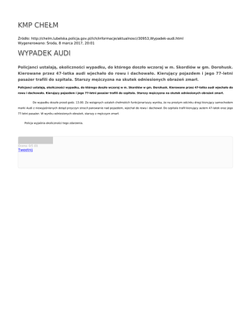 KMP CHEŁM Źródło: http://chelm.lubelska.policja.gov.pl/lch/informacje/aktualnosci/30953,Wypadek-audi.html Wygenerowano: Środa, 8 marca 2017, 20:01 WYPADEK AUDI Policjanci ustalają, okoliczności wypadku, do którego doszło wczoraj w m. Skordiów w gm. Dorohusk. Kierowane przez 47-latka audi wjechało do rowu i dachowało. Kierujący pojazdem i jego 77-letni pasażer trafili do szpitala. Starszy mężczyzna na skutek odniesionych obrażeń zmarł. Policjanci ustalają, okoliczności wypadku, do którego doszło wczoraj w m. Skordiów w gm. Dorohusk. Kierowane przez 47-latka audi wjechało do rowu i dachowało. Kierujący pojazdem i jego 77-letni pasażer trafili do szpitala. Starszy mężczyzna na skutek odniesionych obrażeń zmarł. Do wypadku doszło przed godz. 13.00. Ze wstępnych ustaleń chełmskich funkcjonariuszy wynika, że na prostym odcinku drogi kierujący samochodem marki Audi z niewyjaśnionych dotąd przyczyn stracił panowanie nad pojazdem, wjechał do rowu i dachował. Do szpitala trafił kierujący autem 47-latek oraz jego 77-letni pasażer. W wyniku odniesionych obrażeń, starszy z mężczyzn zmarł. Policja wyjaśnia okoliczności tego zdarzenia. Ocena: 0/5 (0) Tweetnij
