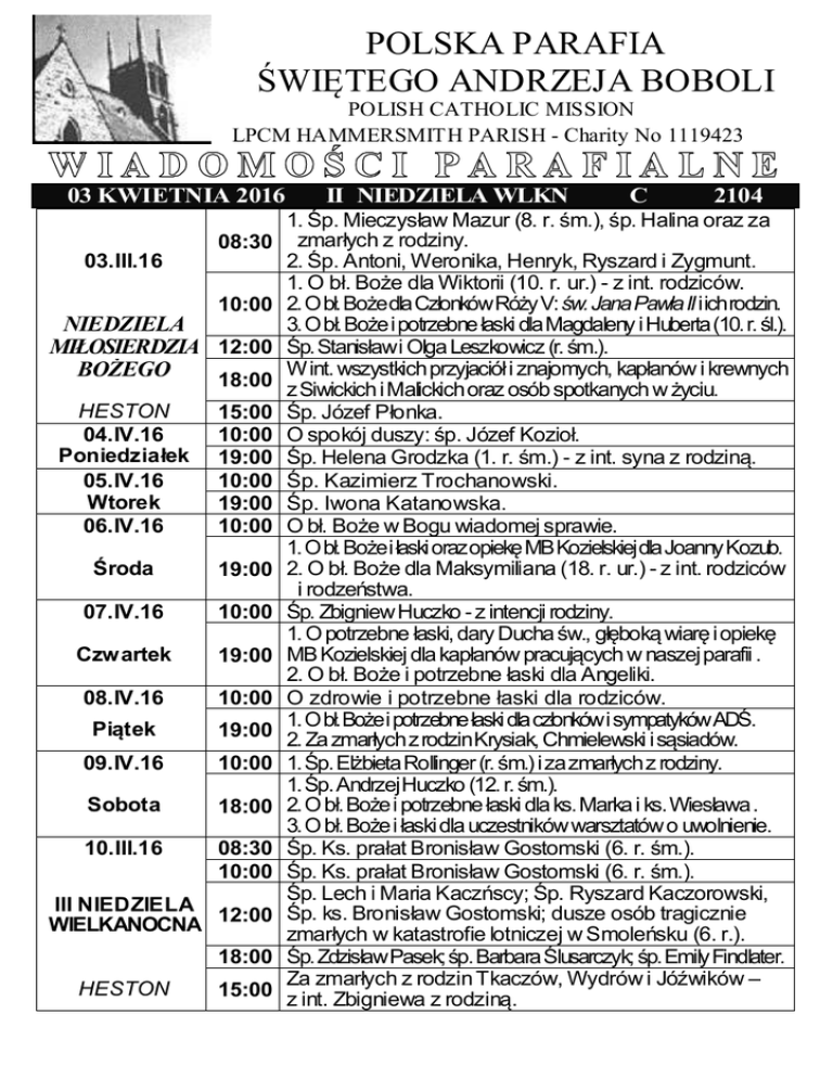 POLSKA PARAFIA ŚWIĘTEGO ANDRZEJA BOBOLI POLISH CATHOLIC MISSION LPCM HAMMERSMITH PARISH - Charity No 1119423 03 KWIETNIA 2016 08:30 03.III.16 10:00 NIEDZIELA MIŁOSIERDZIA 12:00 BOŻEGO 18:00 HESTON 04.IV.16 Poniedziałek 05.IV.16 Wtorek 06.IV.16 15:00 10:00 19:00 10:00 19:00 10:00 Środa 19:00 07.IV.16 10:00 Czwartek 19:00 08.IV.16 10:00 Piątek 19:00 09.IV.16 10:00 Sobota 18:00 10.III.16 08:30 10:00 III NIEDZIELA WIELKANOCNA 12:00 18:00 HESTON 15:00 II NIEDZIELA WLKN C 2104 1. Śp. Mieczysław Mazur (8. r. śm.), śp. Halina oraz za zmarłych z rodziny. 2. Śp. Antoni, Weronika, Henryk, Ryszard i Zygmunt. 1. O bł. Boże dla Wiktorii (10. r. ur.) - z int. rodziców. 2. O bł. Boże dla Członków Róży V: św. Jana Pawła II i ich rodzin. 3. O bł. Boże i potrzebne łaski dla Magdaleny i Huberta (10. r. śl.). Śp. Stanisław i Olga Leszkowicz (r. śm.). W int. wszystkich przyjaciół i znajomych, kapłanów i krewnych z Siwickich i Malickich oraz osób spotkanych w życiu. Śp. Józef Płonka. O spokój duszy: śp. Józef Kozioł. Śp. Helena Grodzka (1. r. śm.) - z int. syna z rodziną. Śp. Kazimierz Trochanowski. Śp. Iwona Katanowska. O bł. Boże w Bogu wiadomej sprawie. 1. O bł. Boże i łaski oraz opiekę MB Kozielskiej dla Joanny Kozub. 2. O bł. Boże dla Maksymiliana (18. r. ur.) - z int. rodziców i rodzeństwa. Śp. Zbigniew Huczko - z intencji rodziny. 1. O potrzebne łaski, dary Ducha św., głęboką wiarę i opiekę MB Kozielskiej dla kapłanów pracujących w naszej parafii . 2. O bł. Boże i potrzebne łaski dla Angeliki. O zdrowie i potrzebne łaski dla rodziców. 1. O bł. Boże i potrzebne łaski dla członków i sympatyków ADŚ. 2. Za zmarłych z rodzin Krysiak, Chmielewski i sąsiadów. 1. Śp. Elżbieta Rollinger (r. śm.) i za zmarłych z rodziny. 1. Śp. Andrzej Huczko (12. r. śm.). 2. O bł. Boże i potrzebne łaski dla ks. Marka i ks. Wiesława . 3. O bł. Boże i łaski dla uczestników warsztatów o uwolnienie. Śp. Ks. prałat Bronisław Gostomski (6. r. śm.). Śp. Ks. prałat Bronisław Gostomski (6. r. śm.). Śp. Lech i Maria Kaczńscy; Śp. Ryszard Kaczorowski, Śp. ks. Bronisław Gostomski; dusze osób tragicznie zmarłych w katastrofie lotniczej w Smoleńsku (6. r.). Śp. Zdzisław Pasek; śp. Barbara Ślusarczyk; śp. Emily Findlater. Za zmarłych z rodzin Tkaczów, Wydrów i Jóźwików – z int. Zbigniewa z rodziną. DZIŚ OBCHODZIMY UROCZYSTOŚĆ BOŻEGO MIŁOSIERDZIA. Jezus do św. s. Faustyny powiedział: „w tym dniu otwarte są wszystkie upusty Boże, przez które płyną łaski; niech się nie lęka zbliżyć do Mnie żadna dusza, chociażby grzechy jej były jako szkarłat [Dz. 699]. Kościół udziela odpustu zupełnego na zwykłych warunkach (spowiedź sakramentalna, komunia, modlitwa w intencjach papieskich) każdemu, kto dziś, w jakimkolwiek kościele lub kaplicy, z sercem całkowicie wolnym od wszelkiego przywiązania do jakiegokolwiek grzechu, weźmie udział w pobożnych praktykach spełnianych ku czci Bożego Miłosierdzia albo przynajmniej odmówi przed Najświętszym Sakramentem Eucharystii, wystawionym publicznie lub ukrytym w tabernakulum, modlitwę «Ojcze nasz» i Credo, dodając pobożne wezwanie do Pana Jezusa Miłosiernego (np. «Jezu Miłosierny, ufam Tobie»). NIEDZIELA 03 KWIETNIA 2016 - Niedziela Miłosierdzia Bożego Dziś odbywa się akcja promocyjna Wspólnoty Trudnych Małżeństw SYCHAR 09:00-13:30: zapraszamy do Kawiarni i sklepiku. 11.00 i 13:00, kaplica MB: zmiana tajemnic różańcowych. 13:30, kawiarnia: Informacyjne Zebranie Parafii. 16.00, HESTON: Zmiana tajemnic różańcowych. 17.30, kościół: Wystawienie Najświętszego Sakramentu i nieszpory eucharystyczne. PONIEDZIALEK 04 KWIATNIA 2016 – Ur. Zwiastowania Pańskiego Zachęcamy do podjęcia dzieła Duchowej Adopcji – Księga na ołtarzu w kaplicy MB. 20:00, sala św. Józefa: spotkanie „Mężczyzn św. Józefa”. WTOREK 05 KWIETNIA 2016 12:00, sala św. Józefa: „Złote Rybki” czyli spotkanie mam/opiekunów i małych dzieci. 20:00, salka: Spotkanie polskiej grupy AA (Basement, 18 Greenside Road, W12). ŚRODA 06 KWIETNIA 2016 11:00, kawiarnia: Spotkanie Klubu Brydżowego. 19:00, kaplica MB: Msza i nabożeństwo do MB Kozielskiej. CZWARTEK 07 KWIETNIA 2016 12:00, sala św. Józefa: „Złote Rybki” czyli spotkanie mam/opiekunów i małych dzieci. 19:30-21:00, kaplica MB: adoracja Najśw. Sakramentu. 20:00, kawiarnia: Spotkania GALILEI. 20:00, salka: Spotkania WŻCh. PIĄTEK 08 KWIETNIA 2016 10:30, kaplica B.Mił.: Koronka do Miłosierdzia Bożego. 18:30-20:00, kaplica MB: Różaniec, Msza i katecheza dla ADŚ. 20:00, kawiarnia: Grupa Wielbienia. SOBOTA 09 KWIETNIA 2016 WARSZTATY MODLITWY O UWOLNIENIE (zob. Warsztaty 5-iu Kluczy). 09:00, kawiarnia: rejestracja uczestników i modlitwa uwielbienia + Konferencja wstępna. 11:30, kościół: Modlitwa + konferencja: KLUCZ 1 NIEDZIELA 10 KWIETNIA 2016 - ROCZNICA SMOLEŃSKA 09:00-13:30, kawiarnia WARSZTATY MODLITWY O UWOLNIENIE – cz II. KAWIARNIA NIECZY NNA. Zaprasza my do sk lepiku 12:00, kościół: Msza św. za ofiary katastrofy smoleńskiej (6 r.). 17.30, kościół: Nieszpory eucharystyczne. 09-10.04.2016, kawiarnia, kościół, sala św. Józefa: warsztaty modlitwy o uwolnienie. 10.04.16: MODLITWY ZA ZMARŁYCH W SMOLEŃSKU (6. r. katastrofy). 11.04.16, 20:00, kawiarnia: Spotkanie Lektorów. 11-21.04.16 (przerwa: 15-17/03), 20:00, sala św. Józefa: kurs przedmałżeński. 12, 15, 19, 22, 26 i 29.04.16, 20:00, kościół: Re-katechezy Drogi Neokatechumenalnej. 12, 14, 19, 19, 26 i 28.04.16, 10:00 – 12:00, sala św. Józefa: „Złote Rybki” czyli spotkanie mam/opiekunów i małych dzieci. 12, 19 i 26.04.16, 20:00, salka (Basement, 18 Greenside Road, W12): Spotkanie polskiej grupy AA. 13, 20 i 27.04.16, 11:00, kawiarnia: Spotkanie Klubu Brydżowego. 13, 20 i 27.04.16, 18:30, sala św. Józefa i kawiarnia: próba Scholi. 14, 21 i 28.04.16, 19:30-21:00, kaplica MB: adoracja Naj