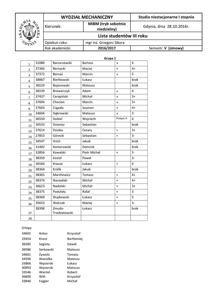 WYDZIAŁ MECHANICZNY Studia niestacjonarne I stopnia MiBM (tryb sobotnio niedzielny) Kierunek: Gdynia, dnia 28.10.2016r. Lista studentów III roku Opiekun roku: Rok akademicki: mgr inż. Grzegorz Sikora 2016/2017 Semestr: V (zimowy) Grupa 1 1. 31080 Barszczewski Bartosz 2. 37366 Bernacki Maciej 3. 37372 Bernaś Marcin 4. 38867 Bieńkowski Łukasz brak 5. 36529 Bojanowski Mateusz brak 6. 36539 Browarczyk Adam 7. 37437 Cerapiński Michał 8. 37604 Chocian Marcin 9. 37603 Ciąpała Szymon Dąbrowski 10. 34604 + + + 4 4+ 5 4 Mateusz + + + + + Przepis 4 4 3+ 3+ 4+ 3 11. 36550 Dubiel Wojciech 12. 30533 Dzienisz Sebastian 13. 37614 14. 27853 Dzioba Cezary + 3+ Górecki Sebastian + 3- 15. 34547 Itrich Jakub brak 16. 31492 Komorowski Dominik brak 17. 32856 Kowalski Piotr Michał 18. 38350 Kozioł Paweł 19. 36566 Krause Łukasz 20. 38364 Królik Jakub 21. 38365 22. 38374 Marchewicz Tomasz + 4+ Nacwalski Michał + 4+ 23. 36623 Nadolski Michał + 3+ 24. 38375 Podufały Rafał + 3 25. 38369 Słupkowski Łukasz + 5 26. 35653 Walczak Maciej + 3- ZmudaTrzebiatowski Łukasz 38398 27. 28. Urlopy 34602 Antos Krzysztof 33454 Kranz Bartłomiej 36585 Segieta Dawid 36586 34601 34596 33866 30993 33546 36600 33846 Serkowski Żywicki Wasielka Węsierski Węsierski Wiertel Witt Fajgier Mateusz Tomasz Mateusz Łukasz Mateusz Robert Krzysztof Michał brak + 3 3- + 4 brak brak