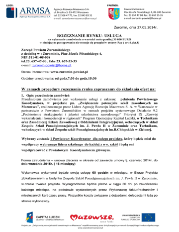 LIDER: PARTNER: Powiat Żuromiński Plac Józefa Piłsudskiego 4, 09-300 Żuromin Tel. 23 657 47 00, fax. 23 657 35 35 e-mail: [email protected] Agencja Rozwoju Mazowsza S.A. ul. Brechta 3, 03-472 Warszawa tel. 22 566 47 75, fax. 22 843 83 31 e-mail: [email protected] Żuromin, dnia 27.05.2014r. ROZEZNANIE RYNKU- USŁUGA na wykonanie zamówienia o wartości netto poniżej 30 000 EURO w niniejszym postępowaniu nie stosuje się przepisów ustawy Pzp ( art.4.pkt.8) Zarząd Powiatu Żuromińskiego z siedzibą w : Żurominie, Plac Józefa Piłsudskiego 4, NIP:511-01-08-008 tel.23..657-47-00 , faks 23. 657-35-35 e-mail :[email protected]. Strona internetowa: www.zuromin-powiat.pl Godziny urzędowania: od godz.7:30 do godz.15:30 W ramach procedury rozeznania rynku zapraszamy do składania ofert na: I . Opis przedmiotu zamówień Przedmiotem zamówienia jest wykonanie usługi z zakresu: pełnienia Powiatowego Koordynatora, w projekcie pn. „Zwiększenie potencjału szkół zawodowych na Mazowszu”, realizowanego przez Lidera Agencję Rozwoju Mazowsza S. A. w Warszawie w partnerstwie z Powiatem Żuromińskim w ramach projektu systemowego Działanie 9.2 „Podniesienie atrakcyjności i jakości szkolnictwa zawodowego” Priorytet IX „Rozwój wykształcenia i kompetencji w regionach” Program Operacyjny Kapitał Ludzki, w Technikum oraz Zasadniczej Szkole Zawodowej z Oddziałami Integracyjnymi, wchodzących w skład Zespołu Szkół Ponadgimnazjalnych im. J. Pawła II w Żurominie oraz Technikum, wchodzących w skład Zespołu szkół Ponadgimnazjalnych im.B.Chłopskich w Zielonej. Wybrany zostanie 1 Powiatowy Koordynator dla całego projektu, który będzie miał do współpracy wybranego lidera szkolnego do każdej z ww. szkół i będą oni współpracować z Powiatowym Koordynatorem głównym. Forma zatrudnienia – umowa zlecenia w okresie od zawarcia umowy tj. czerwiec 2014r. do dnia września 2015r. ( 16 miesięcy) Wykonawca wykonywał będzie swoją usługę 60 godzin w miesiącu, w Biurze Projektu zlokalizowanym w budynku Zespołu Szkół Ponadgimnazjalnych im. J. Pawła II w Żurominie, w czasie trwania projektu. Wynagrodzenie będzie płatne w ciągu 30 dni po zakończeniu każdego miesiąca, na podstawie wystawionych przez Wykonawcę faktur/rachunków i miesięcznych kart czasu pracy. Wszystkie koszty związane z dojazdami, delegacjami leżą po stronie wykonawcy. Projekt: pn. „Zwiększenie potencjału szkół zawodowych na Mazowszu” współfinansowany przez Unię Europejską w ramach Europejskiego Funduszu Społecznego. www.zawodowemazowsze.pl LIDER: PARTNER: Agencja Rozwoju Mazowsza S.A. ul. Brechta 3, 03-472 Warszawa tel. 22 566 47 75, fax. 22 843 83 31 e-mail: [email protected] Powiat Żuromiński Plac Józefa Piłsudskiego 4, 09-300 Żuromin Tel. 23 657 47 00, fax. 23 657 35 35 e-mail: [email protected] Wykonawca zobowiązany jest do podania kwoty brutto za 1 godz. pracy oraz wyliczenia całkowitego kosztu usługi będącego iloczynem kwoty brutto za 1 godz. usługi i 60 godz. usługi (miesięcznie). Celem projektu jest zwiększenie potencjału szkół zawodowych na Mazowszu poprzez wdrożenie programów rozwojowych w szkołach i placówkach kształcenia zawodowego, których organem prowadzącym są jednostki samorządu. W ramach projektu zaplanowano realizację następujących form wsparcia: Zadanie 1: –w Technikum oraz Zasadniczej Szkole Zawodowej z Oddziałami Integracyjnymi, wchodzących w skład Zespołu Szkół Ponadgimnazjalnych im. J. Pawła II w Żurominie, 1) Dodatkowe zajęcia pozalekcyjne z zakresu: języki obce (angielski, niemiecki),ECDL, projektowanie CAD, grafika komputerowa, projektowanie i tworzenie urządzeń mechatronicznych, obsługa klienta w detalu i hurcie, zielona gospodarka,matematyka, fizyka,biologia, 2) Doradztwo zawodowe. 3) Doradztwo psychologiczno – pedagogiczne. 4) Staże. Zadanie 2: – w Technikum, wchodzących w skład Zespołu szkół Ponadgimnazjalnych im.B.Chłopskich w Zielonej. 1) Dodatkowe zajęcia pozalekcyjne z zakresu: języki obce (angielski, niemiecki), matematyka, ITC, przedsiębiorczość, architekt krajobrazów, zielona gospodarka( tj. ekologia, źródła odnów) , obsługa maszyn i urządzeń rolniczych, 2) Doradztwo zawodowe. 3) Doradztwo psychologiczno – pedagogiczne. 4)Staże. W projekcie uczestniczyć będą uczniowie i uczennice szkół – 170 uczniów/ uczennic, dla których organem jest Powiat Żuromiński, tj.: Projekt: pn. „Zwiększenie potencjału szkół zawodowych na Mazowszu” współfinansowany przez Unię Europejską w ramach Europejskiego Funduszu Społecznego. www.zawodowemazowsze.pl LIDER: PARTNER: Agencja Rozwoju Mazowsza S.A. ul. Brechta 3, 03-472 Warszawa tel. 22 566 47 75, fax. 22 843 83 31 e-mail: [email protected] Powiat Żuromiński Plac Józefa Piłsudskiego 4, 09-300 Żuromin Tel. 23 657 47 00, fax. 23 657 35 35 e-mail: [email protected] - Technikum oraz Zasadniczej Szkole Zawodowej z Oddziałami Integracyjnymi, wchodzących w skład Zespołu Szkół Ponadgimnazjalnych im. J. Pawła II w Żurominie –100 uczniów/uczennic; - Technikum, wchodzących w skład Zespołu szkół Ponadgimnazjalnych im.B.Chłopskich w Zielonej – 70 uczniów/ uczennic. 2. O Zamówienie będą mogli ubiegać się Wykonawcy, którzy posiadają: 1) wykształcenie wyższe, 2) doświadczenie w koordynowaniu projektami UE, 3) znajomość zasad i procedur realizacji i rozliczania projektów finansowych ze środków Unii Europejskiej, przede wszystkim w ramach Programu Operacyjnego Kapitał Ludzki. 4) znajomość przepisów ustawy Prawo Zamówień Publicznych 5) umiejętność obsługi komputera i Internetu, w tym Generatora Wniosków Aplikacyjnych , Generatora Wniosków Płatniczych III. Przewidziany termin wykonania zamówienia – od dnia podpisania umowy( czerwiec 2014r.) do września 2015 roku. IV. Zakres zadań realizowanych przez Powiatowego Koordynatora: 1) Zarządzanie projektem zgodnie z opisem zawartym we