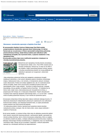 Warszawa: nowatorska operacja w Szpitalu Enel-Med - Zarządzanie - Czytaj - zdrowie.abc.com.pl Wyszukaj: Strona główna Wiedza Prawo i opinie Narzędzia Księgarnia Partnerzy GRC Zgodność Ryzyko Ład Strona główna » Wiedza » Zarządzanie » Warszawa: nowatorska operacja w Szpitalu EnelMed AAA Podziel się ▼ Warszawa: nowatorska operacja w Szpitalu Enel-Med W warszawskim Szpitalu Centrum Medycznego Enel-Med została przeprowadzona nowatorska operacja stawu kolanowego. Dr Adrian Rymarczyk po raz pierwszy w Polsce wprowadził endoprotezę połowiczą powierzchniową UniCap, dzięki której możliwa jest odbudowa tylko uszkodzonej chrząstki, bez wycinania kości, a poprzez osadzenie w niej specjalnej śruby. Innowacyjna proteza daje nowe możliwości pacjentom cierpiącym na chorobę zwyrodnieniową stawów. Osteoartroza jest najczęstszą chorobą stawów prowadzącą do niesprawności układu ruchu. Przez WHO uważana jest za chorobę cywilizacyjną. Szacuje się, że cierpi na nią około 2 mln Polaków. Dzięki nowoczesnej protezie UniCap, pacjenci z chorobą zwyrodnieniową stawów nie muszą poddawać się radykalnym operacjom ani rezygnować z aktywności fot. Thinkstock sportowej. - Ideą endoprotezy połowiczej UniCap jest zastąpienie uszkodzonej chrząstki metalowym elementem, a tym samym odbudowa jedynie chorobowo zmienionego miejsca. Zastosowanie śruby, a nie cementu, w komponencie udowym zmniejsza ryzyko obluzowania. Proteza zaś zostaje zagłębiona tak, aby nie wystawała ponad zdrową chrząstkę, dzięki czemu przywracamy prawidłową budowę stawu bez wprowadzania zmian w jego anatomii – tłumaczy dr Adrian Rymarczyk, ortopeda traumatolog, chirurg operator ze Szpitala Centrum Enel-Med. - W metodzie tej nie tniemy kości, dzięki czemu rekonwalescencja jest niewspółmiernie krótsza, a pooperacyjny ból mniejszy niż w tradycyjnej endoprotezie. Pacjent zdecydowanie wcześniej może rozpocząć obciążanie operowanego stawu, a co za tym idzie i szybciej wrócić do pełnej sprawności fizycznej, w tym również do uprawiania sportu. Innowacyjna endoproteza UniCap daje także większe możliwości dalszego leczenia. W dotychczas stosowanych endoprotezach połowiczych (częściowych) oraz całkowitych konieczna była resekcja, czyli amputacja końcówki kości, co często powodowało zmianę anatomii oraz dużą traumę dla pacjenta. - Po tradycyjnej protezie możemy zaproponować pacjentowi jedynie bardziej rozbudowane protezy rewizyjne. Gdy nie tniemy kości, mamy więcej możliwości – wyjaśnia dr Rymarczyk. Na tej samej zasadzie, co protezę UniCap, która służy do odbudowy powierzchni główki kości udowej i powierzchni stawowej piszczeli z zachowaniem łąkotki, wprowadza się również protezę HemiCap. Jest to równie innowacyjna endoproteza, która ze względu na odmienny kształt (nie płaski, a wklęsły) odbudowuje powierzchnię stawu rzepkowoudowego zniszczonego chorobą zwyrodnieniową, w następstwie urazu czy nawykowego zwichnięcia rzepki. Stosuje się ją na przykład u pacjentów, u których poprzednie operacje (np. artroskopia) skończyły się niepowodzeniem. http://www.zdrowie.abc.com.pl/czytaj/-/artykul/warszawa-nowatorska-operacja-w-szpitalu-enel-med[2015-04-23 11:30:10]