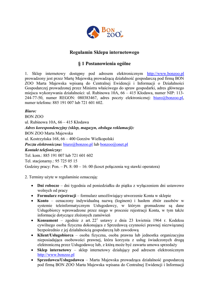 Regulamin Sklepu internetowego § 1 Postanowienia ogólne 1. Sklep internetowy dostępny pod adresem elektronicznym http://www.bonzoo.pl prowadzony jest przez Martę Majewską prowadzącą działalność gospodarczą pod firmą BON ZOO Marta Majewska wpisaną do Centralnej Ewidencji i Informacji o Działalności Gospodarczej prowadzonej przez Ministra właściwego do spraw gospodarki, adres głównego miejsca wykonywania działalności: ul. Rubinowa 10A, 66 – 415 Kłodawa, numer NIP: 113244-77-50, numer REGON: 080383467, adres poczty elektronicznej: [email protected], numer telefonu: 885 191 007 lub 721 601 602. Biuro: BON ZOO ul. Rubinowa 10A, 66 – 415 Kłodawa Adres korespondencyjny (sklep, magazyn, obsługa reklamacji): BON ZOO Marta Majewska ul. Kostrzyńska 168, 66 – 400 Gorzów Wielkopolski Poczta elektroniczna: [email protected] lub [email protected] Kontakt telefoniczny: Tel. kom.: 885 191 007 lub 721 601 602 Tel. stacjonarny.: 95 725 05 15 Godziny pracy: Pon. – Pt. 8: 00 – 16: 00 (koszt połączenia wg stawki operatora) 2. Terminy użyte w regulaminie oznaczają: Dni robocze – dni tygodnia od poniedziałku do piątku z wyłączeniem dni ustawowo wolnych od pracy Formularz rejestracji – formularz umożliwiający utworzenie Konta w sklepie Konto – oznaczony indywidualną nazwą (loginem) i hasłem zbiór zasobów w systemie teleinformatycznym Usługodawcy, w którym gromadzone są dane Usługobiorcy wprowadzone przez niego w procesie rejestracji Konta, w tym także informacje dotyczące złożonych zamówień Konsument – zgodnie z art. 221 ustawy z dnia 23 kwietnia 1964 r. Kodeksu cywilnego osoba fizyczna dokonująca z Sprzedawcą czynności prawnej niezwiązanej bezpośrednio z jej działalnością gospodarczą lub zawodową Klient/Usługobiorca – osoba fizyczna, osoba prawna lub jednostka organizacyjna nieposiadająca osobowości prawnej, która korzysta z usług świadczonych drogą elektroniczną przez Usługodawcę lub, z którą może być zawarta umowa sprzedaży Sklep internetowy – sklep internetowy działający pod adresem elektronicznym http://www.bonzoo.pl Sprzedawca/Usługodawca – Marta Majewska prowadząca działalność gospodarczą pod firmą BON ZOO Marta Majewska wpisana do Centralnej Ewidencji i Informacji o Działalności Gospodarczej prowadzonej przez ministra właściwego do spraw gospodarki, adres głównego miejsca wykonywania działalności: ul. Rubinowa 10A, 66 – 415 Kłodawa, numer NIP: 113-244-77-50, numer REGON: 080383467, adres poczty elektronicznej: [email protected] lub [email protected] numer telefonu: 885 191 007 lub 721 601 602. 3. Usługodawca świadczy usługi drogą elektroniczną zgodnie z zasadami i warunkami określonymi w niniejszym regulaminie. Regulamin jest udostępniony nieodpłatnie za pośrednictwem Sklepu internetowego, w formie umożliwiającej jego pozyskanie, odtworzenie i utrwalenie regulaminu za pomocą systemu teleinformatycznego, którym posługuje się Usługobiorca. Pobranie regulaminu w formacie PDF wymaga posiadania oprogramowania obsługującego pliki PDF – program można pobrać ze strony internetowej http://get.adobe.com/pl/reader 4. Usługodawca świadczy za pośrednictwem Sklepu internetowego następujące usługi: rejestracja i udostępnienie funkcjonalności Konta dla Usługobiorców, złożenie zamówienia za pośrednictwem Formularza zamówienia, usługi dodatkowe: „Newsletter”. 5. W sprawach nieuregulowanych niniejszym regulaminem zastosowanie znajdą przepisy powszechnie obowiązującego prawa polskiego, w szczególności ustawy z dnia 18 lipca 2002 r. o świadczeniu usług drogą elektroniczną (Dz.U. 2002 nr 144 poz. 1204), ustawy z dnia 30 maja 2014 r. o prawach konsumenta (Dz.U. 2014 r. poz. 827 ze zm.), ustawy z dnia 23 kwietnia 1964 r. Kodeks cywilny (Dz.U. nr 16, poz. 93 z późn. zm.), ustawy z dnia 29 sierpnia 1997 r. o ochronie danych osobowych (Dz.U. 1997 nr 131, poz. 883 z późn. zm.) oraz inne właściwe przepisy. § 2 Warunki świadczenia usług drogą elektroniczną 1. Świadczenie usług drogą elektroniczną odbywa się 24 godziny na dobę przez 7 dni w tygodniu. Warunkiem korzystania z usług Sklepu internetowego jest: posiadanie komputera stacjonarnego, laptopa lub innego urządzenia multimedialnego, aktywne połączenie z siecią Internet zapewniające transmisję danych, aktywne konto poczty elektronicznej, system operacyjny Microsoft Windows XP, 7, 8, 10, Vista, Linux, OsX, Android, przeglądarka internetowa: Chrome, Internet Explorer, Mozilla FireFox, Opera, Safari, włączona obsługa apletu JavaScript, plików Cookies, minimalna rozdzielczość ekranu: 1024 x 768 pikseli lub wyższa. 2. W przypadku korespondencji otrzymywanej za pośrednictwem poczty elektronicznej niezbędne jest posiadanie aktywnego konta poczty e-mail, natomiast w przypadku załączników dostarczanych wraz z pocztą e-mail, programu obsługującego pliki danego typu w szczególności: pdf, doc, docx, jpg. 3. Usługobiorca zobowiązany jest korzystać ze Sklepu internetowego, zgodnie z jego przeznaczeniem i powinien powstrzymywać się od dostarczania treści o charakterze bezprawnym. 4. Usługodawca zwraca szczególną uwagę, iż świadczenie usług drogą elektroniczną wiąże się z zagrożeniem po stronie Usługobiorcy, jako użytkownika korzystającego z sieci Internet. Aby uniknąć zagrożeń bezpośrednio związanych z korzystaniem z sieci Internet podczas zakupów w Sklepie internetowym jak i pozostałych usług świadczonych drogą elektroniczną, Klient powinien stosować odpowiednie oprogramowanie mające na celu stworzenie zabezpieczeń w szczególności zainstalowany program antywirusowy stale aktualizowany a także programy chroniące urządzenie użytkownika przed nieautoryzowanym dostępem osób trzecich. § 3 Warunki zawarcia i rozwiązania umowy o świadczenie usługi drogą elektroniczną polegającej na prowadzeniu Konta 1. Umowa o świadczenie usługi drogą ele