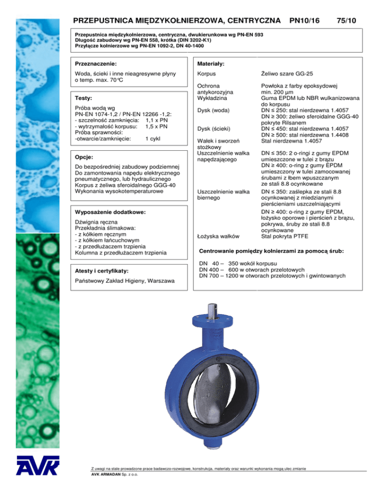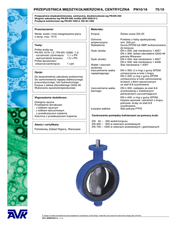 PRZEPUSTNICA MIĘDZYKOŁNIERZOWA, CENTRYCZNA PN10/16 75/10 Przepustnica międzykołnierzowa, centryczna, dwukierunkowa wg PN-EN 593 Długość zabudowy wg PN-EN 558, krótka (DIN 3202-K1) Przyłącze kołnierzowe wg PN-EN 1092-2, DN 40-1400 Przeznaczenie: Materiały: Woda, ścieki i inne nieagresywne płyny o temp. max. 70°C Korpus Żeliwo szare GG-25 Ochrona antykorozyjna Wykładzina Powłoka z farby epoksydowej min. 200 µm Guma EPDM lub NBR wulkanizowana do korpusu DN ≤ 250: stal nierdzewna 1.4057 DN ≥ 300: żeliwo sferoidalne GGG-40 pokryte Rilsanem DN ≤ 450: stal nierdzewna 1.4057 DN ≥ 500: stal nierdzewna 1.4408 Stal nierdzewna 1.4057 Testy: Próba wodą wg PN-EN 1074-1,2 / PN-EN 12266 -1,2: - szczelność zamknięcia: 1,1 x PN - wytrzymałość korpusu: 1,5 x PN Próba sprawności: -otwarcie/zamknięcie: 1 cykl Opcje: Do bezpośredniej zabudowy podziemnej Do zamontowania napędu elektrycznego pneumatycznego, lub hydraulicznego Korpus z żeliwa sferoidalnego GGG-40 Wykonania wysokotemperaturowe Dysk (woda) Dysk (ścieki) Wałek i sworzeń stożkowy Uszczelnienie wałka napędzającego Uszczelnienie wałka biernego Wyposażenie dodatkowe: Dźwignia ręczna Przekładnia ślimakowa: - z kółkiem ręcznym - z kółkiem łańcuchowym - z przedłużaczem trzpienia Kolumna z przedłużaczem trzpienia Atesty i certyfikaty: Łożyska wałków DN ≤ 350: 2 o-ringi z gumy EPDM umieszczone w tulei z brązu DN ≥ 400: o-ring z gumy EPDM umieszczony w tulei zamocowanej śrubami z łbem wpuszczanym ze stali 8.8 ocynkowane DN ≤ 350: zaślepka ze stali 8.8 ocynkowanej z miedzianymi pierścieniami uszczelniającymi DN ≥ 400: o-ring z gumy EPDM, łożysko oporowe i pierścień z brązu, pokrywa, śruby ze stali 8.8 ocynkowane Stal pokryta PTFE Centrowanie pomiędzy kołnierzami za pomocą śrub: DN 40 – 350 wokół korpusu DN 400 – 600 w otworach przelotowych DN 700 – 1200 w otworach przelotowych i gwintowanych Państwowy Zakład Higieny, Warszawa Z uwagi na stale prowadzone prace badawczo-rozwojowe, konstrukcja, materiały oraz warunki wykonania mogą ulec zmianie AVK ARMADAN Sp. z o.o. PRZEPUSTNICA MIĘDZYKOŁNIERZOWA, CENTRYCZNA PN10/16 75/10 Przepustnica międzykołnierzowa, centryczna, dwukierunkowa wg PN-EN 593 Długość zabudowy wg PN-EN 558, krótka (DIN 3202-K1) Przyłącze kołnierzowe wg PN-EN 1092-2, DN 40-1400 Wykaz elementów budowy: 1. Wałek napędzający 2.Tuleja oporowa o-ringów 3.O-ring 4. Korpus 5. Łożysko ślizgowe 6.Sworzeń stożkowy 7. Dysk 8. Wałek bierny 9. Wykładzina 10. Łożysko ślizgowe 11. Pierścień uszczelniający 12. Zaślepka 13. Śruba 14. Pierścień 15. O-ring 16. Łożysko oporowe 17. Pokrywa 18. Śruba ds Górny kołnierz Nr kat. 75-0050-10-111005600000 75-0065-10-111005600000 75-0080-10-111005600000 75-0100-10-111005600000 75-0125-10-111005600000 75-0150-10-111005600000 75-0200-10-111001300000 75-0250-10-111001300000 75-0300-10-115101300000 75-0350-10-115101300000 75-0400-10-115101300000 75-0450-10-115101300000 75-0500-10-115101300000 75-0600-10-115101300000 75-0600-10-115101300000 75-0700-10-115101300000 75-0800-10-115101300000 75-0900-10-115101300000 75-1000-10-115101300000 75-1200-10-115101300000 75-1400-10-115101300000 Większe średnice na zapytanie DN 50 65 80 100 125 150 200 250 300 350 400 450 500 600 700 750 800 900 1000 1200 1400 A mm 50 65 80 100 125 150 200 250 300 336 386 436 486 586 686 736 786 886 986 1186 1386 B mm 100 115 130 150 182 210 262 315 371 405 470 522 576 672 776 826 880 980 1085 1300 1500 C mm 43 46 46 52 56 56 60 68 78 78 102 114 127 154 165 190 190 203 216 254 250 D mm 63 71 78 96 109 133 158 194 219 256 308 334 360 426 480 520 525 635 685 870 980 E mm 118 126 133 147 160 180 204 245 270 315 363 388 413 510 560 585 610 690 740 855 955 F mm 12 12 12 12 12 14 14 15 15 15 25 25 25 25 25 25 25 30 30 35 35 G mm 34 34 34 34 34 34 34 45 45 45 50 50 50 50 60 60 60 90 90 85 100 H mm 10 10 10 12 12 16 16 24 24 24 30 30 30 40 46 46 46 60 60 75 90 J mm 18 18 18 22 22 30 30 38 38 38 90 90 90 100 110 110 110 130 130 - K mm 70 70 70 70 70 70 70 102 102 102 140 140 140 140 165 165 165 254 254 298 356 L mm 90 90 90 90 90 90 90 125 125 125 175 175 175 175 210 210 210 300 300 415 415 ds mm 9 9 9 9 9 9 9 11 11 11 17 17 17 17 21 21 21 17 17 21 31 otwory 4 4 4 4 4 4 4 4 4 4 4 4 4 4 4 4 4 8 8 8 8 ISO 5211 F07 F07 F07 F07 F07 F07 F07 F10 F10 F10 F14 F14 F14 F14 F16 F16 F16 F25 F25 F30 F35 Waga kg/szt. 2,6 3,2 3,5 4,5 6,3 8,8 13,2 22 32 40 75 90 120 180 295 325 345 475 635 1300 1700