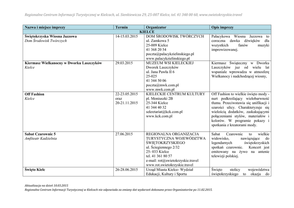 Regionalne Centrum Informacji Turystycznej w Kielcach, ul. Sienkiewicza 29, 25-007 Kielce, tel. 41 348 00 60, www.swietokrzyskie.travel Nazwa i miejsce imprezy Organizator KIELCE 14-15.03.2015 DOM ŚRODOWISK TWÓRCZYCH ul. Zamkowa 5 25-009 Kielce 41 368 20 54 [email protected] www.palacykzielinskiego.pl 29.03.2015 MUZEUM WSI KIELECKIEJ Dworek Laszczyków ul. Jana Pawła II 6 25-025 41 344 50 06 [email protected] www.mwk.com.pl 22-23.05.2015 KIELECKIE CENTRUM KULTURY oraz pl. Moniuszki 2B 20-21.11.2015 25-344 Kielce 41 344 40 32 [email protected] www.kck.com.pl Opis imprezy Sabat Czarownic 5 Amfiteatr Kadzielnia 27.06.2015 Sabat Czarownic to wielkie widowisko, nawiązujące do legendarnych świętokrzyskich spotkań czarownic. Koncert jest emitowany na żywo na antenie telewizji polskiej. Święto Kielc 26-28.06.2015 Świętokrzyska Wiosna Jazzowa Dom Środowisk Twórczych Kiermasz Wielkanocny w Dworku Laszczyków Kielce Off Fashion Kielce Termin REGIONALNA ORGANIZACJA TURYSTYCZNA WOJEWÓDZTWA ŚWIĘTOKRZYSKIEGO ul. Ściegiennego 2/32 25- 033 Kielce tel. 41 361 80 57 e-mail: [email protected] www.rot.swietokrzyskie.travel Urząd Miasta Kielce- Wydział Edukacji, Kultury i Sportu Pałacykowa Wiosna Jazzowa to coroczna dawka dźwięków dla wszystkich fanów muzyki improwizowanej. Kiermasz Świąteczny w Dworku Laszczyków juz od wielu lat wspaniale wprowadza w atmosferę Wielkanocy i nadchodzącej wiosny, Off Fashion to wielkie święto mody nurt podkreślający wielobarwność tłumu. Przeciwstawia się unifikacji i szarości ulicy. Charakteryzuje się wielością dodatków, zaskakującymi połączeniami stylów, materiałów i kolorów. W programie pokazy i spotkania z kreatorami mody. Święto stolicy województwa świętokrzyskiego to okazja do Aktualizacja na dzień 10.03.2015 Regionalne Centrum Informacji Turystycznej w Kielcach nie odpowiada za zmiany dat wydarzeń dokonane przez Organizatorów po 11.02.2015. Regionalne Centrum Informacji Turystycznej w Kielcach, ul. Sienkiewicza 29, 25-007 Kielce, tel. 41 348 00 60, www.swietokrzyskie.travel ul. Strycharska 6 25-659 Kielce tel. 41 367 66 26 www.um.kielce.pl Harcerski Festiwal Kultury Młodzieży Szkolnej Kielce 12-26.07.2015 Memorial to Miles: Targi Kielce Jazz Festival Kieleckie Centrum Kultury 25-27.09.2015 Zaduszki Jazzowe Dom Środowisk Twórczych 11.2015 Festiwal Form Dokumentalnych Nurt 2015 Kieleckie Centrum Kultury 24-27.11.2015 ZWIĄZEK HARCERSTWA POLSKIEGO CHORĄGIEW KIELECKA ul. Pańska 1a 25-820 Kielce 41 344 65 55 [email protected] www.kielecka.zhp.pl KIELECKIE CENTRUM KULTURY pl. Moniuszki 2B 25-344 Kielce 41 344 40 32 [email protected] www.kck.com.pl DOM ŚRODOWISK TWÓRCZYCH ul. Zamkowa 5 25-009 Kielce 41 368 20 54 [email protected] www.palacykzielinskiego.pl KIELECKIE CENTRUM KULTURY pl. Moniuszki 2B 25-344 Kielce 41 344 40 32 [email protected] poznania oferty kulturalnej miasta, wzięcia udziału pokazach i koncertach oraz skosztowania przysmaków podczas jarmarku na ulicy Sienkiewicza – głównym deptaku miasta. Największa w Europie impreza artystyczna dla dzieci i młodzieży. Wypoczynek połączony z doskonaleniem umiejętności i zdobywaniem nagród festiwalowych: Złotych, Srebrnych i Brązowych „Jodeł”. Jedna z ważniejszych imprez jazzowych na artystycznej mapie Polski o charakterze międzynarodowym. Festiwal, na którym prezentowany jest zarówno jazz tradycyjny, jak i różnorodne trendy i odmiany pojawiające się w tej muzyce na przestrzeni ostatnich lat. Pałacykowe Zaduszki to coroczna dawka dźwięków dla wszystkich fanów muzyki improwizowanej. Impreza służy ocaleniu od zapomnienia i popularyzacji wartościowych pozycji dokumentalistów, które sprawdzić się mogą dopiero w zetknięciu z Aktualizacja na dzień 10.03.2015 Regionalne Centrum Informacji Turystycznej w Kielcach nie odpowiada za zmiany dat wydarzeń dokonane przez Organizatorów po 11.02.2015. Regionalne Centrum Informacji Turystycznej w Kielcach, ul. Sienkiewicza 29, 25-007 Kielce, tel. 41 348 00 60, www.swietokrzyskie.travel www.kck.com.pl Bożonarodzeniowy kiermasz świąteczny w Dworku Laszczyków Dworek Laszczyków Festiwal Pieśni Wielkopostnych – finał Daleszyce, Parafia p.w. św. Michała Archanioła ul. Kościelna 1a 13.12.2015 MUZEUM WSI KIELECKIEJ Dworek Laszczyków ul. Jana Pawła II 6 25-025 41 344 50 06 [email protected] www.mwk.com.pl POWIAT KIELECKI 22.03.2015 WOJEWÓDZKI DOM KULTURY ul. Ściegiennego 2 25-033 41 365 51 44 www.wdk-kielce.pl Unijny Maraton Pieszy po Górach Świętokrzyskich Góry Świętokrzyskie 30.04.01.05.2015 PTTK ODDZIAŁ ŚWIĘTOKRZYSKI W KIELCACH ul. Sienkiewicza 29 25-007 Kielce tel. 41 344 77 43 [email protected] www.pttkkielce.pl 25-Świetokrzyska Góry Świętokrzyskie 28.03.2015 Zarząd Oddziału Świętokrzyskiego PTTK w Kielcach ul. Sienkiewicza 29 25-007 Kielce tel.41 344 77 43 www.pttkkielce.pl odbiorcą. Pragniemy, aby te różnorodne formy dokumentalne uzyskały należne im spectrum. Kiermasz świąteczny w Dworku Laszczyków juz od wielu lat wspaniale wprowadza w atmosferę Bożego Narodzenia. Jak co roku będzie wspólne kolędowanie i próbowanie tradycyjnych, wigilijnych potraw. Podczas Festiwalu można usłyszeć najpiękniejsze pieśni pasyjne w wykonaniu świętokrzyskich artystów – chórów, zespołów ludowych, wokalnych i wokalnoinstrumentalnych. Maraton Pieszy po Górach Świętokrzyskich to cykliczna impreza organizowana z okazji przystąpienia Polski do Unii Europejskiej. Rajd to nic innego jak ekstremalny supermaraton o tytuł i statuetkę "Twardziela Świętokrzyskiego". 25-tka Świętokrzyska jest ogólnodostępną indywidualną imprezą turystyczno – wytrzymałościową. Trasa o długości około 25 km przebiega przez malownicze tereny Gór Świętokrzyskich i wymaga od uczestników dobrej zaprawy w turystyce pieszej. Impreza kończy się Aktualizacja na dzień 10.03.2015 Regionalne Centrum Informacji Turystycznej w Kielcach nie odpowiada za zmiany d