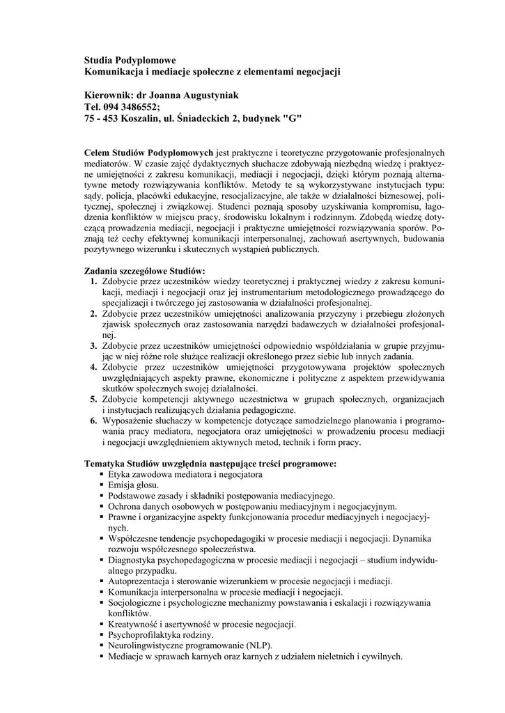 Studia Podyplomowe Komunikacja i mediacje społeczne z elementami negocjacji Kierownik: dr Joanna Augustyniak Tel. 094 3486552; 75 - 453 Koszalin, ul. Śniadeckich 2, budynek "G" Celem Studiów Podyplomowych jest praktyczne i teoretyczne przygotowanie profesjonalnych mediatorów. W czasie zajęć dydaktycznych słuchacze zdobywają niezbędną wiedzę i praktyczne umiejętności z zakresu komunikacji, mediacji i negocjacji, dzięki którym poznają alternatywne metody rozwiązywania konfliktów. Metody te są wykorzystywane instytucjach typu: sądy, policja, placówki edukacyjne, resocjalizacyjne, ale także w działalności biznesowej, politycznej, społecznej i związkowej. Studenci poznają sposoby uzyskiwania kompromisu, łagodzenia konfliktów w miejscu pracy, środowisku lokalnym i rodzinnym. Zdobędą wiedzę dotyczącą prowadzenia mediacji, negocjacji i praktyczne umiejętności rozwiązywania sporów. Poznają też cechy efektywnej komunikacji interpersonalnej, zachowań asertywnych, budowania pozytywnego wizerunku i skutecznych wystąpień publicznych. Zadania szczegółowe Studiów: 1. Zdobycie przez uczestników wiedzy teoretycznej i praktycznej wiedzy z zakresu komunikacji, mediacji i negocjacji oraz jej instrumentarium metodologicznego prowadzącego do specjalizacji i twórczego jej zastosowania w działalności profesjonalnej. 2. Zdobycie przez uczestników umiejętności analizowania przyczyny i przebiegu złożonych zjawisk społecznych oraz zastosowania narzędzi badawczych w działalności profesjonalnej. 3. Zdobycie przez uczestników umiejętności odpowiednio współdziałania w grupie przyjmując w niej różne role służące realizacji określonego przez siebie lub innych zadania. 4. Zdobycie przez uczestników umiejętności przygotowywana projektów społecznych uwzględniających aspekty prawne, ekonomiczne i polityczne z aspektem przewidywania skutków społecznych swojej działalności. 5. Zdobycie kompetencji aktywnego uczestnictwa w grupach społecznych, organizacjach i instytucjach realizujących działania pedagogiczne. 6. Wyposażenie słuchaczy w kompetencje dotyczące samodzielnego planowania i programowania pracy mediatora, negocjatora oraz umiejętności w prowadzeniu procesu mediacji i negocjacji uwzględnieniem aktywnych metod, technik i form pracy. Tematyka Studiów uwzględnia następujące treści programowe: Etyka zawodowa mediatora i negocjatora Emisja głosu. Podstawowe zasady i składniki postępowania mediacyjnego. Ochrona danych osobowych w postępowaniu mediacyjnym i negocjacyjnym. Prawne i organizacyjne aspekty funkcjonowania procedur mediacyjnych i negocjacyjnych. Współczesne tendencje psychopedagogiki w procesie mediacji i negocjacji. Dynamika rozwoju współczesnego społeczeństwa. Diagnostyka psychopedagogiczna w procesie mediacji i negocjacji – studium indywidualnego przypadku. Autoprezentacja i sterowanie wizerunkiem w procesie negocjacji i mediacji. Komunikacja interpersonalna w procesie mediacji i negocjacji. Socjologiczne i psychologiczne mechanizmy powstawania i eskalacji i rozwiązywania konfliktów. Kreatywność i asertywność w procesie negocjacji. Psychoprofilaktyka rodziny. Neurolingwistyczne programowanie (NLP). Mediacje w sprawach karnych oraz karnych z udziałem nieletnich i cywilnych. Mediacje w sprawach rodzinnych. Psychopatologia społeczna. Trening kontroli emocji. Mediacje i negocjacje pracownicze, gospodarcze, akademickie, szkolne rówieśnicze i oświatowe. Trening praktycznych umiejętności prowadzenia mediacji i negocjacji. Trening komunikacji interpersonalnej w procesie mediacji i negocjacji. Założenia organizacyjne: 1. Studia trwają 3 semestry. 2. Program przewiduje 390 godzin (105 godzin wykładów / 285 godzin ćwiczeń, treningów i zajęć warsztatowych). 3. Absolwenci Studiów otrzymują: Dyplom ukończenia Studiów Podyplomowych. Absolwenci studiów posiadają kwalifikacje do wykonywania zawodu mediatora w sprawach karnych, karnych z udziałem nieletnich i cywilnych i mogą pracować m. in. jako zawodowi mediatorzy sądowi, mediatorzy placówek pomocy społecznej, instytucji oświatowych, negocjatorzy gospodarczy i społeczni, członkowie sztabów kryzysowych, konsultacji organizacji społecznych, politycznych, rządowych i pozarządowych. 4. Wymagania wstępne: Wykształcenie wyższe magisterskie lub licencjackie. Adresatami są absolwenci kierunków studiów: prawa, ekonomii i zarządzania, resocjalizacji, psychologii i pedagogiki (o specjalnościach: Pedagogika resocjalizacyjna, Prewencja patologii i zagrożeń społecznych, Psychopedagogika itp.). 5. Wymagane dokumenty: odpis dyplomu ukończenia studiów wyższych, podanie, kwestionariusz osobowy, 2 zdjęcia. 6. Opłata za studia w roku akademickim 2012 / 2013 wynosi 1200 zł za semestr. Dokumenty można przesyłać listem poleconym na adres: Politechnika Koszalińska Instytut Technologii i Edukacji ul. Śniadeckich 2, 75 - 453 Koszalin lub złożyć w siedzibie Instytutu na ul. Śniadeckich 2 , budynek "G" pok. 101 G