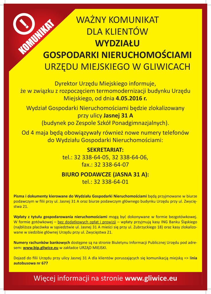 WAŻNY KOMUNIKAT DLA KLIENTÓW WYDZIAŁU GOSPODARKI NIERUCHOMOŚCIAMI URZĘDU MIEJSKIEGO W GLIWICACH Dyrektor Urzędu Miejskiego informuje, że w związku z rozpoczęciem termomodernizacji budynku Urzędu Miejskiego, od dnia 4.05.2016 r. Wydział Gospodarki Nieruchomościami będzie zlokalizowany przy ulicy Jasnej 31 A (budynek po Zespole Szkół Ponadgimnazjalnych). Od 4 maja będą obowiązywały również nowe numery telefonów do Wydziału Gospodarki Nieruchomościami: SEKRETARIAT: tel.: 32 338-64-05, 32 338-64-06, fax.: 32 338-64-07 BIURO PODAWCZE (JASNA 31 A): tel.: 32 338-64-01 Pisma i dokumenty kierowane do Wydziału Gospodarki Nieruchomościami będą przyjmowane w biurze podawczym w filii przy ul. Jasnej 31 A oraz biurze podawczym głównego budynku Urzędu przy ul. Zwycięstwa 21. Wpłaty z tytułu gospodarowania nieruchomościami mogą być dokonywane w formie bezgotówkowej. W formie gotówkowej – bez dodatkowych opłat i prowizji – wpłaty przyjmują kasy ING Banku Śląskiego (najbliższa placówka w sąsiedztwie ul. Jasnej 31 A mieści się przy ul. Zubrzyckiego 18) oraz kasy zlokalizowane w siedzibie głównej Urzędu przy ul. Zwycięstwa 21. Numery rachunków bankowych dostępne są na stronie Biuletynu Informacji Publicznej Urzędu pod adresem: www.bip.gliwice.eu w zakładce URZĄD MIEJSKI. Dojazd do filii Urzędu przy ulicy Jasnej 31 A dla klientów poruszających się komunikacją miejską => linia autobusowa nr 677 Więcej informacji na stronie www.gliwice.eu
