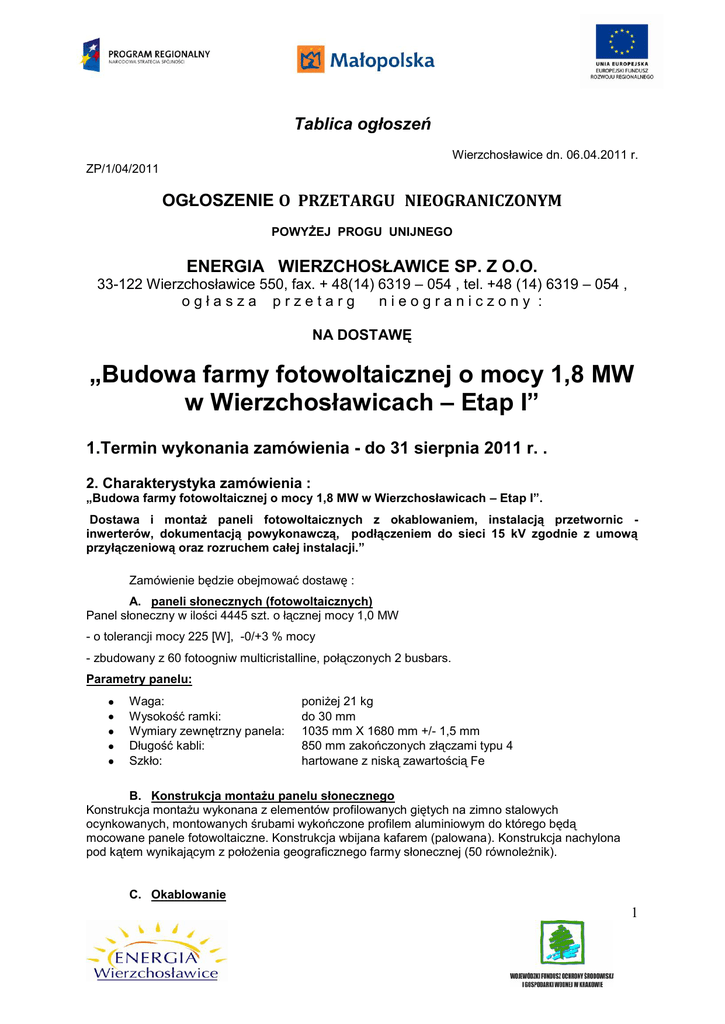 Tablica ogłoszeń Wierzchosławice dn. 06.04.2011 r. ZP/1/04/2011 OGŁOSZENIE O PRZETARGU NIEOGRANICZONYM POWYŻEJ PROGU UNIJNEGO ENERGIA WIERZCHOSŁAWICE SP. Z O.O. 33-122 Wierzchosławice 550, fax. + 48(14) 6319 – 054 , tel. +48 (14) 6319 – 054 , ogłasza przetarg nieograniczony : NA DOSTAWĘ „Budowa farmy fotowoltaicznej o mocy 1,8 MW w Wierzchosławicach – Etap I” 1.Termin wykonania zamówienia - do 31 sierpnia 2011 r. . 2. Charakterystyka zamówienia : „Budowa farmy fotowoltaicznej o mocy 1,8 MW w Wierzchosławicach – Etap I”. Dostawa i montaż paneli fotowoltaicznych z okablowaniem, instalacją przetwornic inwerterów, dokumentacją powykonawczą, podłączeniem do sieci 15 kV zgodnie z umową przyłączeniową oraz rozruchem całej instalacji.” Zamówienie będzie obejmować dostawę : A. paneli słonecznych (fotowoltaicznych) Panel słoneczny w ilości 4445 szt. o łącznej mocy 1,0 MW - o tolerancji mocy 225 [W], -0/+3 % mocy - zbudowany z 60 fotoogniw multicristalline, połączonych 2 busbars. Parametry panelu: Waga: Wysokość ramki: Wymiary zewnętrzny panela: Długość kabli: Szkło: poniżej 21 kg do 30 mm 1035 mm X 1680 mm +/- 1,5 mm 850 mm zakończonych złączami typu 4 hartowane z niską zawartością Fe B. Konstrukcja montażu panelu słonecznego Konstrukcja montażu wykonana z elementów profilowanych giętych na zimno stalowych ocynkowanych, montowanych śrubami wykończone profilem aluminiowym do którego będą mocowane panele fotowoltaiczne. Konstrukcja wbijana kafarem (palowana). Konstrukcja nachylona pod kątem wynikającym z położenia geograficznego farmy słonecznej (50 równoleżnik). C. Okablowanie 1 Kable do instalacji solarnych z żyłą miedziową kat 5 wg normy IEC 60228 Zakres napięciowy do 1,8 kV DC o o Zakres pracy w temperaturze od -40 C do +85 C Z powłoką bezhalogenową zgodnie z normą EN- 50267-2-1 i EN 60684-2 Złącza: a) DATASHEET SOLINQ® 4mm porównywalnych parametrach SILVERLINE Connector lub równoważne o lub DATASHEET SOLINQ® 4mm GOLDENLINE Connector lub równoważne o porównywalnych parametrach b) DATASHEET SOLINQ® 4mm Branche Connector lub równoważne o porównywalnych parametrach c) DATASHEET SOLINQ® 4mm GOLDENLINE Branche Connector lub równoważne o porównywalnych parametrach D. Przetwornice – inwertery Dostawa dwóch lub jeżeli będzie technicznie uzasadnione dopuszcza się zastosowanie innej liczby inwerterów, Wejściowy zakres napięciowy 450-750 Vdc, Maksymalne napięcie wejściowe nie mniejsze niż 900 Vdc, Napięcie wyjściowe 300 Vac, E. Transformatory suche nn/SN Parametry znamionowe: Typ: żywiczny niskostratny, podwyższający napięcie, Maksymalne straty jałowe (pomierzone) [W] <2300, o Maksymalne straty obciążeniowe przy 75 C (pomierzone) [W] < 13500, Wymagania konstrukcyjne: Trójstopniowy układ kontroli temperatury, CPV: Główne: 09331200 – Słoneczne moduły fotoelektryczne Dodatkowe: 09332000 – Instalacje słoneczne 09331000 – Baterie słoneczne 3. Opis warunków udziału w postępowaniu oraz sposobu dokonywania ich oceny: 1. O udzielenie zamówienia mogą ubiegać się Wykonawcy, którzy spełniają warunki określone w art. 22 ust. 1 ustawy Prawo zamówień publicznych (Dz. U. z 2010 r. Nr 113, poz. 759,z późn. zm.), nie podlegają wykluczeniu z postępowania na podstawie art. 24 ust. 1 i 2 w/w ustawy. 2. Posiadają uprawnienia do wykonywania określonej działalności lub czynności, jeżeli przepisy prawa nakładają obowiązek ich posiadania. 3. Posiadają niezbędną wiedzę i doświadczenie. Warunek uważa się za spełniony jeżeli Wykonawca potwierdzi należyte wykonanie instalacji elektroenergetycznych w branży przemysłowej o wartości minimum 3 000 000,00 zł. 4. Dysponują odpowiednim potencjałem technicznym oraz osobami zdolnymi do wykonania 2 zamówienia. 5. Znajdują się w sytuacji ekonomicznej i finansowej zapewniającej wykonanie zamówienia. Warunek uważa się za spełniony jeżeli wykonawca: 1) Potwierdzi wysokość posiadanych środków finansowych lub zdolność kredytową nie mniejszą niż 9 500 000,00 zł. 2) Posiada opłacaną polisę, a w przypadku jej braku inny dokument potwierdzający, że wykonawca jest ubezpieczony od odpowiedzialności cywilnej w zakresie prowadzonej działalności związanej z przedmiotem zamówienia na kwotę co najmniej 2 000 000,00 zł. Jeżeli Wykonawca wykazując spełnienie warunku polega na zdolnościach finansowych innych podmiotów na zasadach określonych w art. 26 ust. 2b ustawy p.z.p., Zamawiający wymaga przedłożenia informacji banku lub spółdzielczej kasy oszczędnościowo-kredytowej, w których Wykonawca posiada rachunek, potwierdzającej wysokość posiadanych środków finansowych lub zdolność kredytową Wykonawcy, wystawionej nie wcześniej niż 3 miesiące przed upływem terminu składania ofert dotyczącej tych podmiotów. 6. Ocena spełniania przedstawionych powyżej warunków zostanie dokonana wg formuły: „spełnia – nie spełnia”. 7. Zamawiający wezwie Wykonawców, którzy w określonym terminie nie złożyli oświadczeń lub dokumentów lub którzy nie złożyli pełnomocnictw albo którzy złożyli wymagane przez Zamawiającego oświadczenia i dokumenty zawierające błędy lub którzy złożyli wadliwe pełnomocnictwa do ich uzupełnienia w wyznaczonym terminie, chyba, że mimo ich złożenia konieczne byłoby unieważnienie postępowania. Złożone na wezwanie zamawiającego oświadczenia i dokumenty powinny potwierdzać spełnienie przez wykonawcę warunków udziału w postępowaniu oraz spełnienie przez oferowane dostawy wymagań określonych przez Zamawiającego nie później niż w dniu, w którym upłynął termin składania ofert. Zamawiający wezwie w wyznaczonym przez siebie terminie do złożenia wyjaśnień dotyczących oświadczeń lub dokumentów, o których mowa w art. 25 ust. 1 ustawy. 8. Nie spełnienie któregokolwiek z wyżej wskazanych warunków skutkować b
