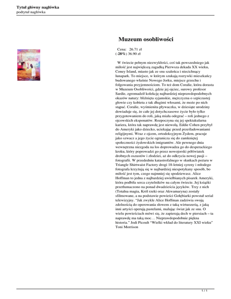 Tytuł główny nagłówka podtytuł nagłówka Muzeum osobliwości Cena: 26.71 zł (-28%) 36.90 zł W świecie pełnym niezwykłości, coś tak powszedniego jak miłość jest największą zagadką Pierwsza dekada XX wieku, Coney Island, miasto jak ze snu szaleńca i niecichnący lunapark. To miejsce, w którym szukają rozrywki mieszkańcy budowanego właśnie Nowego Jorku, miejsce grzechu i folgowania przyjemnościom. To też dom Coralie, która dorasta w Muzeum Osobliwości, gdzie jej ojciec, surowy profesor Sardie, zgromadził kolekcję najbardziej nieprawdopodobnych okazów natury: bliźnięta syjamskie, mężczyzna o szpiczastej głowie czy kobieta z tak długimi włosami, że może po nich stąpać. Coralie, wyśmienita pływaczka, w dziesiąte urodziny dowiaduje się, że całe jej dotychczasowe życie było tylko przygotowaniem do roli, jaką miała odegrać – roli jednego z ojcowskich eksponatów. Rozpoczyna się jej spektakularna kariera, która tak naprawdę jest niewolą. Eddie Cohen przybył do Ameryki jako dziecko, uciekając przed prześladowaniami religijnymi. Wraz z ojcem, ortodoksyjnym Żydem, pracuje jako szwacz a jego życie ogranicza się do zamkniętej społeczności żydowskich imigrantów. Ale pewnego dnia wewnętrzna niezgoda na los doprowadza go do desperackiego kroku, który poprowadzi go przez nowojorski półświatek drobnych oszustów i złodziei, aż do odkrycia nowej pasji – fotografii. W przededniu katastrofalnego w skutkach pożaru w Triangle Shirtwaist Factory drogi 18-letniej syreny i młodego fotografa krzyżują się w najbardziej niespotykany sposób, bo miłość jest tym, czego najmniej się spodziewasz. Alice Hoffman to jedna z najbardziej uwielbianych pisarek Ameryki, która podbiła serca czytelników na całym świecie. Jej książki przetłumaczono na ponad dwadzieścia języków. Trzy z nich (Totalna magia, Król rzeki oraz Akwamaryna) zostały sfilmowane, a na podstawie powieści Gołębiarki powstał serial telewizyjny. “Jak zwykle Alice Hoffman zadziwia swoją zdolnością do operowania słowem z taką wirtuozerią, z jaką inni artyści operują pastelami, malując świat jak ze snu. O wielu powieściach mówi się, że zapierają dech w piersiach – ta naprawdę ma taką moc… Nieprawdopodobnie piękna historia.” Jodi Picoult “Wielki wkład do literatury XXI wieku” Toni Morrison 1/1 Powered by TCPDF (www.tcpdf.org)