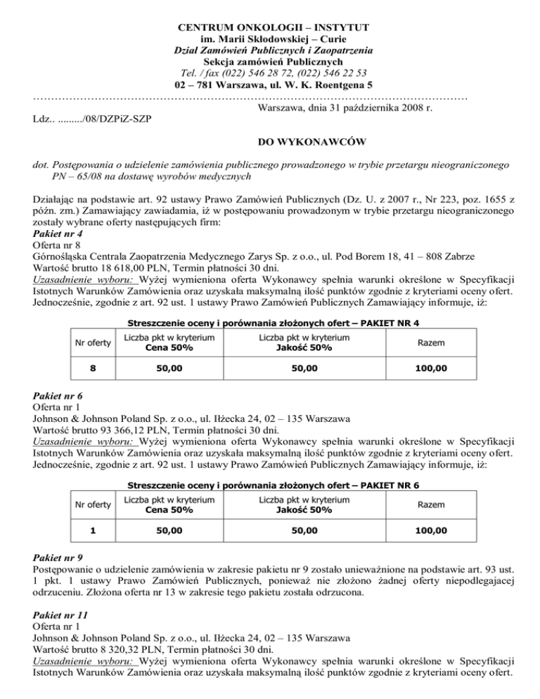 CENTRUM ONKOLOGII – INSTYTUT im. Marii Skłodowskiej – Curie Dział Zamówień Publicznych i Zaopatrzenia Sekcja zamówień Publicznych Tel. / fax (022) 546 28 72, (022) 546 22 53 02 – 781 Warszawa, ul. W. K. Roentgena 5 ………………………………………………………………………………………………………… Warszawa, dnia 31 października 2008 r. Ldz.. ........./08/DZPiZ-SZP DO WYKONAWCÓW dot. Postępowania o udzielenie zamówienia publicznego prowadzonego w trybie przetargu nieograniczonego PN – 65/08 na dostawę wyrobów medycznych Działając na podstawie art. 92 ustawy Prawo Zamówień Publicznych (Dz. U. z 2007 r., Nr 223, poz. 1655 z późn. zm.) Zamawiający zawiadamia, iż w postępowaniu prowadzonym w trybie przetargu nieograniczonego zostały wybrane oferty następujących firm: Pakiet nr 4 Oferta nr 8 Górnośląska Centrala Zaopatrzenia Medycznego Zarys Sp. z o.o., ul. Pod Borem 18, 41 – 808 Zabrze Wartość brutto 18 618,00 PLN, Termin płatności 30 dni. Uzasadnienie wyboru: Wyżej wymieniona oferta Wykonawcy spełnia warunki określone w Specyfikacji Istotnych Warunków Zamówienia oraz uzyskała maksymalną ilość punktów zgodnie z kryteriami oceny ofert. Jednocześnie, zgodnie z art. 92 ust. 1 ustawy Prawo Zamówień Publicznych Zamawiający informuje, iż: Streszczenie oceny i porównania złożonych ofert – PAKIET NR 4 Nr oferty Liczba pkt w kryterium Cena 50% Liczba pkt w kryterium Jakość 50% Razem 8 50,00 50,00 100,00 Pakiet nr 6 Oferta nr 1 Johnson & Johnson Poland Sp. z o.o., ul. Iłżecka 24, 02 – 135 Warszawa Wartość brutto 93 366,12 PLN, Termin płatności 30 dni. Uzasadnienie wyboru: Wyżej wymieniona oferta Wykonawcy spełnia warunki określone w Specyfikacji Istotnych Warunków Zamówienia oraz uzyskała maksymalną ilość punktów zgodnie z kryteriami oceny ofert. Jednocześnie, zgodnie z art. 92 ust. 1 ustawy Prawo Zamówień Publicznych Zamawiający informuje, iż: Streszczenie oceny i porównania złożonych ofert – PAKIET NR 6 Nr oferty Liczba pkt w kryterium Cena 50% Liczba pkt w kryterium Jakość 50% Razem 1 50,00 50,00 100,00 Pakiet nr 9 Postępowanie o udzielenie zamówienia w zakresie pakietu nr 9 zostało unieważnione na podstawie art. 93 ust. 1 pkt. 1 ustawy Prawo Zamówień Publicznych, ponieważ nie złożono żadnej oferty niepodlegajacej odrzuceniu. Złożona oferta nr 13 w zakresie tego pakietu została odrzucona. Pakiet nr 11 Oferta nr 1 Johnson & Johnson Poland Sp. z o.o., ul. Iłżecka 24, 02 – 135 Warszawa Wartość brutto 8 320,32 PLN, Termin płatności 30 dni. Uzasadnienie wyboru: Wyżej wymieniona oferta Wykonawcy spełnia warunki określone w Specyfikacji Istotnych Warunków Zamówienia oraz uzyskała maksymalną ilość punktów zgodnie z kryteriami oceny ofert. Jednocześnie, zgodnie z art. 92 ust. 1 ustawy Prawo Zamówień Publicznych Zamawiający informuje, iż: Streszczenie oceny i porównania złożonych ofert – PAKIET NR 11 Nr oferty Liczba pkt w kryterium Cena 50% Liczba pkt w kryterium Jakość 50% Razem 1 50,00 50,00 100,00 Pakiet nr 12 Postępowanie o udzielenie zamówienia w zakresie pakietu nr 12 zostało unieważnione na podstawie art. 93 ust. 1 pkt. 1 ustawy Prawo Zamówień Publicznych, ponieważ nie złożono żadnej oferty. Pakiet nr 21 Oferta nr 5 - Fabryka Aparatury Rentgenowskiej i Urządzeń Medycznych FARUM S.A., ul. Jagiellońska 74, 03 – 301 Warszawa Wartość brutto 1 600,72 PLN, Termin płatności 30 dni. Uzasadnienie wyboru: Wyżej wymieniona oferta Wykonawcy spełnia warunki określone w Specyfikacji Istotnych Warunków Zamówienia oraz uzyskała maksymalną ilość punktów zgodnie z kryteriami oceny ofert. Jednocześnie, zgodnie z art. 92 ust. 1 ustawy Prawo Zamówień Publicznych Zamawiający informuje, iż: Streszczenie oceny i porównania złożonych ofert – PAKIET NR 21 Nr oferty Liczba pkt w kryterium Cena 50% Liczba pkt w kryterium Jakość 50% Razem 5 50,00 50,00 100,00 Pakiet nr 25 Postępowanie o udzielenie zamówienia w zakresie pakietu nr 25 zostało unieważnione na podstawie art. 93 ust. 1 pkt. 1 ustawy Prawo Zamówień Publicznych, ponieważ nie złożono żadnej oferty niepodlegajacej odrzuceniu. Złożona oferta nr 11 w zakresie tego pakietu została odrzucona. Pozostałe pakiety zostaną rozstrzygnięte w terminie późniejszym ZŁOŻONE OFERTY: 1. Johnson & Johnson Poland Sp. z o.o., ul. Iłżecka 24, 02 – 135 Warszawa 2. STATOR Paweł Kądeja, Ul. Ul. Kordiana 31, 04 – 481 Warszawa 3. Medical Diagnostic System Sp. z o. o., Ul. Poleczki 12, 02 – 822 Warszawa 4. BIALMED Sp. z o.o., Ul. M. Konopnickiej 11a, 12 – 230 Biała Piska 5. Fabryka Aparatury Rentgenowskiej i Urządzeń Medycznych FARUM S.A., Ul. Jagiellońska 74, 03 – 301 Warszawa 6. DEVYMED Sp. z o.o., ul. Obrońców 18, 03 – 933 Warszawa 7. MEDICART Healthcare Sp. z o.o., ul. Poleczki 21, 02- 822 Warszawa 8. Górnośląska centrala Zaopatrzenia Medycznego ZARYS Sp. z o.o., ul. Pod Borem 18, 41 – 808 Zabrze 9. SKAMEX Company Ltd. Sp. z o.o., ul. Częstochowska 38/52, 93 - 121 Łódź 10. NEOMED, ul. Kajki 18, 05 – 501 Piaseczno 11. AESCULAP CHIFA Sp. z o.o., Ul. Tysiąclecia 14, 64 – 300 Nowy Tomyśl 12. BERYL MED. LTD. 72 NEW BOND STREET, MAYFAIR LONDON W1S 1RR UK Adres do korespondencji: Ul. Sadowa 14, 05 – 410 Józefów 13. DR PIKTEL Medical Systems, Ul. Czackiego 2/2, 15 – 268 Białystok 14. OGARIT Sp. z o.o., ul. Ludowa 14, 05 – 092 Łomianki 15. EUMED Sp. z o.o., ul. Chłopickiego 50, 04 - 275 Warszawa 16. COVIDIEN Polska Sp. z o.o., Al. Jerozolimskie 162, 02 – 342 Warszawa Z poważaniem, Z – ca Dyrektora ds. Ekonomiczno – Finansowych Główny Księgowy Centrum Onkologii – Instytut im. Marii Skłodowskiej – Curie mgr Krzysztof Skiba