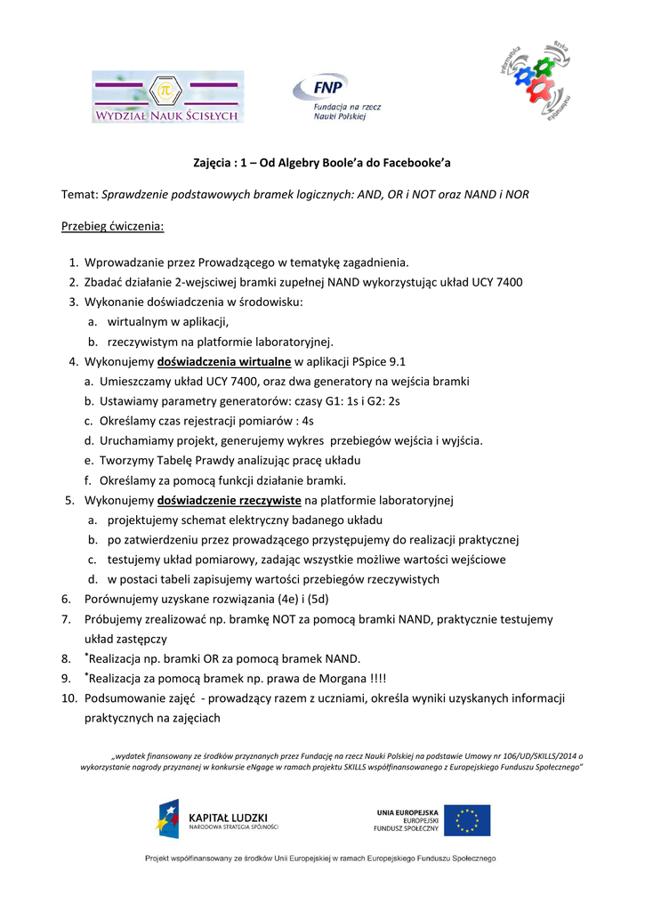 Zajęcia : 1 – Od Algebry Boole’a do Facebooke’a Temat: Sprawdzenie podstawowych bramek logicznych: AND, OR i NOT oraz NAND i NOR Przebieg ćwiczenia: 1. Wprowadzanie przez Prowadzącego w tematykę zagadnienia. 2. Zbadać działanie 2-wejsciwej bramki zupełnej NAND wykorzystując układ UCY 7400 3. Wykonanie doświadczenia w środowisku: a. wirtualnym w aplikacji, b. rzeczywistym na platformie laboratoryjnej. 4. Wykonujemy doświadczenia wirtualne w aplikacji PSpice 9.1 a. Umieszczamy układ UCY 7400, oraz dwa generatory na wejścia bramki b. Ustawiamy parametry generatorów: czasy G1: 1s i G2: 2s c. Określamy czas rejestracji pomiarów : 4s d. Uruchamiamy projekt, generujemy wykres przebiegów wejścia i wyjścia. e. Tworzymy Tabelę Prawdy analizując pracę układu f. Określamy za pomocą funkcji działanie bramki. 5. Wykonujemy doświadczenie rzeczywiste na platformie laboratoryjnej a. projektujemy schemat elektryczny badanego układu b. po zatwierdzeniu przez prowadzącego przystępujemy do realizacji praktycznej c. testujemy układ pomiarowy, zadając wszystkie możliwe wartości wejściowe d. w postaci tabeli zapisujemy wartości przebiegów rzeczywistych 6. Porównujemy uzyskane rozwiązania (4e) i (5d) 7. Próbujemy zrealizować np. bramkę NOT za pomocą bramki NAND, praktycznie testujemy układ zastępczy 8. *Realizacja np. bramki OR za pomocą bramek NAND. 9. *Realizacja za pomocą bramek np. prawa de Morgana !!!! 10. Podsumowanie zajęć - prowadzący razem z uczniami, określa wyniki uzyskanych informacji praktycznych na zajęciach „wydatek finansowany ze środków przyznanych przez Fundację na rzecz Nauki Polskiej na podstawie Umowy nr 106/UD/SKILLS/2014 o wykorzystanie nagrody przyznanej w konkursie eNgage w ramach projektu SKILLS współfinansowanego z Europejskiego Funduszu Społecznego”