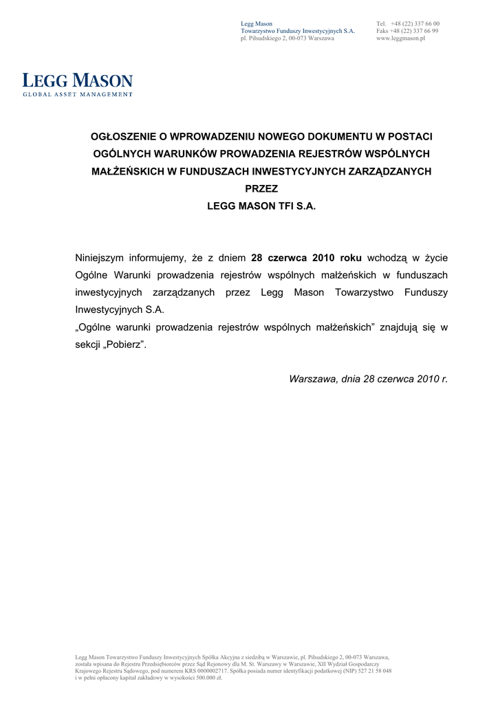Legg Mason Towarzystwo Funduszy Inwestycyjnych S.A. pl. Piłsudskiego 2, 00-073 Warszawa Tel. +48 (22) 337 66 00 Faks +48 (22) 337 66 99 www.leggmason.pl OGŁOSZENIE O WPROWADZENIU NOWEGO DOKUMENTU W POSTACI OGÓLNYCH WARUNKÓW PROWADZENIA REJESTRÓW WSPÓLNYCH MAŁŻEŃSKICH W FUNDUSZACH INWESTYCYJNYCH ZARZĄDZANYCH PRZEZ LEGG MASON TFI S.A. Niniejszym informujemy, że z dniem 28 czerwca 2010 roku wchodzą w życie Ogólne Warunki prowadzenia rejestrów wspólnych małżeńskich w funduszach inwestycyjnych zarządzanych przez Legg Mason Towarzystwo Funduszy Inwestycyjnych S.A. „Ogólne warunki prowadzenia rejestrów wspólnych małżeńskich” znajdują się w sekcji „Pobierz”. Warszawa, dnia 28 czerwca 2010 r. Legg Mason Towarzystwo Funduszy Inwestycyjnych Spółka Akcyjna z siedzibą w Warszawie, pl. Piłsudskiego 2, 00-073 Warszawa, została wpisana do Rejestru Przedsiębiorców przez Sąd Rejonowy dla M. St. Warszawy w Warszawie, XII Wydział Gospodarczy Krajowego Rejestru Sądowego, pod numerem KRS 0000002717. Spółka posiada numer identyfikacji podatkowej (NIP) 527 21 58 048 i w pełni opłacony kapitał zakładowy w wysokości 500.000 zł.