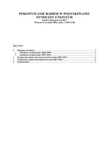 POKONYWANIE BARIER W POZYSKIWANIU FUNDUSZY UNIJNYCH Konferencja prasowa BCC Warszawa 15 maja 2006, godz. 11.00-12.00 Spis treści: 1. Diagnoza sytuacji.............................................................................................................. 2 a. Fundusze strukturalne 2004-2006............................................................................... 2 b. Fundusze strukturalne 2007-2013............................................................................... 5 2. Propozycje zmian merytorycznych na lata 2007-2013.................................................. 6 3. Propozycje zmian formalnych na lata 2007-2013.......................................................... 8 4. Zakończenie. ..................................................................................................................... 9 1. Diagnoza sytuacji a. Fundusze strukturalne 2004-2006 Wielkość alokacji (w mln EUR) Środki dla biznesu (szacunek) Udział % 2 869,5 56,5 ok. 1,97% 627,2 0,0 0% SPO Rozwój Zasobów Ludzkich 1 470,4 190,0 13% SPO Wzrost Konkurencyjności Przedsiębiorstw 1 300,0 683,0 52% SPO Rolnictwo 1 055,0 ok. 300,0 34% SPO Ryby 178,6 0,0 0% PO Pomoc techniczna 20,0 0,0 0% 7 520,7 1 229,5 ok. 16,3% Program operacyjny ZPORR SPO Transport RAZEM SPO Wzrost Konkurencyjności Przedsiębiorstw - Priorytet II SPO Wzrost Konkurencyjności Przedsiębiorstw - Priorytet III 683,3 mln EU 14,5 mln EU SPO Wzrost Konkurencyjności SPO Rozwój Zasobów Ludzkich Przedsiębiorstw - Priorytet I 1470,0 mln EU 547,5 mln EU Pozostałe 5865,7 mln EU W latach 2004 – 2006 przedsiębiorcy mogli skorzystać ze środków pomocowych alokowanych w kilku programach operacyjnych. Inwestycje oraz specjalistyczne doradztwo dofinansowywane były z Sektorowego Programu Operacyjnego Wzrost Konkurencyjności Przedsiębiorstw (SPO WKP) w Priorytecie II. Dla przedsiębiorców będących firmami szkoleniowymi interesujące były projekty realizowane z Sektorowego Programu Operacyjnego Rozwój Zasobów Ludzkich (SPO RZL). W ramach tego programu moŜna było uzyskać dofinansowanie projektów szkoleniowych realizowanych przez firmy. Sektorowy Program Operacyjny Wzrost Konkurencyjności Przedsiębiorstw (pomarańczowe tło) pomoc przedsiębiorcom traktuje szerzej niŜ tylko jako środki na rozwój, stąd podział tego programu na trzy priorytety, czyli trzy obszary tematyczne: Priorytet I dotyczył instytucji otoczenia biznesu, czyli organizacji, które wspierają przedsiębiorców w Polsce. Z kolei Priorytet II zawierał fundusze przeznaczone bezpośrednio dla przedsiębiorców (obszar 2 zapaskowany), a Priorytet III to pomoc techniczna, czyli dofinansowanie działań związanych z obsługą Programu Operacyjnego przez administrację publiczną. Na tle niebieskim widnieje Sektorowy Program Operacyjny Wzrost Zasobów Ludzkich, czyli program związany ze szkoleniami w Polsce dofinansowanymi z Unii. Kolor zielony to pozostała część funduszy (m.in. dla samorządów terytorialnych, na budowę dróg i ochronę środowiska, rewitalizację, innowacyjność). Prezentując moŜliwości wykorzystania funduszy przez przedsiębiorców posłuŜono się uproszczeniem – w zielonej części takŜe są działania dla: przedsiębiorstw (dotacja do 50 000 euro) – działanie 3.4. Zintegrowanego Programu Operacyjnego Rozwoju Regionalnego (ZPORR) – dofinansowanie mikroprzedsiębiorstw działających na rynku nie dłuŜej niŜ 3 lata oraz starter dla przedsiębiorców, którzy dopiero zakładają własną działalność – działanie 2.5 ZPORR. W okresie programowania na lata 2004 – 2006 na bezpośrednie wsparcie dla przedsiębiorców z Priorytetu 2 SPO WKP przeznaczono w sumie 683,3 mln euro, co stanowi ok. 8,0% wszystkich funduszy dla Polski. Środki dla Przedsiębiorców 2004-2006 450,00% 420,1% 400,00% 363,4% 350,00% 300,00% 250,00% 200,00% 150,00% 100,00% 50,00% 113,5% 57,4% 62,3% 47,0% 22,8% 0,95% 0,44% 9,39% 12,2% 0,11% 0,00% 2.1 Wzrost konkurencyjności małych i średnich przedsiębiorstw poprzez doradztwo 2.2 Wsparcie konkurencyjności produktowej i technologicznej przedsiębiorstw 2.3 Wzrost konkurencyjności małych i średnich przedsiębiorstw poprzez inwestycje 2.4 Wsparcie dla przedsięwzięć w zakresie dostosowywania przedsiębiorstw do wymogów ochrony środowiska wartość złoŜonych wniosków jako % realizacji zobowiązań na cały okres programowania (od uruchomienia programu) wartość podpisanych umów jako % realizacji zobowiązań na cały okres programowania (od uruchomienia programu) % realizacji zobowiązań na cały okres programowania (od uruchomienia programu) Jak juŜ zaznaczono - bezpośrednio dla przedsiębiorstw zaplanowany został Priorytet II SPO WKP. Priorytet ten składa się z szeregu działań: Działanie 2.1 dotyczy dotacji dla przedsiębiorców, chcących skorzystać ze specjalistycznego doradztwa (systemy zarządzania, dokumentacje techniczne, rozwiązania informatyczne w przedsiębiorstwach). Działanie 2.2 podzielone zostało na dwa poddziałania, z których jedno (podzdziałanie 2.2.1) dotyczyło dotacji inwestycyjnych dla przedsiębiorstw (specyficzny dla tego poddziałania był brak górnego pułapu dotacji – stąd np.: 31,9 mln pln dla KGHM Polska Miedź S.A., natomiast drugie (poddziałanie 2.2.2) dotyczyło dotacji na promocję przedsiębiorstwa na targach i wystawach. Warto w tym miejscu zaznaczyć, Ŝe zgodnie z wytycznymi Komisji Europejskiej w ramach poddziałania 2.2.1 większość środków powinna trafić do małych i średnich przedsiębiorstw. Tak się jednak nie stało, gdyŜ poddziałanie to jest częścią instrumentu finansowego Ministerstwa Gospodarki i środki w większości trafiły do firm duŜych, niezgodnie z wytycznymi Komisji. 3 Działanie 2.3 dotyczyło dotacji dla przedsiębiorstw – maksymalna kwota dofinansowania 1 250 000 PLN. Czas przeszły w odniesieniu do działań 2.2. oraz 2.3 został uŜyty celowo, gdyŜ jak na razie rundy aplikac