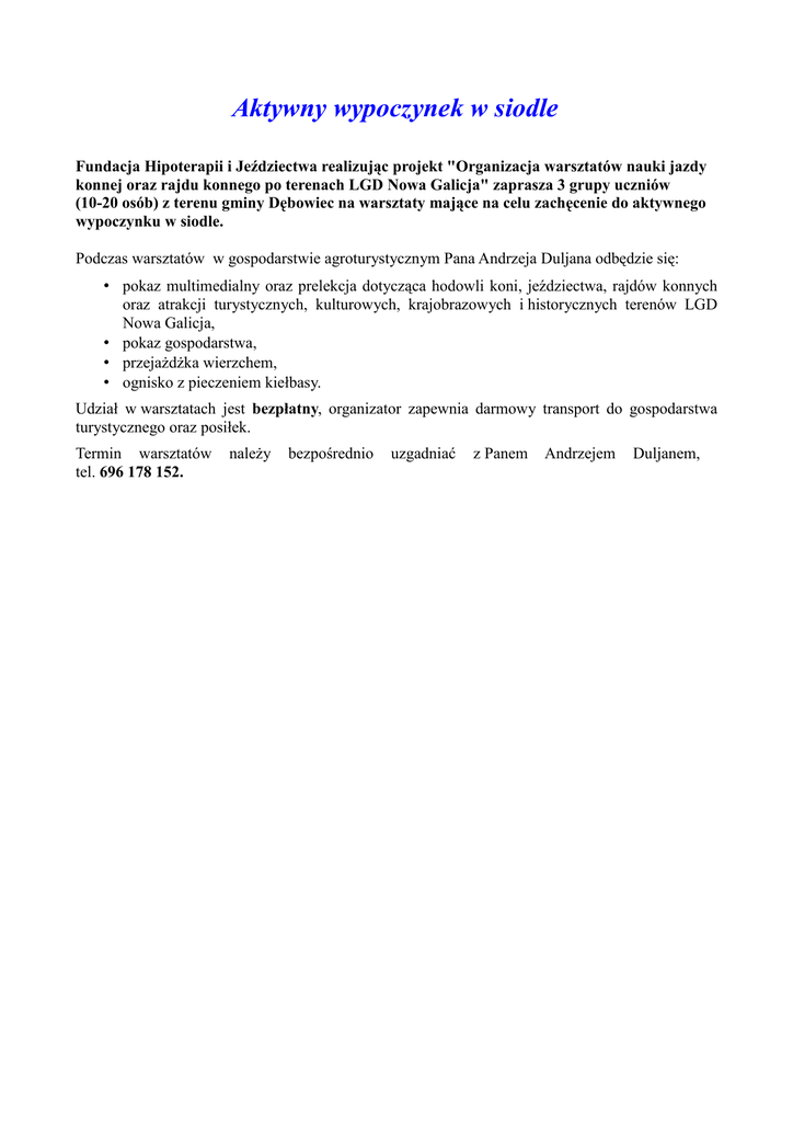 Aktywny wypoczynek w siodle Fundacja Hipoterapii i Jeździectwa realizując projekt "Organizacja warsztatów nauki jazdy konnej oraz rajdu konnego po terenach LGD Nowa Galicja" zaprasza 3 grupy uczniów (10-20 osób) z terenu gminy Dębowiec na warsztaty mające na celu zachęcenie do aktywnego wypoczynku w siodle. Podczas warsztatów w gospodarstwie agroturystycznym Pana Andrzeja Duljana odbędzie się: • pokaz multimedialny oraz prelekcja dotycząca hodowli koni, jeździectwa, rajdów konnych oraz atrakcji turystycznych, kulturowych, krajobrazowych i historycznych terenów LGD Nowa Galicja, • pokaz gospodarstwa, • przejażdżka wierzchem, • ognisko z pieczeniem kiełbasy. Udział w warsztatach jest bezpłatny, organizator zapewnia darmowy transport do gospodarstwa turystycznego oraz posiłek. Termin warsztatów tel. 696 178 152. należy bezpośrednio uzgadniać z Panem Andrzejem Duljanem,