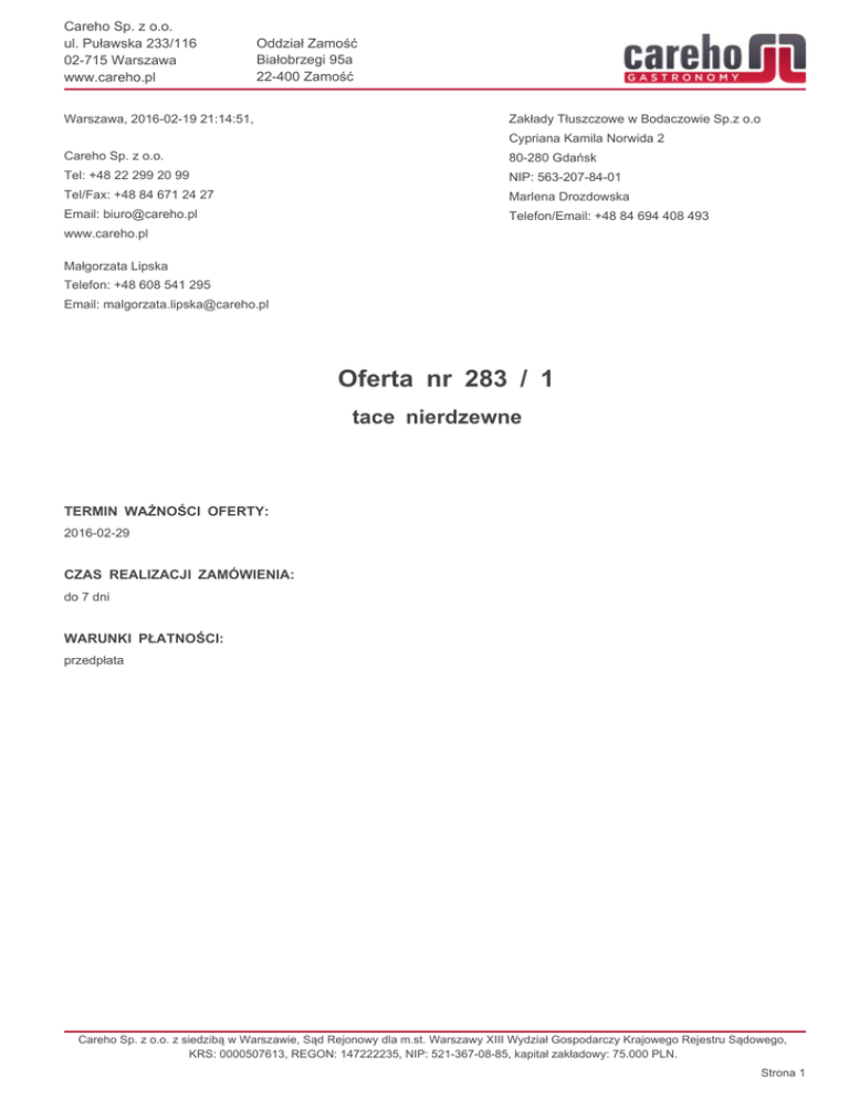 Careho Sp. z o.o. ul. Puławska 233/116 02-715 Warszawa www.careho.pl Oddział Zamość Białobrzegi 95a 22-400 Zamość Warszawa, 2016-02-19 21:14:51, Zakłady Tłuszczowe w Bodaczowie Sp.z o.o Cypriana Kamila Norwida 2 Careho Sp. z o.o. 80-280 Gdańsk Tel: +48 22 299 20 99 NIP: 563-207-84-01 Tel/Fax: +48 84 671 24 27 Marlena Drozdowska Email: [email protected] Telefon/Email: +48 84 694 408 493 www.careho.pl Małgorzata Lipska Telefon: +48 608 541 295 Email: [email protected] Oferta nr 283 / 1 tace nierdzewne TERMIN WAŻNOŚCI OFERTY: 2016-02-29 CZAS REALIZACJI ZAMÓWIENIA: do 7 dni WARUNKI PŁATNOŚCI: przedpłata Careho Sp. z o.o. z siedzibą w Warszawie, Sąd Rejonowy dla m.st. Warszawy XIII Wydział Gospodarczy Krajowego Rejestru Sądowego, KRS: 0000507613, REGON: 147222235, NIP: 521-367-08-85, kapitał zakładowy: 75.000 PLN. Strona 1 Careho Sp. z o.o. ul. Puławska 233/116 02-715 Warszawa www.careho.pl Oddział Zamość Białobrzegi 95a 22-400 Zamość Podsumowanie oferty Lp. Nazwa produktu Taca ekspozycyjna z chromowanymi rączkami ∅480mm piętrowalna Model Kod Ilość Cena* Rabat Po rabacie* 406480 1 227,00 zł 406120 1 90,00 zł 5% 85,50 zł 406112 1 157,00 zł 5% 149,15 zł 406111 1 180,00 zł 10% 162,00 zł Suma netto: 623,65 zł VAT: 143,44 zł Suma brutto: 767,09 zł 227,00 zł 60(H)mm, Taca ekspozycyjna stalowa prostokątna GN 1/2 16(H)mm, 265(W)mm, 325(D)mm Taca ekspozycyjna stalowa z chromowanymi rączkami GN 1/1 piętrowalna 65(H)mm, 530(W)mm, 325(D)mm Taca ekspozycyjna stalowa GN 1/1 z uchwytami 40(H)mm, 530(W)mm, 325(D)mm *Ceny netto Careho Sp. z o.o. z siedzibą w Warszawie, Sąd Rejonowy dla m.st. Warszawy XIII Wydział Gospodarczy Krajowego Rejestru Sądowego, KRS: 0000507613, REGON: 147222235, NIP: 521-367-08-85, kapitał zakładowy: 75.000 PLN. Strona 2 Careho Sp. z o.o. ul. Puławska 233/116 02-715 Warszawa www.careho.pl Oddział Zamość Białobrzegi 95a 22-400 Zamość Taca ekspozycyjna z chromowanymi rączkami ∅480mm piętrowalna Parametry główne Producent Stalgast Kod producenta 406480 Kategoria Zastawa bufetowa Podkategoria Tace Urządzenia Tace ekspozycyjne Parametry techniczne Wysokość 60 mm Średnica 480 mm Główny materiał Stal nierdzewna Strona produktu Cena Cena: 227,00 zł http://careho.pl/pl/product/taca-ekspozycyjna-z-chromowanymi-raczkami-480mm-pietrowalnastalgast Opis okrągła z chromowanymi rączkami Careho Sp. z o.o. z siedzibą w Warszawie, Sąd Rejonowy dla m.st. Warszawy XIII Wydział Gospodarczy Krajowego Rejestru Sądowego, KRS: 0000507613, REGON: 147222235, NIP: 521-367-08-85, kapitał zakładowy: 75.000 PLN. Strona 3 Careho Sp. z o.o. ul. Puławska 233/116 02-715 Warszawa www.careho.pl Oddział Zamość Białobrzegi 95a 22-400 Zamość Taca ekspozycyjna stalowa prostokątna GN 1/2 Parametry główne Producent Stalgast Kod producenta 406120 Kategoria Zastawa bufetowa Podkategoria Tace Urządzenia Tace ekspozycyjne Parametry techniczne Cena: 90,00 zł Rabat: 5 % Oszczędność: 16 mm Szerokość 265 mm Głębokość 325 mm Główny materiał Stal nierdzewna Strona produktu Cena Cena po rabacie: Wysokość http://careho.pl/pl/product/taca-ekspozycyjna-stalowa-prostokatna-gn-12-stalgast Opis 85,50 zł 4,50 zł Careho Sp. z o.o. z siedzibą w Warszawie, Sąd Rejonowy dla m.st. Warszawy XIII Wydział Gospodarczy Krajowego Rejestru Sądowego, KRS: 0000507613, REGON: 147222235, NIP: 521-367-08-85, kapitał zakładowy: 75.000 PLN. Strona 4 Careho Sp. z o.o. ul. Puławska 233/116 02-715 Warszawa www.careho.pl Oddział Zamość Białobrzegi 95a 22-400 Zamość Taca ekspozycyjna stalowa z chromowanymi rączkami GN 1/1 piętrowalna Parametry główne Producent Stalgast Kod producenta 406112 Kategoria Zastawa bufetowa Podkategoria Tace Urządzenia Tace ekspozycyjne Parametry techniczne Cena: 157,00 zł Rabat: 5 % Oszczędność: 65 mm Szerokość 530 mm Głębokość 325 mm Główny materiał Stal nierdzewna Strona produktu Cena Cena po rabacie: Wysokość 149,15 zł 7,85 zł http://careho.pl/pl/product/taca-ekspozycyjna-stalowa-z-chromowanymi-raczkami-gn-11pietrowalna-stalgast Opis piętrowanie: 1 z chromowanymi rączkami Careho Sp. z o.o. z siedzibą w Warszawie, Sąd Rejonowy dla m.st. Warszawy XIII Wydział Gospodarczy Krajowego Rejestru Sądowego, KRS: 0000507613, REGON: 147222235, NIP: 521-367-08-85, kapitał zakładowy: 75.000 PLN. Strona 5 Careho Sp. z o.o. ul. Puławska 233/116 02-715 Warszawa www.careho.pl Oddział Zamość Białobrzegi 95a 22-400 Zamość Taca ekspozycyjna stalowa GN 1/1 z uchwytami Parametry główne Producent Stalgast Kod producenta 406111 Kategoria Zastawa bufetowa Podkategoria Tace Urządzenia Tace ekspozycyjne Parametry techniczne Wysokość 40 mm Szerokość 530 mm Głębokość 325 mm Główny materiał Stal nierdzewna Strona produktu Cena Cena: 180,00 zł Rabat: 10 % Cena po rabacie: 162,00 zł Oszczędność: 18,00 zł http://careho.pl/pl/product/taca-ekspozycyjna-stalowa-gn-11-z-uchwytami-stalgast Opis Piętrowanie: 1 Careho Sp. z o.o. z siedzibą w Warszawie, Sąd Rejonowy dla m.st. Warszawy XIII Wydział Gospodarczy Krajowego Rejestru Sądowego, KRS: 0000507613, REGON: 147222235, NIP: 521-367-08-85, kapitał zakładowy: 75.000 PLN. Strona 6