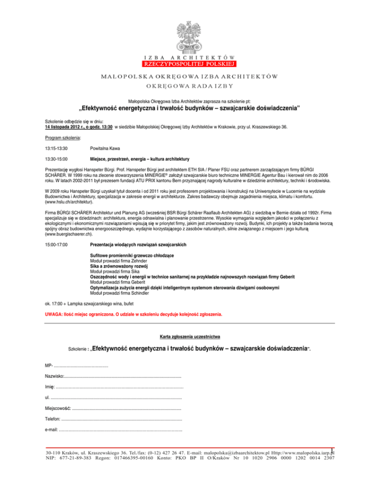 Małopolska Okręgowa Izba Architektów zaprasza na szkolenie pt: „Efektywność energetyczna i trwałość budynków – szwajcarskie doświadczenia” Szkolenie odbędzie się w dniu: 14 listopada 2012 r., o godz. 13:30 w siedzibie Małopolskiej Okręgowej Izby Architektów w Krakowie, przy ul. Kraszewskiego 36. Program szkolenia: 13:15-13:30 Powitalna Kawa 13:30-15:00 Miejsce, przestrzeń, energia – kultura architektury Prezentację wygłosi Hanspeter Bürgi. Prof. Hanspeter Bürgi jest architektem ETH SIA / Planer FSU oraz partnerem zarządzającym firmy BÜRGI SCHÄRER. W 1999 roku na zlecenie stowarzyszenia MINERGIE® założył szwajcarskie biuro techniczne MINERGIE Agentur Bau i kierował nim do 2006 roku. W latach 2002-2011 był prezesem fundacji ATU PRIX kantonu Bern przyznającej nagrody kulturalne w dziedzinie architektury, techniki i środowiska. W 2009 roku Hanspeter Bürgi uzyskał tytuł docenta i od 2011 roku jest profesorem projektowania i konstrukcji na Uniwersytecie w Lucernie na wydziale Budownictwa i Architektury, specjalizacja w zakresie energii w architekturze. Zakres badawczy obejmuje zagadnienia miejsca, klimatu i komfortu. (www.hslu.ch/architektur). Firma BÜRGI SCHÄRER Architektur und Planung AG (wcześniej BSR Bürgi Schärer Raaflaub Architekten AG) z siedzibą w Bernie działa od 1992r. Firma specjalizuje się w dziedzinach: architektura, energia odnawialna i planowanie przestrzenne. Wysokie wymagania względem jakości w połączeniu z ekologicznymi i ekonomicznymi rozwiązaniami wpisują się w priorytet firmy, jakim jest zrównoważony rozwój. Budynki, ich projekty a także badania tworzą spójny obraz budownictwa energooszczędnego, wydajnie korzystającego z zasobów naturalnych, silnie związanego z miejscem i jego kulturą (www.buergischaerer.ch). 15:00-17:00 Prezentacja wiodących rozwiązań szwajcarskich Sufitowe promienniki grzewczo chłodzące Moduł prowadzi firma Zehnder Sika a zrównoważony rozwój Moduł prowadzi firma Sika Oszczędność wody i energii w technice sanitarnej na przykładzie najnowszych rozwiązań firmy Geberit Moduł prowadzi firma Geberit Optymalizacja zużycia energii dzięki inteligentnym systemom sterowania dźwigami osobowymi Moduł prowadzi firma Schindler ok. 17:00 + Lampka szwajcarskiego wina, bufet UWAGA: Ilość miejsc ograniczona. O udziale w szkoleniu decyduje kolejność zgłoszenia. Karta zgłoszenia uczestnictwa Szkolenie : „Efektywność energetyczna i trwałość budynków – szwajcarskie doświadczenia”. MP- ………………………………… Nazwisko:..................................................................................................... Imię: ……………………………………………..………………………………… ul. ................................................................................................................. Miejscowość: .............................................................................................. Telefon: ........................................................................................................ e-mail: …………………………………………………………………………….. 1 30-110 Kraków, ul. Kraszewskiego 36. Tel./fax: (0-12) 427 26 47. E -mail: [email protected] Http://www.malopolska.iarp.pl NIP: 677-21-89-383 Regon: 017466395-00160 Konto: PKO BP II O/Kraków Nr 10 1020 2906 0000 1202 0014 2307