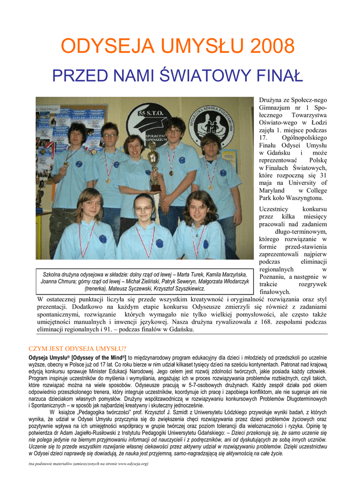ODYSEJA UMYSŁU 2008 PRZED NAMI ŚWIATOWY FINAŁ Drużyna ze Społecz-nego Gimnazjum nr 1 Społecznego Towarzystwa Oświato-wego w Łodzi zajęła 1. miejsce podczas 17. Ogólnopolskiego Finału Odysei Umysłu w Gdańsku i może reprezentować Polskę w Finałach Światowych, które rozpoczną się 31 maja na University of Maryland w College Park koło Waszyngtonu. Uczestnicy konkursu przez kilka miesięcy pracowali nad zadaniem długo-terminowym, którego rozwiązanie w formie przed-stawienia zaprezentowali najpierw podczas eliminacji regionalnych w Szkolna drużyna odysejowa w składzie: dolny rząd od lewej – Marta Turek, Kamila Marzyńska, Poznaniu, a następnie w Joanna Chmura; górny rząd od lewej – Michał Zieliński, Patryk Seweryn, Małgorzata Włodarczyk trakcie rozgrywek (trenerka), Mateusz Syczewski, Krzysztof Szyszkiewicz. finałowych. W ostatecznej punktacji liczyła się przede wszystkim kreatywność i oryginalność rozwiązania oraz styl prezentacji. Dodatkowo na każdym etapie konkursu Odyseusze zmierzyli się również z zadaniami spontanicznymi, rozwiązanie których wymagało nie tylko wielkiej pomysłowości, ale często także umiejętności manualnych i inwencji językowej. Nasza drużyna rywalizowała z 168. zespołami podczas eliminacji regionalnych i 91. – podczas finałów w Gdańsku. CZYM JEST ODYSEJA UMYSŁU? Odyseja Umysłu® [Odyssey of the Mind®] to międzynarodowy program edukacyjny dla dzieci i młodzieży od przedszkoli po uczelnie wyższe, obecny w Polsce już od 17 lat. Co roku bierze w nim udział kilkaset tysięcy dzieci na sześciu kontynentach. Patronat nad krajową edycją konkursu sprawuje Minister Edukacji Narodowej. Jego celem jest rozwój zdolności twórczych, jakie posiada każdy człowiek. Program inspiruje uczestników do myślenia i wymyślania, angażując ich w proces rozwiązywania problemów rozbieżnych, czyli takich, które rozwiązać można na wiele sposobów. Odyseusze pracują w 5-7-osobowych drużynach. Każdy zespół działa pod okiem odpowiednio przeszkolonego trenera, który integruje uczestników, koordynuje ich pracę i zapobiega konfliktom, ale nie sugeruje ani nie narzuca dzieciakom własnych pomysłów. Drużyny współzawodniczą w rozwiązywaniu konkursowych Problemów Długoterminowych i Spontanicznych – w sposób jak najbardziej kreatywny i skuteczny jednocześnie. W książce „Pedagogika twórczości” prof. Krzysztof J. Szmidt z Uniwersytetu Łódzkiego przywołuje wyniki badań, z których wynika, że udział w Odysei Umysłu przyczynia się do zwiększenia chęci rozwiązywania przez dzieci problemów życiowych oraz pozytywnie wpływa na ich umiejętności współpracy w grupie twórczej oraz poziom tolerancji dla wieloznaczności i ryzyka. Opinię tę potwierdza dr Adam Jagiełło-Rusiłowski z Instytutu Pedagogiki Uniwersytetu Gdańskiego: – Dzieci przekonują się, że samo uczenie się nie polega jedynie na biernym przyjmowaniu informacji od nauczycieli i z podręczników, ani od dyskutujących ze sobą innych uczniów. Uczenie się to przede wszystkim rozwijanie własnej ciekawości przez aktywny udział w rozwiązywaniu problemów. Dzięki uczestnictwu w Odysei dzieci naprawdę się dowiadują, że nauka jest przyjemną, samo-nagradzającą się aktywnością na całe życie. (na podstawie materiałów zamieszczonych na stronie www.odyseja.org) Nie ma czegoś takiego jak zły pomysł – zawsze natomiast istnieje pomysł lepszy!” - Dr C. Samuel Micklus, twórca Odysei Umysłu WYWIAD Z PRZEDSTAWICIELAMI DRUŻYNY ODYSEJOWEJ: Martą Turek i Mateuszem Syczewskim. - W jaki sposób dowiedzieliście się o programie ,,Odyseja Umysłu”? - Odyseja jest to konkurs, w którym nasza szkoła bierze udział po raz pierwszy. Dowiedzieliśmy się o nim od naszej pani od matematyki – Małgorzaty Włodarczyk, która została wyszkolona na trenera. Traktowała ona całe to wydarzenie jako świetną, rozwijającą imprezę. - Jakie były początki? -Trudne. Zaczynając od wybrania problemu, wymyślenia jego rozwiązania i napisania zabawnego scenariusza. Włożyliśmy w to dużo pracy, czasem musieliśmy rezygnować z innych przyjemności lub dodatkowych zajęć, by zdążyć ze wszystkim na czas, ale nie żałujemy wykorzystanego w ten sposób czasu. - Co to są ,,spontany" ? - Spontany są ważnym elementem zmagań konkursowych. To krótkie, kilkuminutowe zadania, które trzeba wykonać bez wcześniejszego przygotowania. Mogą one być: a) manualne, gdy zadanie polega na zbudowaniu np. ze słomek i wykałaczek lub z makaronu i żelków jak najwyższej lub jak najdłuższej struktury albo takiej, która wytrzyma jak największe obciążenie . b)słowne, gdy rozwiązaniem problemu jest np. opowiedzenie śmiesznej historyjki lub twórcze odpowiedzi na postawione pytanie c) słowno - manualne, gdy rozwiązaniem jest stworzenie z dostępnych materiałów jakiegoś produktu i opowiedzenie o nim, zareklamowanie go lub użycie go w scence. Zawsze podany jest określony czas na myślenie i rozwiązanie zadania. Ile mieliście problemów długoterminowych do wyboru i dlaczego dokonaliście właśnie takiego a nie innego? - Mieliśmy do wyboru 5 problemów: 1. Ale jazda! 2. Było nie było dinozaury. 3. Na luzie o muzie. 4. Piłki na topie. Na zdjęciu – scenka z przedstawienia. Ekscentryczne postacie to: od lewej - Mateusz Syczewski, Kamila Marzyńska, Patryk Seweryn 5. Teraz dziwacy ! Początkowo rozważaliśmy wybór Problemu 4., w którym należało z drewna balsa zbudować 17. gramową strukturę, która utrzyma na sobie piłki golfowe, które z kolei wytrzymają jak największe obciążenie. Uznaliśmy jednak, że przemyślenie i zbudowanie oraz testowanie takiej struktury zajmie nam mnóstwo czasu i skutek może nie być zadowalający. Drużyna nasza powstała w grudniu, nie mieliśmy więc zbyt dużo czasu i stwierdziliśmy, że łatwiej nam pójdzie z problemem humanistycznym. Wybraliśmy problem 5