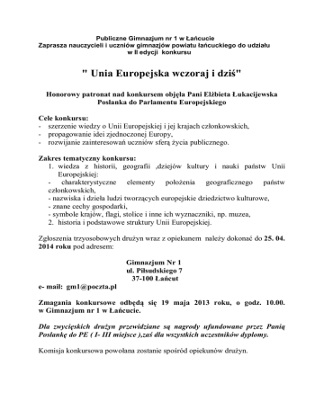Publiczne Gimnazjum nr 1 w cucie Zaprasza nauczycieli i uczniów gimnazjów powiatu cuckiego do udzia u w II edycji konkursu " Unia Europejska wczoraj i dzi " Honorowy patronat nad konkursem obj a Pani El bieta ukacijewska Pos anka do Parlamentu Europejskiego Cele konkursu: - szerzenie wiedzy o Unii Europejskiej i jej krajach cz onkowskich, - propagowanie idei zjednoczonej Europy, - rozwijanie zainteresowa uczniów sfer ycia publicznego. Zakres tematyczny konkursu: 1. wiedza z historii, geografii ,dziejów kultury i nauki pa stw Unii Europejskiej: - charakterystyczne elementy po enia geograficznego pa stw cz onkowskich, - nazwiska i dzie a ludzi tworz cych europejskie dziedzictwo kulturowe, - znane cechy gospodarki, - symbole krajów, flagi, stolice i inne ich wyznaczniki, np. muzea, 2. historia i podstawowe struktury Unii Europejskiej. Zg oszenia trzyosobowych dru yn wraz z opiekunem nale y dokona do 25. 04. 2014 roku pod adresem: Gimnazjum Nr 1 ul. Pi sudskiego 7 37-100 cut e- mail: [email protected] Zmagania konkursowe odb si w Gimnazjum nr 1 w cucie. 19 maja 2013 roku, o godz. 10.00. Dla zwyci skich dru yn przewidziane s nagrody ufundowane przez Pani Pos ank do PE ( I- III miejsce ),za dla wszystkich uczestników dyplomy. Komisja konkursowa powo ana zostanie spo ród opiekunów dru yn. Zasady konkursu: I RUNDA 1. Ka da uczestnicz ca dru yna sk ada si z trzech zawodników, na pytania odpowiada w jej imieniu tylko kapitan. Przed udzieleniem odpowiedzi mo na si naradza . Czas na rozpocz cie odpowiedzi wynosi 15 sekund. 2. Rozpoczynaj c konkurs, ka da dru yna posiada trzy szanse oznaczone kó eczkami. W razie, gdy odpowied jest b dna lub jej brak – traci szans . Po stracie trzech szans dru yna odpada z konkursu. 3. Runda jest zako czona, gdy z szansami pozostanie pi dru yn. 4. Za prawid ow uznawana jest pe na odpowied na pytanie. 5. Wszelkie w tpliwo ci rozstrzyga jury. II RUNDA 1. Runda polega na tym, e dru yna z nr 1, je li odpowie prawid owo na swoje pytanie, wyznacza nast pn odpowiadaj – ta za kolejn itd...Je li wyznaczona dru yna odpowiadaj c - nie da prawid owej odpowiedzi, traci szans , a kolejn odpowiadaj dru yn wyznacza ta sama dru yna, co poprzednio. Ka da z dru yn posiada trzy szanse. 2. Tura trwa do momentu, gdy pozostan 3 dru yny uczestników, którym pozosta y jeszcze szanse. Przechodz oni do cis ego fina u. FINA 1. W finale ka da z trzech dru yn otrzymuje po pi pyta . Prawid owe i pe ne odpowiedzi decyduj o zwyci stwie. W przypadku jednakowej ilo ci punktów osi gni tych przez dwie lub trzy dru yny, pytania s zadawane do pierwszego du. Wszelkich informacji na temat konkursu udziela pani Anna Kot, tel. 501 643 436, e- mail [email protected]