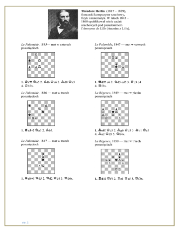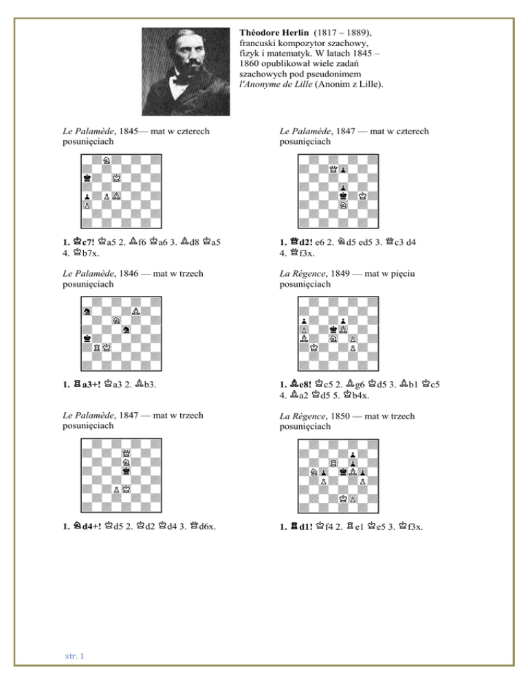 Théodore Herlin (1817 – 1889), francuski kompozytor szachowy, fizyk i matematyk. W latach 1845 – 1860 opublikował wiele zadań szachowych pod pseudonimem l'Anonyme de Lille (Anonim z Lille). Le Palamède, 1845— mat w czterech posunięciach )........*! !0 ,i, , ,]! 0, , , , ]! !0m, L , ,]! 0, , , , ]! !0p,qC , ,]! 0Q , , , ]! !0 , , , ,]! 0, , , , ]! !\````````^! 1. lc7! la5 2. cf6 la6 3. cd8 la5 4. lb7x. Le Palamède, 1847 — mat w czterech posunięciach )........*! !0 , , , ,]! 0, ,rP , ]! !0 , , , ,]! 0, , P , ]! !0 , ,m,l,]! 0, , I , ]! !0 , , , ,]! 0, , , , ]! !\````````^! 1. rd2! e6 2. id5 ed5 3. rc3 d4 4. rf3x. Le Palamède, 1846 — mat w trzech posunięciach )........*! !0 , , , ,]! 0K , ,c, ]! !0 , I , ,]! 0, , K , ]! !0m, , , ,]! 0,sL , , ]! !0 , , , ,]! 0, , , , ]! !\````````^! 1. sa3+! la3 2. cb3. La Régence, 1849 — mat w pięciu posunięciach )........*! !0 , , , ,]! 0, , , , ]! !0p, ,p, ,]! 0Q ,mC , ]! !0c, I Q ,]! 0,l, ,q, ]! !0 , , , ,]! 0, , , , ]! !\````````^! 1. ce8! lc5 2. cg6 ld5 3. cb1 lc5 4. ca2 ld5 5. lb4x. Le Palamède, 1847 — mat w trzech posunięciach )........*! !0 , , , ,]! 0, , R , ]! !0 , ,i, ,]! 0, , M , ]! !0 , , , ,]! 0, ,qL , ]! !0 , , , ,]! 0, , , , ]! !\````````^! 1. id4+! ld5 2. ld2 ld4 3. rd6x. La Régence, 1850 — mat w trzech posunięciach )........*! !0 , , , ,]! 0, , ,p, ]! !0 , S P ,]! 0,iP McP ]! !0 ,q, ,q,]! 0, , , , ]! !0 , ,lQ ,]! 0, , , , ]! !\````````^! 1. sd1! lf4 2. se1 le5 3. lf3x. str. 1 Schachzeitung, 1852 — mat w dwóch posunięciach )........*! !0mU , , S]! 0Up, , , ]! !0 , , ,l,]! 0, , , , ]! !0 , ,r, ,]! 0, , , , ]! !0 , , , ,]! 0S , , , ]! !\````````^! 1. rh1! L'Illustration, 1858 — mat w czterech posunięciach )........*! !0 , , , ,]! 0, , , , ]! !0 , I , ,]! 0,q, , ,i]! !0 , Mq, ,]! 0, , , , ]! !0 ,s,l, ,]! 0, , , , ]! !\````````^! 1.s sc4+! le5 2. if5 le6 3.sc7 ~ 4.se7x. La Régence, 1860 — mat w czterech posunięciach )........*! !0o, , , O]! 0, , , , ]! !0 , ,r, ,]! 0, , C , ]! !0 , ,m, ,]! 0, , , , ]! !0 , ,q, ,]! 0, , , L ]! !\````````^! 1. cd6+! ld4 2. rb3 ~ 3. rd3x; 2... ce4 3. e3x; 1... ce5 2. re5x. La Régence, 1860 — mat w pięciu posunięciach )........*! !0 , , , ,]! 0O P , , ]! !0qPq, , ,]! 0,q,p, ,m]! !0 , Qp,pI]! 0, , C Q ]! !0 , , Q ,]! 0L , , ,s]! !\````````^! 1. lb2! cb8 2. a7 ca7 3. sa1 cb8 4. sa8 ca7 5. sh8x. str. 2 La Régence, 1860 — mat w trzech posunięciach )........*! !0 , M I ,]! 0,l, ,p, ]! !0 , , I Q]! 0, , P C ]! !0 , ,q, ,]! 0, , , , ]! !0 , , , ,]! 0, , , , ]! !\````````^! 1. cd2! le7 2. ca5 lf8 3. cb4x; 2... lf6 3. cd8x; 2... ld6 3. cb4x. Schachaufgaben, 1880 — mat w trzech posunięciach )........*! !0 ,k, , ,]! 0P , P Lp]! !0qPo,m, Q]! 0,q, ,i, ]! !0 , ScQ ,]! 0, ,qQ , ]! !0 , , , ,]! 0, , , , ]! !\````````^! 1. sd8! cd7 2. cg2 lf5 3. ch3x; 2... ~ 3. id4x. Deutsches Wochenschach, 1909 — mat w trzech posunięciach )........*! !0 , , ,m,]! 0, S , P ]! !0 , , ,p,]! 0, L , Q ]! !0c, , , ,]! 0, , , , ]! !0 , , , ,]! 0, , , , ]! !\````````^! 1. ce8! lh7 2. sc8 l~ 3. cg6x; 1... lf8/h8 2. cg6 lg8 3. sc8x.