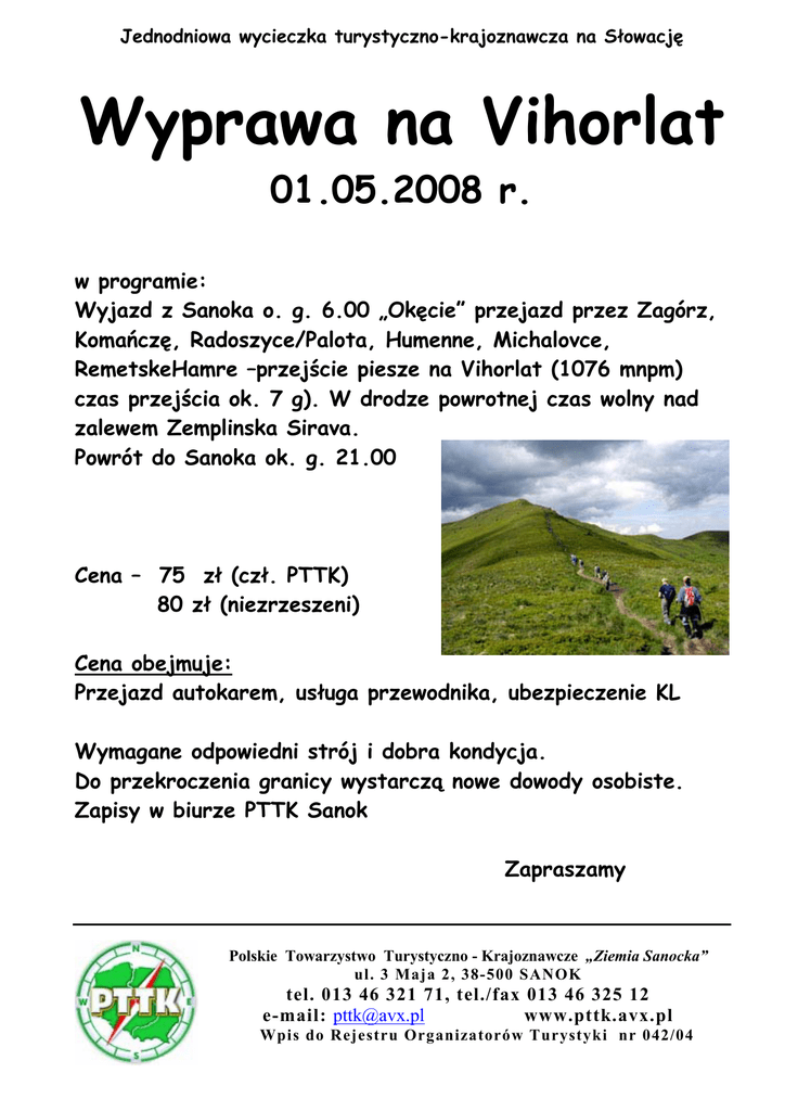 Jednodniowa wycieczka turystyczno-krajoznawcza na Słowację Wyprawa na Vihorlat 01.05.2008 r. w programie: Wyjazd z Sanoka o. g. 6.00 „Okęcie” przejazd przez Zagórz, Komańczę, Radoszyce/Palota, Humenne, Michalovce, RemetskeHamre –przejście piesze na Vihorlat (1076 mnpm) czas przejścia ok. 7 g). W drodze powrotnej czas wolny nad zalewem Zemplinska Sirava. Powrót do Sanoka ok. g. 21.00 Cena – 75 zł (czł. PTTK) 80 zł (niezrzeszeni) Cena obejmuje: Przejazd autokarem, usługa przewodnika, ubezpieczenie KL Wymagane odpowiedni strój i dobra kondycja. Do przekroczenia granicy wystarczą nowe dowody osobiste. Zapisy w biurze PTTK Sanok Zapraszamy Polskie Towarzystwo Turystyczno - Krajoznawcze „Ziemia Sanocka” ul. 3 Maja 2, 38-500 SANOK tel. 013 46 321 71, tel./fax 013 46 325 12 e-mail: [email protected] www.pttk.avx.pl Wpis do Rejestru Organizatorów Turystyki nr 042/04 Polskie Towarzystwo Turystyczno - Krajoznawcze „Ziemia Sanocka” ul. 3 Maja 2, 38-500 SANOK tel. 013 46 321 71, tel./fax 013 46 325 12 e-mail: [email protected] www.pttk.avx.pl Wpis do Rejestru Organizatorów Turystyki nr 042/04