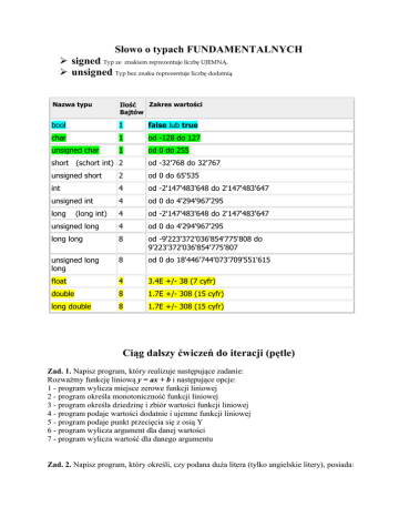 Słowo o typach FUNDAMENTALNYCH signed Typ ze znakiem reprezentuje liczbę UJEMNĄ. unsigned Typ bez znaku reprezentuje liczbę dodatnią. Nazwa typu Zakres wartości Ilość Bajtów bool 1 false lub true char 1 od -128 do 127 unsigned char 1 od 0 do 255 short (schort int) 2 od -32'768 do 32'767 unsigned short 2 od 0 do 65'535 int 4 od -2'147'483'648 do 2'147'483'647 unsigned int 4 od 0 do 4'294'967'295 long 4 od -2'147'483'648 do 2'147'483'647 unsigned long 4 od 0 do 4'294'967'295 long long 8 od -9'223'372'036'854'775'808 do 9'223'372'036'854'775'807 unsigned long long 8 od 0 do 18'446'744'073'709'551'615 float 4 3.4E +/- 38 (7 cyfr) double 8 1.7E +/- 308 (15 cyfr) long double 8 1.7E +/- 308 (15 cyfr) (long int) Ciąg dalszy ćwiczeń do iteracji (pętle) Zad. 1. Napisz program, który realizuje następujące zadanie: Rozważmy funkcję liniową y = ax + b i następujące opcje: 1 - program wylicza miejsce zerowe funkcji liniowej 2 - program określa monotoniczność funkcji liniowej 3 - program określa dziedzinę i zbiór wartości funkcji liniowej 4 - program podaje wartości dodatnie i ujemne funkcji liniowej 5 - program podaje punkt przecięcia się z osią Y 6 - program wylicza argument dla danej wartości 7 - program wylicza wartość dla danego argumentu Zad. 2. Napisz program, który określi, czy podana duża litera (tylko angielskie litery), posiada: tylko oś symetrii tylko środek symetrii jest figurą osiowo i środkowo symetryczną Zad 3. Napisz program, który wyznaczy silnię. Zad 4. Napisz program, zamieni wszystkie małe litery na duże. Wejście Ciąg składający się z małych i dużych liter zakończony kropką. Wyjście Ciąg składający się z dużych liter (bez kropki) Przykład Wejście: jestwiosna. Wyjście: JESTWIOSNA Różnica w kodzie ASCII między dużą a małą literą wynosi 32: A - 65 a – 97 B - 66 b – 98 C - 67c - 99 Zamieniamy tylko małe litery, a więc wystarczy sprawdzić, czy kod ASCII danego znaku jest większy niż 96. Zad 5. Napisz program, który wyświetli n kolejnych potęg naturalnych liczby 2. 2 do potęgi 0 jest równe 1, czyli taka musi być wartość początkowa zmiennej "potega". Przy każdym przejściu pętli, wartość zmiennej "potega" jest przemnażana przez 2 i w ten sposób otrzymujemy kolejne potęgi liczby 2. Pętla wykona się n razy. Zad6. Napisz program, który dla ciągu n liczb podawanych z klawiatury wyznaczy średnią arytmetyczną tych liczb z wykorzystaniem pętli while. Zad 7 Napisz program, który przepisze liczby z wejścia na wyjście do momentu pojawienia się liczby 2 po raz trzeci. Wejście Nieokreślony ciąg liczb Wyjście Ciąg liczb spełniający kryteria zadania. Przykład Wejście: 1234521342123 Wyjście: 1234521342