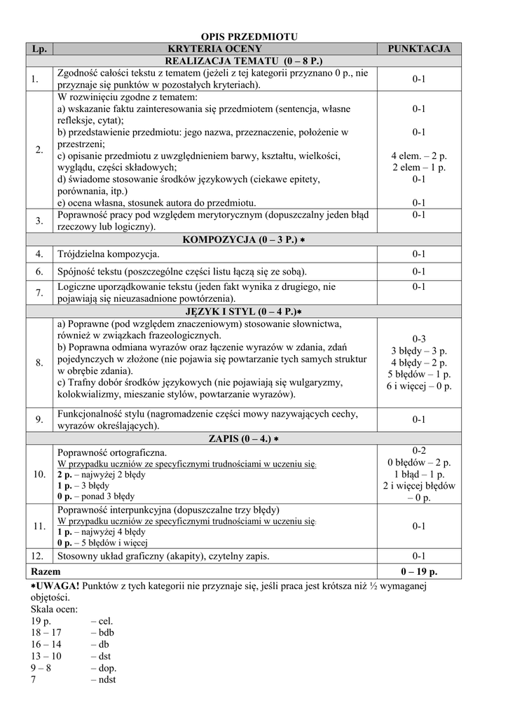 Lp. 1. 2. 3. 4. 6. 7. 8. 9. 10. OPIS PRZEDMIOTU KRYTERIA OCENY REALIZACJA TEMATU (0 – 8 P.) Zgodność całości tekstu z tematem (jeżeli z tej kategorii przyznano 0 p., nie przyznaje się punktów w pozostałych kryteriach). W rozwinięciu zgodne z tematem: a) wskazanie faktu zainteresowania się przedmiotem (sentencja, własne refleksje, cytat); b) przedstawienie przedmiotu: jego nazwa, przeznaczenie, położenie w przestrzeni; c) opisanie przedmiotu z uwzględnieniem barwy, kształtu, wielkości, wyglądu, części składowych; d) świadome stosowanie środków językowych (ciekawe epitety, porównania, itp.) e) ocena własna, stosunek autora do przedmiotu. Poprawność pracy pod względem merytorycznym (dopuszczalny jeden błąd rzeczowy lub logiczny). KOMPOZYCJA (0 – 3 P.) Trójdzielna kompozycja. Spójność tekstu (poszczególne części listu łączą się ze sobą). Logiczne uporządkowanie tekstu (jeden fakt wynika z drugiego, nie pojawiają się nieuzasadnione powtórzenia). JĘZYK I STYL (0 – 4 P.) a) Poprawne (pod względem znaczeniowym) stosowanie słownictwa, również w związkach frazeologicznych. b) Poprawna odmiana wyrazów oraz łączenie wyrazów w zdania, zdań pojedynczych w złożone (nie pojawia się powtarzanie tych samych struktur w obrębie zdania). c) Trafny dobór środków językowych (nie pojawiają się wulgaryzmy, kolokwializmy, mieszanie stylów, powtarzanie wyrazów). Funkcjonalność stylu (nagromadzenie części mowy nazywających cechy, wyrazów określających). ZAPIS (0 – 4.) Poprawność ortograficzna. W przypadku uczniów ze specyficznymi trudnościami w uczeniu się: 2 p. – najwyżej 2 błędy 1 p. – 3 błędy 0 p. – ponad 3 błędy PUNKTACJA 0-1 0-1 0-1 4 elem. – 2 p. 2 elem – 1 p. 0-1 0-1 0-1 0-1 0-1 0-1 0-3 3 błędy – 3 p. 4 błędy – 2 p. 5 błędów – 1 p. 6 i więcej – 0 p. 0-1 0-2 0 błędów – 2 p. 1 błąd – 1 p. 2 i więcej błędów – 0 p. Poprawność interpunkcyjna (dopuszczalne trzy błędy) 11. 12. W przypadku uczniów ze specyficznymi trudnościami w uczeniu się: 1 p. – najwyżej 4 błędy 0 p. – 5 błędów i więcej Stosowny układ graficzny (akapity), czytelny zapis. 0-1 0-1 Razem 0 – 19 p. UWAGA! Punktów z tych kategorii nie przyznaje się, jeśli praca jest krótsza niż ½ wymaganej objętości. Skala ocen: 19 p. – cel. 18 – 17 – bdb 16 – 14 – db 13 – 10 – dst 9–8 – dop. 7 – ndst