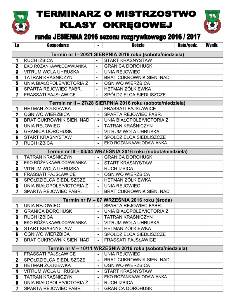 Lp Gospodarze - Goście Data/godz. Termin nr I - 20/21 SIERPNIA 2016 roku (sobota/niedziela) 1 2 3 4 5 6 7 RUCH IZBICA 1 2 3 4 5 6 7 HETMAN ŻÓŁKIEWKA OGNIWO WIERZBICA BRAT CUKROWNIK SIEN. NAD UNIA REJOWIEC GRANICA DOROHUSK START KRASNYSTAW RUCH IZBICA 1 2 3 4 5 6 7 TATRAN KRAŚNICZYN 1 2 3 4 5 6 7 UNIA REJOWIEC GRANICA DOROHUSK RUCH IZBICA 1 2 3 4 5 6 7 FRASSATI FAJSŁAWICE SPÓŁDZIELCA SIEDLISZCZE HETMAN ŻÓŁKIEWKA VITRUM WOLA UHRUSKA TATRAN KRAŚNICZYN UNIA BIAŁOPOLE/VICTORIA Ż SPARTA REJOWIEC FABR. EKO RÓŻANKA/WŁODAWIANKA VITRUM WOLA UHRUSKA TATRAN KRAŚNICZYN UNIA BIAŁOPOLE/VICTORIA Ż SPARTA REJOWIEC FABR. FRASSATI FAJSŁAWICE - START KRASNYSTAW GRANICA DOROHUSK UNIA REJOWIEC BRAT CUKROWNIK SIEN. NAD OGNIWO WIERZBICA HETMAN ŻÓŁKIEWKA SPÓŁDZIELCA SIEDLISZCZE Termin nr II – 27/28 SIERPNIA 2016 roku (sobota/niedziela) - FRASSATI FAJSŁAWICE SPARTA REJOWIEC FABR. UNIA BIAŁOPOLE/VICTORIA Ż TATRAN KRAŚNICZYN VITRUM WOLA UHRUSKA SPÓŁDZIELCA SIEDLISZCZE EKO RÓŻANKA/WŁODAWIANKA Termin nr III – 03/04 WRZEŚNIA 2016 roku (sobota/niedziela) EKO RÓŻANKA/WŁODAWIANKA VITRUM WOLA UHRUSKA FRASSATI FAJSŁAWICE SPÓŁDZIELCA SIEDLISZCZE UNIA BIAŁOPOLE/VICTORIA Ż SPARTA REJOWIEC FABR. - GRANICA DOROHUSK START KRASNYSTAW RUCH IZBICA OGNIWO WIERZBICA HETMAN ŻÓŁKIEWKA UNIA REJOWIEC BRAT CUKROWNIK SIEN. NAD Termin nr IV – 07 WRZEŚNIA 2016 roku (środa) EKO RÓŻANKA/WŁODAWIANKA START KRASNYSTAW OGNIWO WIERZBICA BRAT CUKROWNIK SIEN. NAD - SPARTA REJOWIEC FABR. UNIA BIAŁOPOLE/VICTORIA Ż TATRAN KRAŚNICZYN VITRUM WOLA UHRUSKA HETMAN ŻÓŁKIEWKA SPÓŁDZIELCA SIEDLISZCZE FRASSATI FAJSŁAWICE Termin nr V – 10/11 WRZEŚNIA 2016 roku (sobota/niedziela) - UNIA REJOWIEC BRAT CUKROWNIK SIEN. NAD OGNIWO WIERZBICA START KRASNYSTAW EKO RÓŻANKA/WŁODAWIANKA RUCH IZBICA GRANICA DOROHUSK Wynik: 1 2 3 4 5 6 7 Termin nr VI – 17/18 WRZEŚNIA 2016 roku (sobota/niedziela) - UNIA BIAŁOPOLE/VICTORIA Ż VITRUM WOLA UHRUSKA - TATRAN KRAŚNICZYN START KRASNYSTAW - OGNIWO WIERZBICA BRAT CUKROWNIK SIEN. NAD - HETMAN ŻÓŁKIEWKA UNIA REJOWIEC - SPÓŁDZIELCA SIEDLISZCZE GRANICA DOROHUSK - FRASSATI FAJSŁAWICE RUCH IZBICA - SPARTA REJOWIEC FABR. EKO RÓŻANKA/WŁODAWIANKA 1 2 3 4 5 6 7 Termin nr VII – 24/25 WRZEŚNIA 2016 roku (sobota/niedziela) OGNIWO WIERZBICA - BRAT CUKROWNIK SIEN. NAD TATRAN KRAŚNICZYN - START KRASNYSTAW UNIA BIAŁOPOLE/VICTORIA Ż - VITRUM WOLA UHRUSKA SPARTA REJOWIEC FABR. - EKO RÓŻANKA/WŁODAWIANKA FRASSATI FAJSŁAWICE - RUCH IZBICA SPÓŁDZIELCA SIEDLISZCZE - GRANICA DOROHUSK HETMAN ŻÓŁKIEWKA - UNIA REJOWIEC 1 2 3 4 5 Termin nr VIII - 01/02 PAŹDZIERNIKA 2016 roku (sobota/niedziela) START KRASNYSTAW - BRAT CUKROWNIK SIEN. NAD UNIA REJOWIEC - OGNIWO WIERZBICA GRANICA DOROHUSK - HETMAN ŻÓŁKIEWKA RUCH IZBICA - SPÓŁDZIELCA SIEDLISZCZE EKO RÓŻANKA/WŁODAWIANKA - FRASSATI FAJSŁAWICE 6 7 VITRUM WOLA UHRUSKA TATRAN KRAŚNICZYN 1 2 3 4 5 6 7 Termin nr IX – 08/09 PAŹDZIERNIKA 2016 roku (sobota/niedziela) SPARTA REJOWIEC FABR. - TATRAN KRAŚNICZYN FRASSATI FAJSŁAWICE - VITRUM WOLA UHRUSKA SPÓŁDZIELCA SIEDLISZCZE - EKO RÓŻANKA/WŁODAWIANKA HETMAN ŻÓŁKIEWKA - RUCH IZBICA OGNIWO WIERZBICA - GRANICA DOROHUSK BRAT CUKROWNIK SIEN. NAD - UNIA REJOWIEC UNIA BIAŁOPOLE/VICTORIA Ż - START KRASNYSTAW 1 2 3 4 5 6 7 Termin nr X- 15/16 PAŹDZIERNIKA 2016 roku (sobota/niedziela) RUCH IZBICA - OGNIWO WIERZBICA EKO RÓŻANKA/WŁODAWIANKA - HETMAN ŻÓŁKIEWKA VITRUM WOLA UHRUSKA - SPÓŁDZIELCA SIEDLISZCZE TATRAN KRAŚNICZYN - FRASSATI FAJSŁAWICE UNIA BIAŁOPOLE/VICTORIA Ż - SPARTA REJOWIEC FABR. START KRASNYSTAW - UNIA REJOWIEC GRANICA DOROHUSK - BRAT CUKROWNIK SIEN. NAD - SPARTA REJOWIEC FABR. UNIA BIAŁOPOLE/VICTORIA Ż 1 2 3 4 5 6 7 Termin nr XI – 22/23 PAŹDZIERNIKA 2016 roku (sobota/niedziela) HETMAN ŻÓŁKIEWKA VITRUM WOLA UHRUSKA EKO RÓŻANKA/WŁODAWIANKA OGNIWO WIERZBICA BRAT CUKROWNIK SIEN. NAD RUCH IZBICA UNIA REJOWIEC GRANICA DOROHUSK SPARTA REJOWIEC FABR. START KRASNYSTAW FRASSATI FAJSŁAWICE -- UNIA BIAŁOPOLE/VICTORIA Ż SPÓŁDZIELCA SIEDLISZCZE TATRAN KRAŚNICZYN - 1 2 3 4 5 6 7 Termin nr XII – 29/30 PAŹDZIERNIKA 2016 roku (sobota/nieziela) TATRAN KRAŚNICZYN HETMAN ŻÓŁKIEWKA UNIA BIAŁOPOLE/VICTORIA Ż SPÓŁDZIELCA SIEDLISZCZE SPARTA REJOWIEC FABR. FRASSATI FAJSŁAWICE START KRASNYSTAW GRANICA DOROHUSK RUCH IZBICA UNIA REJOWIEC EKO RÓŻANKA/WŁODAWIANKA BRAT CUKROWNIK SIEN. NAD VITRUM WOLA UHRUSKA OGNIWO WIERZBICA - 1 2 3 4 5 6 7 Termin nr XIII – 05/06 LISTOPADA 2016 roku (sobota/niedziela) EKO RÓŻANKA/WŁODAWIANKA UNIA REJOWIEC FRASSATI FAJSŁAWICE START KRASNYSTAW HETMAN ŻÓŁKIEWKA UNIA BIAŁOPOLE/VICTORIA Ż BRAT CUKROWNIK SIEN. NAD VITRUM WOLA UHRUSKA GRANICA DOROHUSK RUCH IZBICA SPÓŁDZIELCA SIEDLISZCZE SPARTA REJOWIEC FABR. OGNIWO WIERZBICA TATRAN KRAŚNICZYN - Uwagi do terminarza : 1. Na podstawie niniejszego terminarza – kluby pełniące rolę gospodarza zawodów zobowiązane są ustalić konkretne daty, godziny i miejsca rozpoczęcia zawodów w całej rundzie i przesłać na piśmie (listem poleconym, faksem lub e-mailem) – w terminie nie krótszym niż 14 dni przed rozpoczęciem rundy rozgrywkowej organowi prowadzącemu rozgrywki tj. ChOZPN oraz pozostałym drużynom. W przypadku, gdy gospodarz nie wyznaczy godzin rozegrania zawodów – zostaną one rozegrane w rundzie jesiennej w niedzielę zgodnie z terminarzem w następujących godzinach : Kol. I – VII (sierpień – wrzesień) juniorzy - godz. 12:45 seniorzy - godz. 15:00 Kol. VIII – XIII (październik – listopad) juniorzy - godz. 11:45 seniorzy - godz. 14:00 2. *W kolejce rozgrywanej w środku tygodnia (IV kolejka) Wydział Gier ChOZPN ustala obligatoryjne godziny rozegrania zawodów – 14:45 - juniorzy i 17:00 – seniorzy 3. W rundzie jesiennej klub nie może wyznaczyć godziny rozegrania zawodów w niedzielę, nie później niż na godzinę 16:00. 4. Informujemy, że każdy klub klasy okręgowej będąc gospodarzem zawodów w rundzie jesienne