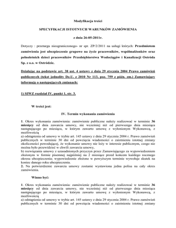 Modyfikacja treści SPECYFIKACJI ISTOTNYCH WARUNKÓW ZAMÓWIENIA z dnia 26-05-2011r. Dotyczy : przetargu nieograniczonego- nr spr. ZP/2/2011 na usługi których: Przedmiotem zamówienia jest ubezpieczenie grupowe na życie pracowników, współmałżonków oraz pełnoletnich dzieci pracowników Przedsiębiorstwa Wodociągów i Kanalizacji Ostróda Sp. z o.o. w Ostródzie. Działając na podstawie art. 38 ust. 4 ustawy z dnia 29 stycznia 2004 Prawo zamówień publicznych (tekst jednolity Dz.U. z 2010 Nr 113, poz. 759 z późn. zm.) Zamawiający informuję o następujących zmianach: 1) SIWZ rozdział IV, punkt 1, str. 3. W treści jest: IV. Termin wykonania zamówienia 1. Okres wykonania zamówienia: zamówienie publiczne należy realizować w terminie 36 miesięcy od dnia zawarcia umowy, nie wcześniej niż od pierwszego dnia miesiąca następującego po miesiącu, w którym zawarto umowę z wyłonionym Wykonawcą, z możliwością a) odstąpienia od umowy w trybie art. 145 ustawy z dnia 29 stycznia 2004 r. Prawo zamówień publicznych w terminie 30 dni od powzięcia wiadomości o zaistnieniu istotnej zmiany okoliczności powodującej, że wykonanie umowy nie leży w interesie publicznym, czego nie można było przewidzieć w chwili zawarcia umowy, b) rozwiązania umowy z uzasadnionych przyczyn przez Zamawiającego za wypowiedzeniem złożonym w formie pisemnej najpóźniej na 2 miesiące przed końcem każdego rocznego okresu ubezpieczenia; wypowiedzenie złożone w powyższym terminie wywołuje skutek na koniec danego roku ubezpieczenia. 2. Na potwierdzenie zawarcia umowy zostanie wystawiona jedna polisa na cały okres zamówienia. Winno być: 1. Okres wykonania zamówienia: zamówienie publiczne należy realizować w terminie 36 miesięcy od dnia zawarcia umowy, nie wcześniej niż od pierwszego dnia miesiąca następującego po miesiącu, w którym zawarto umowę z wyłonionym Wykonawcą, z możliwością a) odstąpienia od umowy w trybie art. 145 ustawy z dnia 29 stycznia 2004 r. Prawo zamówień publicznych w terminie 30 dni od powzięcia wiadomości o zaistnieniu istotnej zmiany okoliczności powodującej, że wykonanie umowy nie leży w interesie publicznym, czego nie można było przewidzieć w chwili zawarcia umowy, b) rozwiązania umowy z uzasadnionych przyczyn przez Zamawiającego za wypowiedzeniem złożonym w formie pisemnej najpóźniej na 2 miesiące przed końcem każdego rocznego okresu ubezpieczenia; wypowiedzenie złożone w powyższym terminie wywołuje skutek na koniec danego roku ubezpieczenia. 2. Zamawiający zastrzega, iż umowa zawarta będzie na okres 24 miesięcy, z możliwością automatycznego przedłużenia umowy na kolejny okres 12 – miesięczny pod warunkiem, że żadna ze stron umowy nie złoży w terminie co najmniej 120 dni przed końcem podstawowego 24 miesięcznego okresu trwania umowy, oświadczenia o nieprzedłużaniu umowy na następny 12 – miesięczny okres. 3. Na potwierdzenie zawarcia umowy zostaną wystawione polisy na cały 24 – miesięczny okres zamówienia, przewidujące możliwość automatycznego przedłużenia umowy ubezpieczenia na kolejny 12 – miesięczny okres. 2) Załącznik nr 2 do SIWZ, str. 45 pod tabelami opisującymi wysokości świadczeń: W treści jest: Termin wykonania zamówienia: 36 miesięcy od dnia zawarcia umowy, nie wcześniej niż od pierwszego dnia miesiąca następującego po miesiącu, w którym zawarto umowę z wyłonionym Wykonawcą. Winno być: Termin wykonania zamówienia: 36 miesięcy od dnia zawarcia umowy, nie wcześniej niż od pierwszego dnia miesiąca następującego po miesiącu, w którym zawarto umowę z wyłonionym Wykonawcą. Zamawiający zastrzega, iż umowa zawarta będzie na okres 24 miesięcy, z możliwością automatycznego przedłużenia umowy na kolejny okres 12 – miesięczny pod warunkiem, że żadna ze stron umowy nie złoży w terminie co najmniej 120 dni przed końcem podstawowego 24 miesięcznego okresu trwania umowy, oświadczenia o nieprzedłużaniu umowy na następny 12 – miesięczny okres. 3) Załącznik nr 4 do SIWZ, § 8, pkt. 3, str. 45: W treści jest: Termin wykonania zamówienia §8 1. Okres wykonania zamówienia: zamówienie publiczne należy realizować w terminie 36 miesięcy od dnia zawarcia umowy, nie wcześniej niż od pierwszego dnia miesiąca następującego po miesiącu, w którym zawarto umowę z wyłonionym Wykonawcą, z możliwością a) odstąpienia od umowy w trybie art. 145 ustawy z dnia 29 stycznia 2004 r. Prawo zamówień publicznych w terminie 30 dni od powzięcia wiadomości o zaistnieniu istotnej zmiany okoliczności powodującej, że wykonanie umowy nie leży w interesie publicznym, czego nie można było przewidzieć w chwili zawarcia umowy, b) rozwiązania umowy z uzasadnionych przyczyn przez Zamawiającego za wypowiedzeniem złożonym w formie pisemnej najpóźniej na 2 miesiące przed końcem każdego rocznego okresu ubezpieczenia; wypowiedzenie złożone w powyższym terminie wywołuje skutek na koniec danego roku ubezpieczenia. 2. Na potwierdzenie zawarcia umowy zostanie wystawiona jedna polisa na cały okres zamówienia. Winno być: Termin wykonania zamówienia §8 1. Okres wykonania zamówienia: zamówienie publiczne należy realizować w terminie 36 miesięcy od dnia zawarcia umowy, nie wcześniej niż od pierwszego dnia miesiąca następującego po miesiącu, w którym zawarto umowę z wyłonionym Wykonawcą, z możliwością a) odstąpienia od umowy w trybie art. 145 ustawy z dnia 29 stycznia 2004 r. Prawo zamówień publicznych w terminie 30 dni od powzięcia wiadomości o zaistnieniu istotnej zmiany okoliczności powodującej, że wykonanie umowy nie leży w interesie publicznym, czego nie można było przewidzieć w chwili zawarcia umowy, b) rozwiązania umowy z uzasadnionych przyczyn przez Zamawiającego za wypowiedzeniem złożonym w formie pisemnej najpóźniej na 2 miesiące przed końcem każdego rocznego okresu ubezpieczenia; 