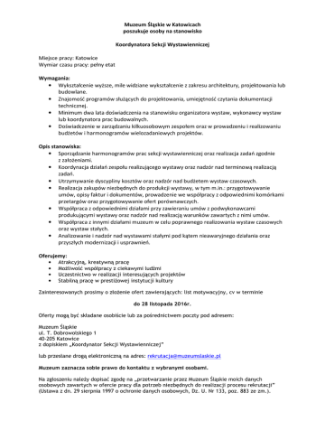 Muzeum Śląskie w Katowicach poszukuje osoby na stanowisko Koordynatora Sekcji Wystawienniczej Miejsce pracy: Katowice Wymiar czasu pracy: pełny etat Wymagania: • Wykształcenie wyższe, mile widziane wykształcenie z zakresu architektury, projektowania lub budowlane. • Znajomość programów służących do projektowania, umiejętność czytania dokumentacji technicznej. • Minimum dwa lata doświadczenia na stanowisku organizatora wystaw, wykonawcy wystaw lub koordynatora prac budowalnych. • Doświadczenie w zarządzaniu kilkuosobowym zespołem oraz w prowadzeniu i realizowaniu budżetów i harmonogramów wielozadaniowych projektów. Opis stanowiska: • Sporządzanie harmonogramów prac sekcji wystawienniczej oraz realizacja zadań zgodnie z założeniami. • Koordynacja działań zespołu realizującego wystawy oraz nadzór nad terminową realizacją zadań. • Utrzymywanie dyscypliny kosztów oraz nadzór nad budżetem wystaw czasowych. • Realizacja zakupów niezbędnych do produkcji wystawy, w tym m.in.: przygotowywanie umów, opisy faktur i dokumentów, prowadzenie we współpracy z odpowiednimi komórkami przetargów oraz przygotowywanie ofert porównawczych. • Współpraca z odpowiednimi działami przy zawieraniu umów z podwykonawcami produkującymi wystawy oraz nadzór nad realizacją warunków zawartych z nimi umów. • Współpraca z innymi działami muzeum w celu poprawnego realizowania wystaw czasowych oraz wystaw stałych. • Analizowanie i nadzór nad wystawami stałymi pod kątem nieawaryjnego działania oraz przyszłych modernizacji i usprawnień. Oferujemy: • • • • Atrakcyjną, kreatywną pracę Możliwość współpracy z ciekawymi ludźmi Uczestnictwo w realizacji interesujących projektów Stabilną pracę w prestiżowej instytucji kultury Zainteresowanych prosimy o złożenie ofert zawierających: list motywacyjny, cv w terminie do 28 listopada 2016r. Oferty mogą być składane osobiście lub za pośrednictwem poczty pod adresem: Muzeum Śląskie ul. T. Dobrowolskiego 1 40-205 Katowice z dopiskiem „Koordynator Sekcji Wystawienniczej” lub przesłane drogą elektroniczną na adres: [email protected] Muzeum zaznacza sobie prawo do kontaktu z wybranymi osobami. Na zgłoszeniu należy dopisać zgodę na „przetwarzanie przez Muzeum Śląskie moich danych osobowych zawartych w ofercie pracy dla potrzeb niezbędnych do realizacji procesu rekrutacji” (Ustawa z dn. 29 sierpnia 1997 o ochronie danych osobowych, Dz. U. Nr 133, poz. 883 ze zm.).