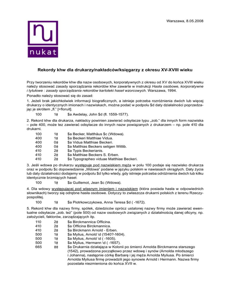 Warszawa, 8.05.2008 Rekordy khw dla drukarzy/nakładców/księgarzy z okresu XV-XVIII wieku Przy tworzeniu rekordów khw dla nazw osobowych, korporatywnych z okresu od XV do końca XVIII wieku należy stosować zasady sporządzania rekordów khw zawarte w instrukcji Hasła osobowe, korporatywne i tytułowe : zasady sporządzania rekordów kartoteki haseł wzorcowych. Warszawa, 1994. Ponadto należy stosować się do zasad: 1. Jeżeli brak jakichkolwiek informacji biograficznych, a istnieje potrzeba rozróżnienia dwóch lub więcej drukarzy o identycznych imionach i nazwiskach, można podać w podpolu $d daty działalności poprzedzając je skrótem „fl.” [=floruit]. 1001@ $a Awdelay, John $d (fl. 1559-1577). 2. Rekord khw dla drukarza, nakładcy powinien zawierać odsyłacze typu „zob.“ dla innych form nazwiska – pole 400, może tez zawierać odsyłacze do innych nazw powiązanych z drukarzem – np. pole 410 dla drukarni. 1001@ $a Becker, Matthäus $c (Wdowa). 4001@ $a Beckeri Matthiae Vidua. 4000@ $a Vidua Matthiae Beckeri. 4000@ $a Matthias Beckers seligen Wittib. 4102@ $a Typis Beckerianis. 4102@ $a Matthiae Beckers S. Erben. 4102@ $a Typographeo viduae Matthiae Beckeri. 3. Jeśli wdowa po drukarzu występuje pod nazwiskiem męża w polu 100 podaje się nazwisko drukarza oraz w podpolu $c dopowiedzenie „Wdowa” podane w języku polskim w nawiasach okrągłych. Daty życia lub daty działalności dodajemy w podpolu $d tylko wtedy, gdy istnieje potrzeba odróżnienia dwóch lub kilku identycznie brzmiących haseł. 1001@ $a Guillemot, Jean $c (Wdowa). 4. Dla wdowy występującej pod własnym imieniem i nazwiskiem (która posiada hasła w odpowiednich słownikach) tworzy się odrębne hasła osobowe. Dotyczy to zwłaszcza drukarni polskich z terenu Rzeczypospolitej. 1001@ $a Piotrkowczykowa, Anna Teresa $d ( -1672). 5. Rekord khw dla nazwy firmy, spółek, dziedziców oprócz ustalonej nazwy firmy może zawierać ewentualne odsyłacze „zob. też” (pole 500) od nazw osobowych związanych z działalnością danej oficyny, np. założycieli, faktorów, zarządzających itp. 1102@ $a Birckmannica Officina. 4102@ $a Officina Birckmannica. 4102@ $a Birckmann Arnold - Erben. 5001@ $a Mylius, Arnold \d (1540?-1604). 5001@ $a Mylius, Arnold \d ( -1605). 5001@ $a Mylius, Hermann \d ( -1657). 665 @@ $a Drukarnia działająca w Kolonii po śmierci Arnolda Birckmanna starszego (1542), prowadzona początkowo przez wdowę i synów (Arnolda młodszego i Johanna), następnie córkę Barbarę i jej męża Arnolda Myliusa. Po śmierci Arnolda Myliusa firmę prowadzili jego synowie Arnold i Hermann. Nazwa firmy pozostała niezmieniona do końca XVII w.