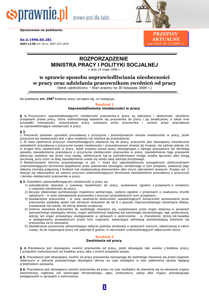 ROZPORZĄDZENIE MINISTRA PRACY I POLITYKI SOCJALNEJ w sprawie sposobu usprawiedliwiania nieobecności w pracy oraz udzielania pracownikom zwolnień od pracy Opracowano na podstawie: PRZEPISY AKTUALNE Dz.U.1996.60.281 (na dzień 30.11.2009 r.) 2007.12.05 zm. Dz.U. 2007.227.1678 ROZPORZĄDZENIE MINISTRA PRACY I POLITYKI SOCJALNEJ z dnia 15 maja 1996 r. w sprawie sposobu usprawiedliwiania nieobecności w pracy oraz udzielania pracownikom zwolnień od pracy (tekst ujednolicony – Stan prawny na 30 listopada 2009 r.) Na podstawie art. 2982 Kodeksu pracy zarządza się, co następuje: Rozdział 1 Usprawiedliwianie nieobecności w pracy § 1. Przyczynami usprawiedliwiającymi nieobecność pracownika w pracy są zdarzenia i okoliczności określone przepisami prawa pracy, które uniemożliwiają stawienie się pracownika do pracy i jej świadczenie, a także inne przypadki niemożności wykonywania pracy wskazane przez pracownika i uznane przez pracodawcę za usprawiedliwiające nieobecność w pracy. § 2. 1. Pracownik powinien uprzedzić pracodawcę o przyczynie i przewidywanym okresie nieobecności w pracy, jeżeli przyczyna tej nieobecności jest z góry wiadoma lub możliwa do przewidzenia. 2. W razie zaistnienia przyczyn uniemożliwiających stawienie się do pracy, pracownik jest obowiązany niezwłocznie zawiadomić pracodawcę o przyczynie swojej nieobecności i przewidywanym okresie jej trwania, nie później jednak niż w drugim dniu nieobecności w pracy. Jeżeli przepisy prawa pracy obowiązujące u danego pracodawcy nie określają sposobu zawiadomienia pracodawcy o przyczynie nieobecności pracownika w pracy, zawiadomienia tego pracownik dokonuje osobiście lub przez inną osobę, telefonicznie lub za pośrednictwem innego środka łączności albo drogą pocztową, przy czym za datę zawiadomienia uważa się wtedy datę stempla pocztowego. 3. Niedotrzymanie terminu przewidzianego w ust. 1 może być usprawiedliwione szczególnymi okolicznościami uniemożliwiającymi terminowe dopełnienie przez pracownika obowiązku określonego w tym przepisie, zwłaszcza jego obłożną chorobą połączoną z brakiem lub nieobecnością domowników albo innym zdarzeniem losowym. Przepis ust. 2 stosuje się odpowiednio po ustaniu przyczyn uniemożliwiających terminowe zawiadomienie pracodawcy o przyczynie i okresie nieobecności pracownika w pracy. § 3. Dowodami usprawiedliwiającymi nieobecność w pracy są: 1) zaświadczenie lekarskie o czasowej niezdolności do pracy, wystawione zgodnie z przepisami o orzekaniu o czasowej niezdolności do pracy, 2) decyzja właściwego państwowego inspektora sanitarnego, wydana zgodnie z przepisami o zwalczaniu chorób zakaźnych - w razie odosobnienia pracownika z przyczyn przewidzianych tymi przepisami, 3) oświadczenie pracownika - w razie zaistnienia okoliczności uzasadniających konieczność sprawowania przez pracownika osobistej opieki nad zdrowym dzieckiem do lat 8 z powodu nieprzewidzianego zamknięcia żłobka, przedszkola lub szkoły, do której dziecko uczęszcza, 4) imienne wezwanie pracownika do osobistego stawienia się, wystosowane przez organ właściwy w sprawach powszechnego obowiązku obrony, organ administracji rządowej lub samorządu terytorialnego, sąd, prokuraturę, policję lub organ prowadzący postępowanie w sprawach o wykroczenia - w charakterze strony lub świadka w postępowaniu prowadzonym przed tymi organami, zawierające adnotację potwierdzającą stawienie się pracownika na to wezwanie, 5) oświadczenie pracownika potwierdzające odbycie podróży służbowej w godzinach nocnych, zakończonej w takim czasie, że do rozpoczęcia pracy nie upłynęło 8 godzin, w warunkach uniemożliwiających odpoczynek nocny. Rozdział 2 Zwolnienia od pracy § 4. Pracodawca jest obowiązany zwolnić pracownika od pracy, jeżeli obowiązek taki wynika z Kodeksu pracy, z przepisów wykonawczych do Kodeksu pracy albo z innych przepisów prawa. § 5. Pracodawca jest obowiązany zwolnić od pracy pracownika wezwanego do osobistego stawienia się przed organem właściwym w zakresie powszechnego obowiązku obrony na czas niezbędny w celu załatwienia sprawy będącej przedmiotem wezwania. § 6. Pracodawca jest obowiązany zwolnić pracownika od pracy na czas niezbędny do stawienia się na wezwanie organu administracji rządowej lub samorządu terytorialnego, sądu, prokuratury, policji albo organu prowadzącego postępowanie w sprawach o wykroczenia. 1 ROZPORZĄDZENIE MINISTRA PRACY I POLITYKI SOCJALNEJ w sprawie sposobu usprawiedliwiania nieobecności w pracy oraz udzielania pracownikom zwolnień od pracy § 7. Pracodawca jest obowiązany zwolnić od pracy pracownika wezwanego w celu wykonywania czynności biegłego w postępowaniu administracyjnym, karnym przygotowawczym, sądowym lub przed kolegium do spraw wykroczeń; łączny wymiar zwolnień z tego tytułu nie może przekraczać 6 dni w ciągu roku kalendarzowego. § 8. Pracodawca jest obowiązany zwolnić od pracy pracownika na czas niezbędny do wzięcia udziału w posiedzeniu komisji pojednawczej w charakterze członka tej komisji. Dotyczy to także pracownika będącego stroną lub świadkiem w postępowaniu pojednawczym. § 9. Pracodawca jest obowiązany zwolnić od pracy pracownika na czas niezbędny do przeprowadzenia obowiązkowych badań lekarskich i szczepień ochronnych przewidzianych przepisami o zwalczaniu chorób zakaźnych, o zwalczaniu gruźlicy oraz o zwalczaniu chorób wenerycznych. § 10. Pracodawca jest obowiązany zwolnić od pracy pracownika wezwanego w charakterze świadka w postępowaniu kontrolnym prowadzonym przez Najwyższą Izbę Kontroli i pracownika powołanego do udziału w tym postępowaniu w charakterze specjalisty. § 11. 1. Pracodawca jest obowiązany zwolnić od pracy pracownika: 1) będącego członkiem ochotniczej straży pożarnej na czas niezbędny do uczestniczenia w działaniach ratowniczych i do wypoczynku koniecznego po ich zakończ