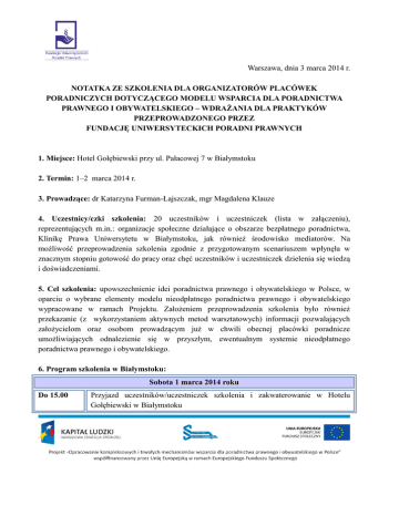 Warszawa, dnia 3 marca 2014 r. NOTATKA ZE SZKOLENIA DLA ORGANIZATORÓW PLACÓWEK PORADNICZYCH DOTYCZĄCEGO MODELU WSPARCIA DLA PORADNICTWA PRAWNEGO I OBYWATELSKIEGO – WDRAŻANIA DLA PRAKTYKÓW PRZEPROWADZONEGO PRZEZ FUNDACJĘ UNIWERSYTECKICH PORADNI PRAWNYCH 1. Miejsce: Hotel Gołębiewski przy ul. Pałacowej 7 w Białymstoku 2. Termin: 1–2 marca 2014 r. 3. Prowadzące: dr Katarzyna Furman-Łajszczak, mgr Magdalena Klauze 4. Uczestnicy/czki szkolenia: 20 uczestników i uczestniczek (lista w załączeniu), reprezentujących m.in.: organizacje społeczne działające o obszarze bezpłatnego poradnictwa, Klinikę Prawa Uniwersytetu w Białymstoku, jak również środowisko mediatorów. Na możliwość przeprowadzenia szkolenia zgodnie z przygotowanym scenariuszem wpłynęła w znacznym stopniu gotowość do pracy oraz chęć uczestników i uczestniczek dzielenia się wiedzą i doświadczeniami. 5. Cel szkolenia: upowszechnienie idei poradnictwa prawnego i obywatelskiego w Polsce, w oparciu o wybrane elementy modelu nieodpłatnego poradnictwa prawnego i obywatelskiego wypracowane w ramach Projektu. Założeniem przeprowadzenia szkolenia było również przekazanie (z wykorzystaniem aktywnych metod warsztatowych) informacji pozwalających założycielom oraz osobom prowadzącym już w chwili obecnej placówki poradnicze umożliwiających odnalezienie się w przyszłym, ewentualnym systemie nieodpłatnego poradnictwa prawnego i obywatelskiego. 6. Program szkolenia w Białymstoku: Sobota 1 marca 2014 roku Do 15.00 Przyjazd uczestników/uczestniczek szkolenia i zakwaterowanie w Hotelu Gołębiewski w Białymstoku 15.00-16.30 Cz. I szkolenia – przedstawienie się trenerek, zapoznanie się uczestników, przedstawienie celów szkolenia oraz prezentacja (Power Point) z ogólnymi informacjami o projekcie poradnictwa prawnego i obywatelskiego 16.30-16.45 Przerwa kawowa 16.45-18.45 Cz. II szkolenia – prezentacja wyników badań i analiz przeprowadzonych w ramach projektu (prezentacje w Power Point – jedna dotycząca historii nieodpłatnego poradnictwa i doświadczeń z państw zagranicznych w tym zakresie, w tym w oparciu o analizę danych zastanych INPRIS, a druga – obejmująca wyniki badań przeprowadzonych w ramach projektu przez ISP), dyskusja dotycząca wyników badań oraz odpowiedzi trenerki na pytania uczestników szkolenia dotyczące tych badań. 19.00-20.00 Kolacja w restauracji Hotelu Gołębiewski Niedziela 2 marca 2014 roku 8.00 – 9.00 Śniadanie w Hotelu Gołębiewski 9.00 – 11.00 Cz. III szkolenia – Blok I Beneficjenci – tu m.in. prezentacja modelu w części dotyczącej beneficjentów (prezentacja Power Point), następnie „burza mózgów” – jak profil beneficjenta wpływa/powinien wpływać na organizację punktu poradniczego?; dyskusja. Blok II – Usługodawcy – prezentacja obejmująca odpowiednią część modelu, dyskusja. 11.00 – 11.15 przerwa kawowa 11.15 – 13.15 Cz. IV szkolenia – warunki konieczne do funkcjonowania punktu poradniczego w ramach proponowanego modelu, standardy działania punktów poradniczych; tu m.in. ćwiczenia interaktywne – praca w grupach na koncepcją czy spełniam/co muszę zrobić by się dostosować do poszczególnych standardów, opracowanie przez uczestników plakatów z wykorzystaniem wycinanek z prasy i prezentacja prac przez przedstawicieli poszczególnych grup; na tym tle dyskusja nad poszczególnymi standardami. 13.15 – 14.30 Obiad w restauracji Hotelu Gołębiewski 14.30 – 16.30 Cz. V szkolenia – tu przede wszystkim: analiza problematyki najczęstszych problemów spotykanych w trakcie prowadzenia punktów poradniczych, praca uczestników w grupach na podanych kazusach, następnie omówienie wyników tych prac przy komentarzach trenerki i pozostałych uczestników; prezentacja mapy poradnictwa i poradnika do niej, dyskusja na temat wagi rozpowszechniania informacji na temat punktów poradniczych. 16.30 – 18.00 Podsumowanie poszczególnych części szkolenia i jego całego, wypełnienie ankiet ewaluacyjnych przez uczestników, zakończenie szkolenia, pożegnanie. 7. Przebieg szkolenia: Koncepcje systemowe wypracowane w Projekcie zostały przez trenerki szczegółowo przedstawione z wykorzystaniem aktywnych metod warsztatowych. W ankietach ewaluacyjnych uczestnicy i uczestniczki wysoko ocenili zarówno stronę organizacyjną szkolenia, jak również kompetencje trenerek. Cel szkolenia został zrealizowany, z zachowaniem ram czasowych przewidzianych na szkolenie. Uczestnicy dyskusji, które wywiązywały się w trakcie trwania szkolenia odnosili się do poszczególnych zagadnień w sposób konstruktywny, szczególnie w aspekcie konieczności wprowadzenia standaryzacji pracy placówek poradniczych w ramach systemu. Oprac. dr Katarzyna Furman-Łajszczak, trenerka, FUPP