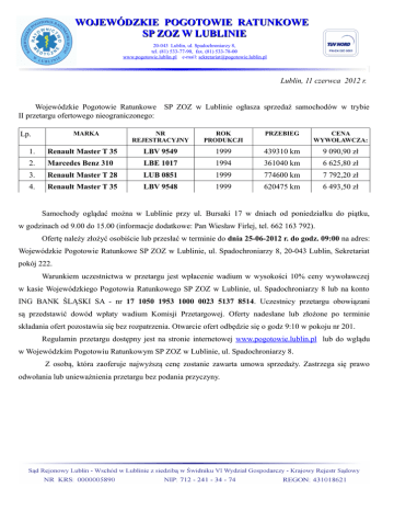 WOJEWÓDZKIE POGOTOWIE RATUNKOWE SP ZOZ W LUBLINIE 20-043 Lublin, ul. Spadochroniarzy 8, tel. (81) 533-77-90, fax. (81) 533-78-00 www.pogotowie.lublin.pl e-mail: [email protected] Lublin, 11 czerwca 2012 r. Wojewódzkie Pogotowie Ratunkowe SP ZOZ w Lublinie ogłasza sprzedaż samochodów w trybie II przetargu ofertowego nieograniczonego: MARKA Lp. NR REJESTRACYJNY ROK PRODUKCJI PRZEBIEG CENA WYWOŁAWCZA: 1. Renault Master T 35 LBV 9549 1999 439310 km 9 090,90 zł 2. Marcedes Benz 310 LBE 1017 1994 361040 km 6 625,80 zł 3. Renault Master T 28 LUB 0851 1999 774600 km 7 792,20 zł 4. Renault Master T 35 LBV 9548 1999 620475 km 6 493,50 zł Samochody oglądać można w Lublinie przy ul. Bursaki 17 w dniach od poniedziałku do piątku, w godzinach od 9.00 do 15.00 (informacje dodatkowe: Pan Wiesław Firlej, tel. 662 163 792). Ofertę należy złożyć osobiście lub przesłać w terminie do dnia 25-06-2012 r. do godz. 09:00 na adres: Wojewódzkie Pogotowie Ratunkowe SP ZOZ w Lublinie, ul. Spadochroniarzy 8, 20-043 Lublin, Sekretariat pokój 222. Warunkiem uczestnictwa w przetargu jest wpłacenie wadium w wysokości 10% ceny wywoławczej w kasie Wojewódzkiego Pogotowia Ratunkowego SP ZOZ w Lublinie, ul. Spadochroniarzy 8 lub na konto ING BANK ŚLĄSKI SA - nr 17 1050 1953 1000 0023 5137 8514. Uczestnicy przetargu obowiązani są przedstawić dowód wpłaty wadium Komisji Przetargowej. Oferty nadesłane lub złożone po terminie składania ofert pozostawia się bez rozpatrzenia. Otwarcie ofert odbędzie się o godz 9:10 w pokoju nr 201. Regulamin przetargu dostępny jest na stronie internetowej www.pogotowie.lublin.pl lub do wglądu w Wojewódzkim Pogotowiu Ratunkowym SP ZOZ w Lublinie, ul. Spadochroniarzy 8. Z osobą, która zaoferuje najwyższą cenę zostanie zawarta umowa sprzedaży. Zastrzega się prawo odwołania lub unieważnienia przetargu bez podania przyczyny.