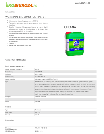 Izabelin 2017-03-08 Karta produktu: WC cleaning gel, DOMESTOS, Pine, 5 l Kills bacteria, viruses, fungi, etc. even in 99.99%; Protects the bathroom against spraying germs when flushing the toilet; Contains Molecules of Hygiene, and thanks to this the liquid adheres to the surface of the toilet bowl by far longer than other products available on the market; With bleaching properties, can be used directly on the cleaned surfaces; It is a condensed cleanser-disinfectant liquid, which removes unpleasant smells coming out of places such as toilet bowl, sink or wash-basin; Capacity: 5 l Special offer is valid until stocks last. Cena 30,26 PLN brutto Basic product parameters Numer produktu w systemie 25119 Nr dostawcy HG-163588 Nr Celcen 2369-00159 Kod kreskowy 7615400163588 Nazwa produktu WC cleaning gel, DOMESTOS, Pine, 5 l Opis Kills bacteria, viruses, fungi, etc. even in 99.99%;; protects the bathroom against spraying germs when flushing the toilet;; contains Molecules of Hygiene, and thanks to this the liquid adheres to the surface of the toilet bowl by far longer than other products available on the market;; with bleaching properties, can be used directly on the cleaned surfaces;; it is a condensed cleanser-disinfectant liquid, which removes unpleasant smells coming out of places such as toilet bowl, sink or wash-basin;; capacity: 5 l; Special offer is valid until stocks last. Kategoria Cleaning products Brand CHEMIA Feature Type For toilet Offer from 2015-09 Product Liquid Dimensions Eko biuro ul Krasińskiego 23a 05-080 Izabelin NIP: 527-000-75-75 22 864 54 84 Izabelin 2017-03-08 Karta katalogowa produktu cd. WC cleaning gel, DOMESTOS, Pine, 5 l Capacity (ml) 5000 Procurement vocabulary CPV 39830000-9 Środki czyszczące Certifications New product Standard Hit Standard Serdecznie zapraszamy do współpracy Eko biuro zespół. Eko biuro ul Krasińskiego 23a 05-080 Izabelin NIP: 527-000-75-75 22 864 54 84