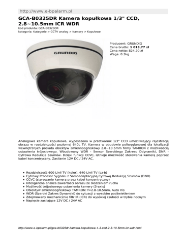 http://www.e-bpalarm.pl GCA-B0325DR Kamera kopułkowa 1/3" CCD, 2.8~10.5mm ICR WDR kod produktu: GCA-B0325DR kategoria: Kategorie > CCTV analog > Kamery > Kopułowe Producent: GRUNDIG Cena brutto: 1 013,77 zł Cena netto: 824,20 zł Waga: 0.3kg Analogowa kamera kopułkowa, wyposażona w przetwornik 1/3" CCD umożliwiający rejestrację obrazu w rozdzielczości poziomej 640L TV. Kamera w obudowie poliwęglanowej dla lokalizacji wewnętrznych posiada obiektyw zmiennoogniskowy 2.8~10.5mm firmy TAMRON z możliwością ustawienia trójosiowego. Wbudowany WDR - Sensor Szerokiego Zakresu Ddynamiki, DNR Cyfrowa Redukcja Szumów. Dzięki funkcji CCVC, istnieje możliwość sterowania kamerą poprzez kabel koncentryczny. Zasilanie 12V DC / 24V AC. Rozdzielczość 600 Linii TV (kolor), 640 Linii TV (cz-b) Cyfrowy Procesor Sygnału z Samoadaptacyjną Cyfrową Redukcją Szumów (DNR) CCVC (sterowanie kamerą przez kabel koncentryczny) Inteligentna analiza zawartości obrazu ze śledzeniem ruchu Możliwość trójosiowego ustawienia kamery (3-axis) Obiektyw zmiennoogniskowy TAMRON: f=2.8-10.5mm, Auto Iris WDR (Szeroki Zakres Dynamiki) do sytuacji z wysokim podświetleniem Zdejmowany mechanicznie filtr IR (ICR) do wysokiej czułości w trybie nocnym Napięcie zasilające 12V DC / 24V AC http://www.e-bpalarm.pl/gca-b0325dr-kamera-kopulkowa-1-3-ccd-2-8-10-5mm-icr-wdr.html