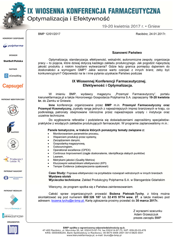 BMP 12/01/2017 Racibórz, 24.01.2017r. Szanowni Państwo Optymalizacja, standaryzacja, efektywność, wskaźniki, autonomiczne zespoły, organizacja pracy – to pojęcia, które dzisiaj dotyczą każdego zakładu produkcyjnego. Jak pogodzić najwyższą jakość produktu z niskim kosztami wytwarzania? Gdzie leży granica pomiędzy dążeniem do doskonałości a wymogami GMP? Jakie wzorce warto czerpać z innych branż, żeby być konkurencyjnym? Odpowiedzi na te i inne pytania uzyskacie Państwo podczas IX Wiosennej Konferencji Farmaceutycznej. Efektywność i Optymalizacja. W imieniu BMP, wydawcy magazynu „Przemysł Farmaceutyczny”, portalu kierunekfarmacja.pl a także Honorowego Gospodarza Polpharma S.A. zapraszamy 19-20 kwietnia br. do Zamku w Gniewie. Inne konferencje organizowane przez BMP m.in. Przemysł Farmaceutyczny oraz Przemysł Kosmetyczny, zyskały rangę jednych z najważniejszych imprez branżowych w kraju, co podkreślają patronaty obejmowane rokrocznie przez najważniejsze urzędy i instytucje oraz uczelnie techniczne. Do wygłoszenia referatów i podzielenia się doświadczeniami zaprosiliśmy specjalistówpraktyków z wiodących zakładów produkujących farmaceutyki. W programie zaplanowaliśmy m.in.: Panele tematyczne, w trakcie których poruszymy tematy związane z: • • • • • • • • • • • Monitorowaniem parametrów procesu, Wsparciem produkcji przez systemy, Zarządzaniem danymi, Gospodarką magazynową, Outsourcingiem, Operational excellence (OPEX) Continous Improvement (ciągłe doskonalenie, identyfikacja słabych punktów) Leanem, Metrykami jakości (Quality Metrics) Kluczowymi wskaźnikami efektywności (KPI) Temper Evidence (zabezpieczenia opakowań) Case Study: Poprawa efektywności na przykładzie rozwiązań wdrożonych w innych branżach Wystawa stoisk Wycieczka techniczna: Zakład Produkcyjny Polpharma S.A. w Starogardzie Gdańskim Wierzymy, że program spotka się z Państwa zainteresowaniem. Całość spraw organizacyjnych prowadzi Bożena Pietrzak-Tychy, z którą można skontaktować się pod numerem 600 326 187 lub 32 415 9774 wew. 27, a także mailowo pod adresem: [email protected]. Kartę zgłoszenia prosimy przesłać do 30 marca 2017r. Z wyrazami szacunku Adam Grzeszczuk prezes zarządu BMP Zgłaszamy udział w konferencji: KARTA ZGŁOSZENIA imię i nazwisko stanowisko telefon komórkowy na potrzeby systemu B2B e-mail na potrzeby systemu B2B imię i nazwisko stanowisko telefon komórkowy na potrzeby systemu B2B e-mail na potrzeby systemu B2B imię i nazwisko stanowisko telefon komórkowy na potrzeby systemu B2B e-mail na potrzeby systemu B2B Rezerwacja miejsc noclegowych (decyduje kolejność zgłoszeń, parking we własnym zakresie) 19/20.04.2017r. pokój 1-osobowy pokój 2-osobowy Koszty Uczestnictwo: (udział + koszty konsumpcji + materiały konferencyjne, wycieczka techniczna): 720 zł netto/os. Nocleg (decyduje kolejność zgłoszeń, wjazd od ulicy Sobieskiego, Gniew): Hotel Rycerski lub Pałac Marysieńka - pokój 1 os.190 zł netto/doba, pokój 2 os. 255 zł netto/doba (prosimy w miarę możliwości o dobór pokoi dwuosobowych) W przypadku wyczerpania pokoi będziemy informować na bieżąco o innych obiektach Do w/w cen należy doliczyć podatek Vat w wysokości 23% Dane firmy: nazwa firmy numer NIP ulica kod miejscowość osoba kontaktowa adres email, na który zostanie przesłana proforma telefon fax uwagi * Wyrażamy zgodę na wystawienie faktury VAT bez naszego podpisu ** Oświadczamy, iż zapoznaliśmy się z regulaminem sympozjum/konferencji firmy „BMP” Spółka z ograniczoną odpowiedzialnością Sp. k. (regulamin jest dostępny na stronie: www.kierunekfarmacja.pl) *** Na podstawie art. 23 ust. 1 pkt 1 ustawy z dn. 29.08.1997 r. o ochronie danych osobowych (Dz. U. z 2002 r. Nr 101, poz. 926 z późn. zm.) oraz w związku z zapisami zawartymi w regulaminie sympozjum, wyrażam zgodę na przetwarzanie moich danych osobowych zawartych w karcie uczestnictwa złożonej organizatorowi w celach jak w ww. regulaminie. .......................................................................................... ( pieczęć firmy) ……………….................................................................................. (podpis i pieczęć osoby upoważnionej do reprezentowania firmy ORGANIZATOR: BMP Spółka z ograniczoną odpowiedzialnością Sp. k., 47-400 Racibórz, ul. Morcinka 35, NIP: 639-20-03-478 Masz pytania a chcesz się zgłosić? Zadzwoń lub napisz Bożena Pietrzak-Tychy Koordynator konferencji [email protected], kom. 600 326 187, tel. 32 415 97 74 wew. 27