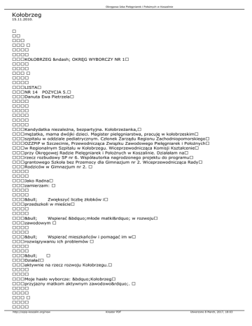 Okręgowa Izba Pielęgniarek i Położnych w Koszalinie Kołobrzeg 15.11.2010. KOŁOBRZEG – OKRĘG WYBORCZY NR 1 LISTA NR 14 POZYCJA 5. Danuta Ewa Pietrzela Kandydatka niezależna, bezpartyjna. Kołobrzeżanka, mężatka, mama dwójki dzieci. Magister pielęgniarstwa, pracuję w kołobrzeskim szpitalu w oddziale pediatrycznym. Członek Zarządu Regionu Zachodniopomorskiego OZZPiP w Szczecinie, Przewodnicząca Związku Zawodowego Pielęgniarek i Położnych w Regionalnym Szpitalu w Kołobrzegu. Wiceprzewodnicząca Komisji Kształcenie przy Okręgowej Radzie Pielęgniarek i Położnych w Koszalinie. Działałam na rzecz rozbudowy SP nr 6. Współautorka nagrodzonego projektu do programu grantowego Szkoła bez Przemocy dla Gimnazjum nr 2. Wiceprzewodnicząca Rady Rodziców w Gimnazjum nr 2. Jako Radna zamierzam: • Zwiększyć liczbę żłobków i przedszkoli w mieście • Wspierać „młode matki” w rozwoju zawodowym • Wspierać mieszkańców i pomagać im w rozwiązywaniu ich problemów • Działać aktywnie na rzecz rozwoju Kołobrzegu. Moje hasło wyborcze: „Kołobrzeg przyjazny matkom aktywnym zawodowo”. http://oipip-koszalin.org/new Kreator PDF Utworzono 8 March, 2017, 18:03 Okręgowa Izba Pielęgniarek i Położnych w Koszalinie KOŁOBRZEG - OKRĘG WYBORCZY NR 4 LISTA NR 14 POZYCJA 3. Lucyna Agnieszka Kamińska Bezpartyjna lat 39. Wykształcenie średnie. Od 20 lat pracuję jako pielęgniarka w kołobrzeskim szpitalu. Jestem mamą dwóch wspaniałych córek. Ania-studentka pedagogiki. Asia uczennica szkoły średniej tym samym problemy dzieci i młodzieży są mi bardzo bliskie. Od wielu lat działam społecznie. Jestem wiceprzewodniczącą rady osiedla Podczele. Prowadzę działalność charytatywną. Jako prezes Caritas współorganizuję festyny parafialne, imprezy okolicznościowe, a przede wszystkim pomagam potrzebującym. Przyszłość Kołobrzegu to myśl przewodnia mego działania. Chciałabym godnie reprezentować problemy mieszkańców oraz służby zdrowia. Mam wiele pomysłów na dalszy rozwój osiedla Podczele. Nawierzchnia dróg, droga dojazdowa, parkingi to wciąż priorytet działania radnego. Marzę też o stworzeniu świetlicy integracyjnej dla młodzieży, gdzie spędzałaby czas wolny i osób starszych aby czuły się potrzebne. Moja działalność i praca jest tym co lubię i czuję. Pomoc drugiemu człowiekowi to sens mojego życia KOŁOBRZEG – OKRĘG WYBORCZY NR 2 LISTA NR 14 POZYCJA 10. Elżbieta Magdalena Węgier Kołobrzeżanka lat 58 wykształcenie średnie. Pielęgniarka rodzinna - codziennie dociera do Państwa domów. Zna problemy zdrowotne i problemy życia codziennego zwykłych ludzi. Jest ławnikiem sądu rejonowego wydziału rodzinnego w Kołobrzegu - druga kadencja. Członek Rady Użytkowników Portu. Matka dwóch dorosłych córek - Ewy i Magdy. Największe osiągnięcia to wspaniała rodzina i dom do którego wszyscy wracają. W Radzie Miasta chcę reprezentować wszystkich ludzi, dbać o rozwój naszego miasta, wykorzystać jego potencjał turystyczny i uzdrowiskowy, tak aby nam - jego mieszkańcom żyło się lepiej. http://oipip-koszalin.org/new Kreator PDF Utworzono 8 March, 2017, 18:03 Okręgowa Izba Pielęgniarek i Położnych w Koszalinie Moje hasło: Kołobrzeg Miastem dla Wszystkich. http://oipip-koszalin.org/new Kreator PDF Utworzono 8 March, 2017, 18:03