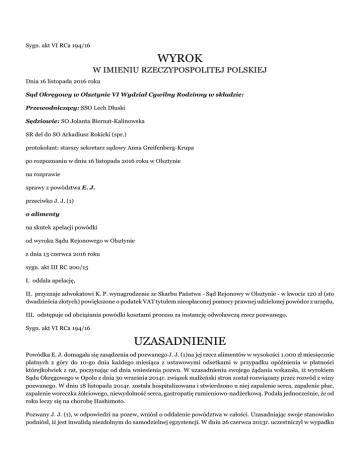 Sygn. akt VI RCa 194/16 WYROK W IMIENIU RZECZYPOSPOLITEJ POLSKIEJ Dnia 16 listopada 2016 roku Sąd Okręgowy w Olsztynie VI Wydział Cywilny Rodzinny w składzie: Przewodniczący: SSO Lech Dłuski Sędziowie: SO Jolanta Biernat-Kalinowska SR del do SO Arkadiusz Rokicki (spr.) protokolant: starszy sekretarz sądowy Anna Greifenberg-Krupa po rozpoznaniu w dniu 16 listopada 2016 roku w Olsztynie na rozprawie sprawy z powództwa E. J. przeciwko J. J. (1) o alimenty na skutek apelacji powódki od wyroku Sądu Rejonowego w Olsztynie z dnia 13 czerwca 2016 roku sygn. akt III RC 200/15 I. oddala apelację, II. przyznaje adwokatowi K. P. wynagrodzenie ze Skarbu Państwa - Sąd Rejonowy w Olsztynie - w kwocie 120 zł (sto dwadzieścia złotych) powiększone o podatek VAT tytułem nieopłaconej pomocy prawnej udzielonej powódce z urzędu, III. odstępuje od obciążania powódki kosztami procesu za instancję odwoławczą rzecz pozwanego. Sygn. akt VI RCa 194/16 UZASADNIENIE Powódka E. J. domagała się zasądzenia od pozwanego J. J. (1)na jej rzecz alimentów w wysokości 1.000 zł miesięcznie płatnych z góry do 10-go dnia każdego miesiąca z ustawowymi odsetkami w przypadku opóźnienia w płatności którejkolwiek z rat, poczynając od dnia wniesienia pozwu. W uzasadnieniu swojego żądania wskazała, iż wyrokiem Sądu Okręgowego w Opolu z dnia 30 września 2014r. związek małżeński stron został rozwiązany przez rozwód z winy pozwanego. W dniu 18 listopada 2014r. została hospitalizowana i stwierdzono u niej zapalenie serca, zapalenie płuc, zapalenie woreczka żółciowego, niewydolność serca, gastropatię rumieniowo-nadżerkową. Podała jednocześnie, że od roku leczy się na chorobę Hashimoto. Pozwany J. J. (1), w odpowiedzi na pozew, wniósł o oddalenie powództwa w całości. Uzasadniając swoje stanowisko podniósł, iż jest inwalidą niezdolnym do samodzielnej egzystencji. W dniu 26 czerwca 2013r. uczestniczył w wypadku drogowym, konsekwencją którego było przerwanie ciągłości kanału kręgowego, prowadzące do porażenia kończyn dolnych i nieodwracalnego zaniku czucia na odcinku od pępka w dół. Powyższy uraz spowodował konieczność korzystania z wózka inwalidzkiego oraz pomocy osób trzecich przy wykonywaniu najprostszych czynności życia codziennego. Prowadzona rehabilitacja musiała zostać przerwana z uwagi na ujawnienie zakrzepicy żył głębokich i bezpośrednie zagrożenie dla jego życia. Pozwany choruje również na posocznicę gronkowcową. Musi pozostawać pod regularną kontrolą specjalistycznych poradni oraz przyjmować na stałe odpowiednie leki. Z uwagi na doznany uszczerbek na zdrowiu, nie ma możliwości podjęcia jakiejkolwiek pracy, a także odmówiono mu prawa do renty. Pobiera świadczenie przyznane przez Sąd w postępowaniu zabezpieczającym od ubezpieczyciela, które w całości jest przeznaczane na kontynuowanie leczenia i codzienne utrzymanie. Sąd Rejonowy w Olsztynie wyrokiem z dnia 13 czerwca 2016r. powództwo oddalił i odstąpił od obciążania powódki kosztami procesu. Sąd ten ustalił, że strony pozostawały w związku małżeńskim, który wyrokiem Sądu Okręgowego w Opolu z dnia 30 września 2014r. w sprawie I RC 1145/14 został rozwiązany przez rozwód z winy pozwanego. Orzeczenie to nie zawierało rozstrzygnięcia w przedmiocie alimentów z uwagi na cofnięcie przez powódkę tego żądania. Strony mieszkały razem do maja 2012r., kiedy to powódka wyprowadziła się od pozwanego do O.. W czasie orzekania rozwodu E. J. była osobą bezrobotną, bez prawa do zasiłku. Posiadała trzecią grupę inwalidztwa i korzystała z pomocy społecznej w formie zasiłków. Od 18 listopada 2014r. leczyła się w związku z niewydolnością serca. Pozwany J. J. (1) prowadził wówczas własną działalność gospodarczą w zakresie spawalnictwa. Osiągał dochody w wysokości ok. 3.000-3.500 zł. W wyniku urazu jakiego doznał w dniu 25 czerwca 2013r. doszło u niego do przerwania ciągłości kanału kręgowego poprzez całkowite zamknięcie kanału kręgowego od dołu przez fragmenty złamanego trzonu, prowadzące do porażenia kończyn dolnych i nieodwracalnego zaniku czucia na odcinku od pępka w dół. Powyższy uraz spowodował konieczność korzystania z wózka inwalidzkiego oraz pomocy osób trzecich przy wykonywaniu najprostszych czynności życia codziennego. Pozwany uzyskał decyzję o całkowitej niezdolności do pracy i niezdolności do samodzielnej egzystencji. Wymagał pomocy osoby trzeciej przy codziennych obowiązkach. Nie uzyskał renty z uwagi na zbyt krótki staż pracy. Obecnie powódka nadal nie pracuje. Posiada uprawnienia w zawodzie ubezpieczyciela oraz opiekunki osób starszych i niepełnosprawnych. Do końca marca 2016r. miała orzeczoną całkowitą niezdolność do pracy. Nie została przyznana jej renta z tytułu niezdolności do pracy w związku z brakiem 5-letniego okresu zatrudnienia w ostatnim dziesięcioleciu przed dniem złożenia wniosku o świadczenie rentowe. Utrzymuje się z zasiłków pomocy społecznej. Otrzymuje zasiłki celowe z Miejskiego Ośrodka Pomocy Społecznej w wysokości 500 zł. Obecnie zamieszkuje w O. w mieszkaniu komunalnym o powierzchni 19 m2. Z dokumentacji medycznej wynika, iż zdiagnozowano u niej zapalenie mięśnia sercowego, zapalenie płuc, zapalenie woreczka żółciowego, niewydolność serca, gastropatię rumieniowonadżerkową dużego stopnia, chorobę Hashimoto. Powódka leczy się na liczne schorzenia i jest pod stałą opieką lekarzy, m.in. pulmonologa i kardiologa. Pozwany J. J. (1) jest całkowicie niezdolny do pracy oraz niezdolny do samodzielnej egzystencji od dnia wypadku, czyli od dnia 25 czerwca 2013r. Całkowita niezdolność do pracy oraz niezdolność do samodzielnej egzystencji pozostają w związku ze stanem narządu ruchu. Pozwany uległ wypadkowi i porusza się na wózku inwalidzkim. W wyniku następstw przebytego wypadku nie jest w stanie