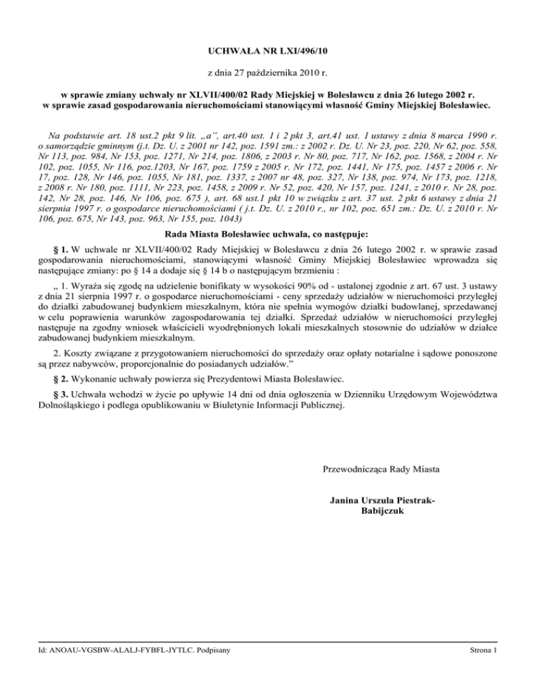 UCHWAŁA NR LXI/496/10 z dnia 27 października 2010 r. w sprawie zmiany uchwały nr XLVII/400/02 Rady Miejskiej w Bolesławcu z dnia 26 lutego 2002 r. w sprawie zasad gospodarowania nieruchomościami stanowiącymi własność Gminy Miejskiej Bolesławiec. Na podstawie art. 18 ust.2 pkt 9 lit. „a”, art.40 ust. 1 i 2 pkt 3, art.41 ust. 1 ustawy z dnia 8 marca 1990 r. o samorządzie gminnym (j.t. Dz. U. z 2001 nr 142, poz. 1591 zm.: z 2002 r. Dz. U. Nr 23, poz. 220, Nr 62, poz. 558, Nr 113, poz. 984, Nr 153, poz. 1271, Nr 214, poz. 1806, z 2003 r. Nr 80, poz. 717, Nr 162, poz. 1568, z 2004 r. Nr 102, poz. 1055, Nr 116, poz.1203, Nr 167, poz. 1759 z 2005 r. Nr 172, poz. 1441, Nr 175, poz. 1457 z 2006 r. Nr 17, poz. 128, Nr 146, poz. 1055, Nr 181, poz. 1337, z 2007 nr 48, poz. 327, Nr 138, poz. 974, Nr 173, poz. 1218, z 2008 r. Nr 180, poz. 1111, Nr 223, poz. 1458, z 2009 r. Nr 52, poz. 420, Nr 157, poz. 1241, z 2010 r. Nr 28, poz. 142, Nr 28, poz. 146, Nr 106, poz. 675 ), art. 68 ust.1 pkt 10 w związku z art. 37 ust. 2 pkt 6 ustawy z dnia 21 sierpnia 1997 r. o gospodarce nieruchomościami ( j.t. Dz. U. z 2010 r., nr 102, poz. 651 zm.: Dz. U. z 2010 r. Nr 106, poz. 675, Nr 143, poz. 963, Nr 155, poz. 1043) Rada Miasta Bolesławiec uchwala, co następuje: § 1. W uchwale nr XLVII/400/02 Rady Miejskiej w Bolesławcu z dnia 26 lutego 2002 r. w sprawie zasad gospodarowania nieruchomościami, stanowiącymi własność Gminy Miejskiej Bolesławiec wprowadza się następujące zmiany: po § 14 a dodaje się § 14 b o następującym brzmieniu : „ 1. Wyraża się zgodę na udzielenie bonifikaty w wysokości 90% od - ustalonej zgodnie z art. 67 ust. 3 ustawy z dnia 21 sierpnia 1997 r. o gospodarce nieruchomościami - ceny sprzedaży udziałów w nieruchomości przyległej do działki zabudowanej budynkiem mieszkalnym, która nie spełnia wymogów działki budowlanej, sprzedawanej w celu poprawienia warunków zagospodarowania tej działki. Sprzedaż udziałów w nieruchomości przyległej następuje na zgodny wniosek właścicieli wyodrębnionych lokali mieszkalnych stosownie do udziałów w działce zabudowanej budynkiem mieszkalnym. 2. Koszty związane z przygotowaniem nieruchomości do sprzedaży oraz opłaty notarialne i sądowe ponoszone są przez nabywców, proporcjonalnie do posiadanych udziałów.” § 2. Wykonanie uchwały powierza się Prezydentowi Miasta Bolesławiec. § 3. Uchwała wchodzi w życie po upływie 14 dni od dnia ogłoszenia w Dzienniku Urzędowym Województwa Dolnośląskiego i podlega opublikowaniu w Biuletynie Informacji Publicznej. Przewodnicząca Rady Miasta Janina Urszula PiestrakBabijczuk Id: ANOAU-VGSBW-ALALJ-FYBFL-JYTLC. Podpisany Strona 1 Uzasadnienie Zmiana uchwały w sprawie zasad gospodarowania nieruchomościami, stanowiącymi własność Gminy Miejskiej Bolesławiec ma na celu poprawę zagospodarowania nieruchomości zabudowanych budynkami z wyodrębnionymi lokalami mieszkalnymi. Znaczna część tak zabudowanych nieruchomości została sprzedana po obrysie budynków. Proponowana uchwała nie dotyczy przypadków określonych w art. 209 a ustawy o gospodarce nieruchomościami, który reguluje podobne sytuacje, lecz dotyczy przypadków, gdy w budynku mieszkalnym zostały sprzedane wszystkie lokale a Gmina nie ma w nim żadnych udziałów. Niniejsza zmiana umożliwi zbywanie sąsiednich nieruchomości bez konieczności uprzedniego zbycia przez Gminę Miejską wszystkich lokali w budynku mieszkalnym, co umożliwi realizację postulatów właścicieli mieszkań, dotyczących nabywania gruntów przyległych do nieruchomości. Projekt uchwały przewiduje możliwość udzielenia bonifikaty, która zachęci i ułatwi nabywanie gruntów przez właścicieli lokali mieszkalnych i jednocześnie wpłynie na poprawienie warunków zarządzania nieruchomościami. PM/PM Id: ANOAU-VGSBW-ALALJ-FYBFL-JYTLC. Podpisany Strona 1